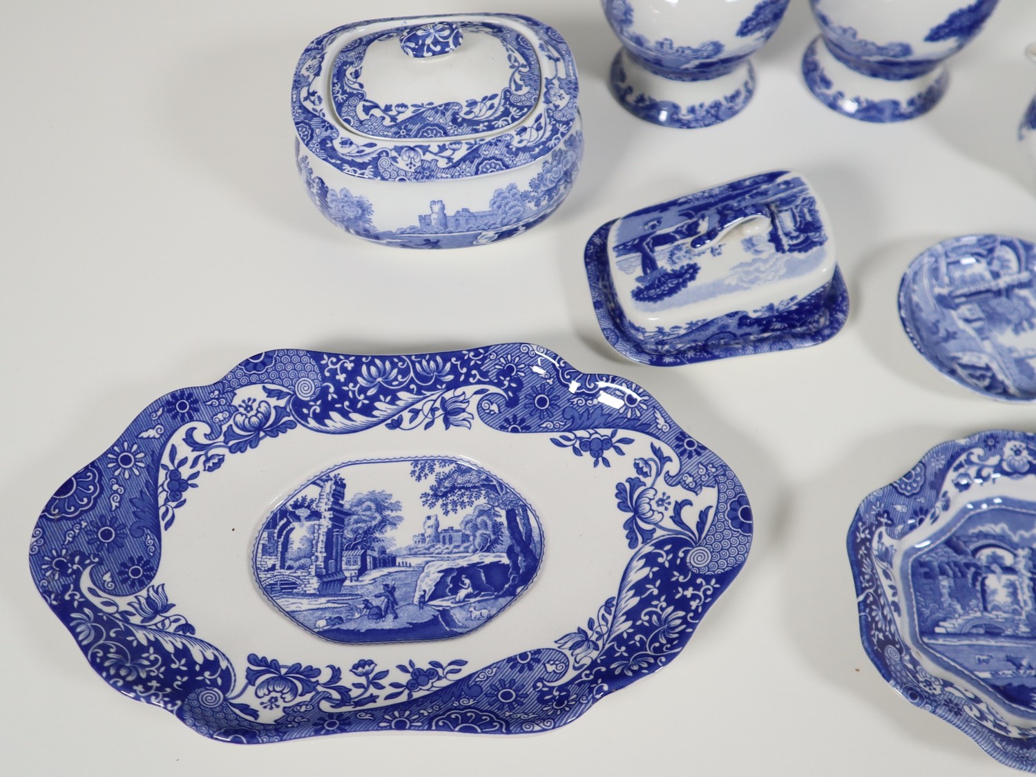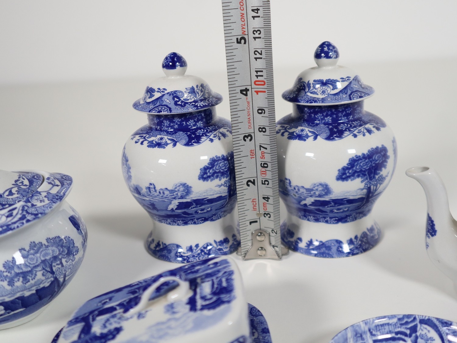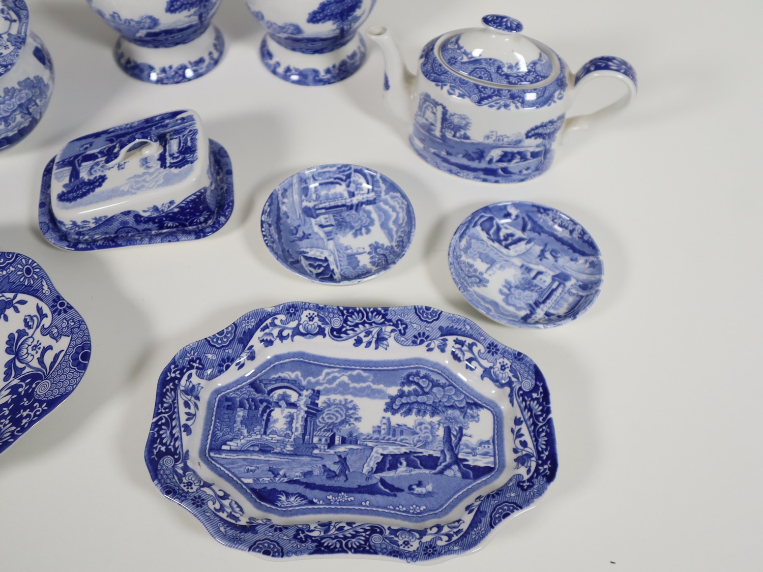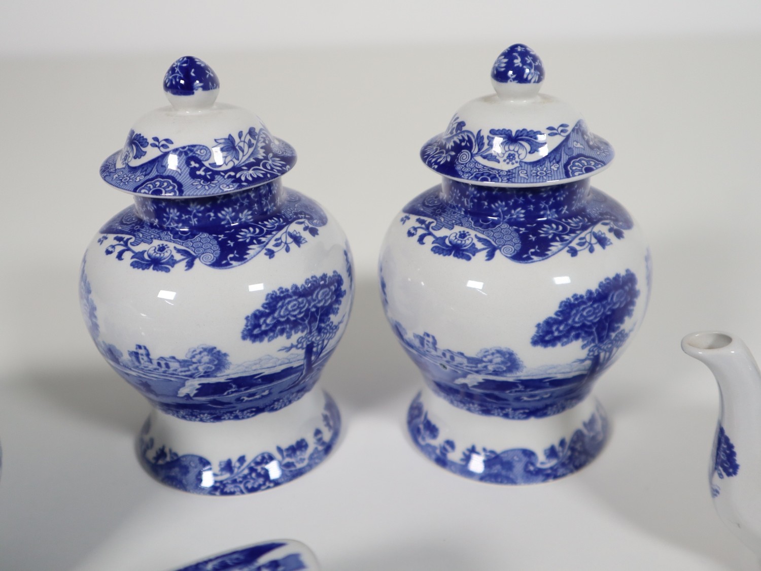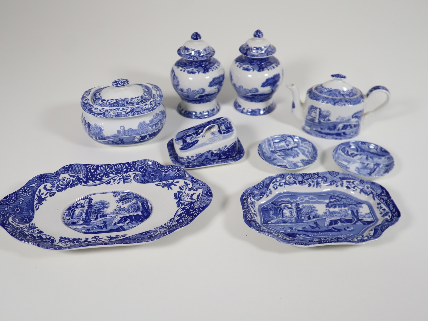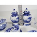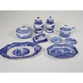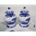 A collection of smaller scale Spode includes pair of ginger jar, cheese dish, tea pot, lidded jar and trays Italian Spode Design c1816 Blue & White late 20th century