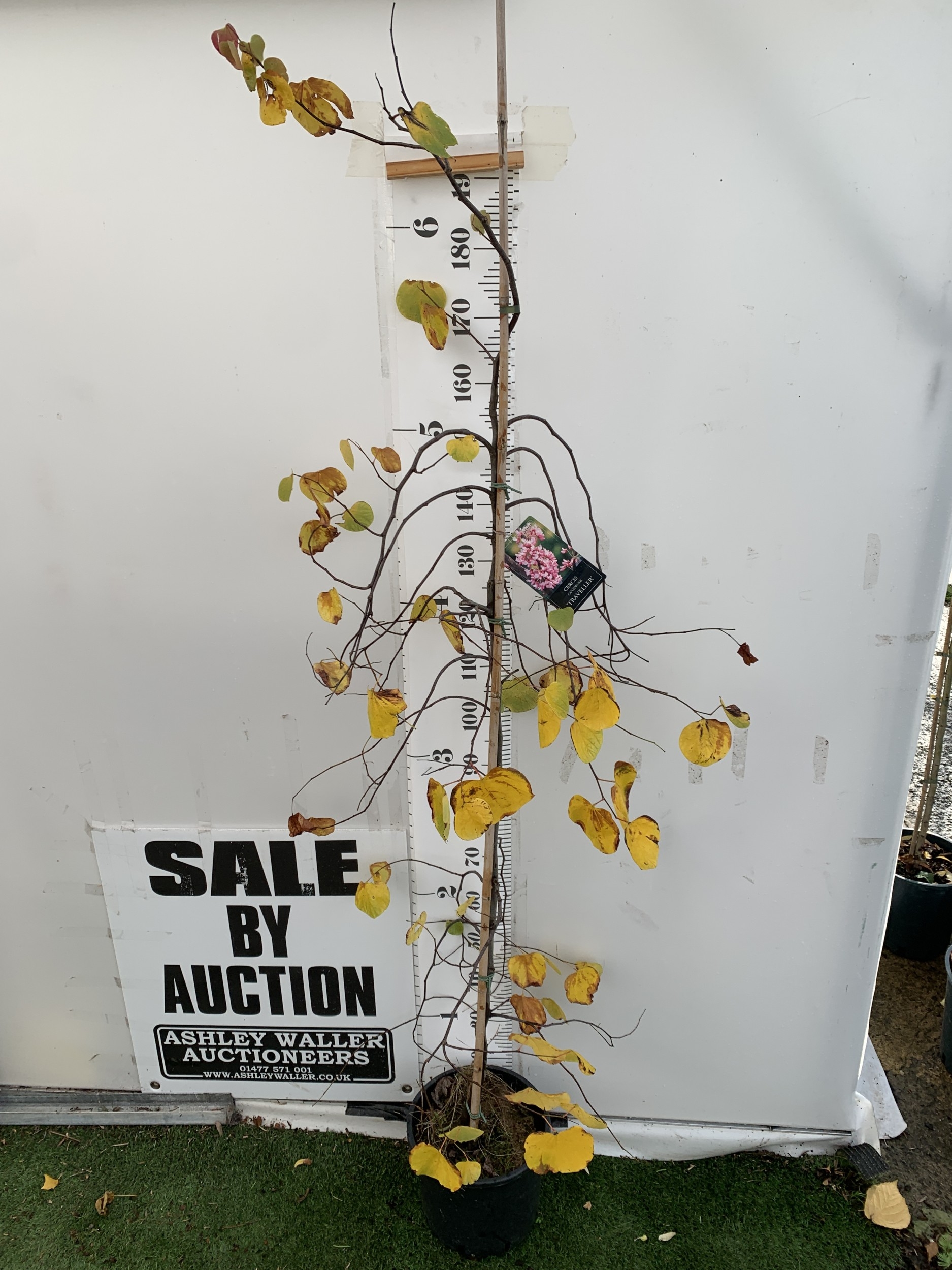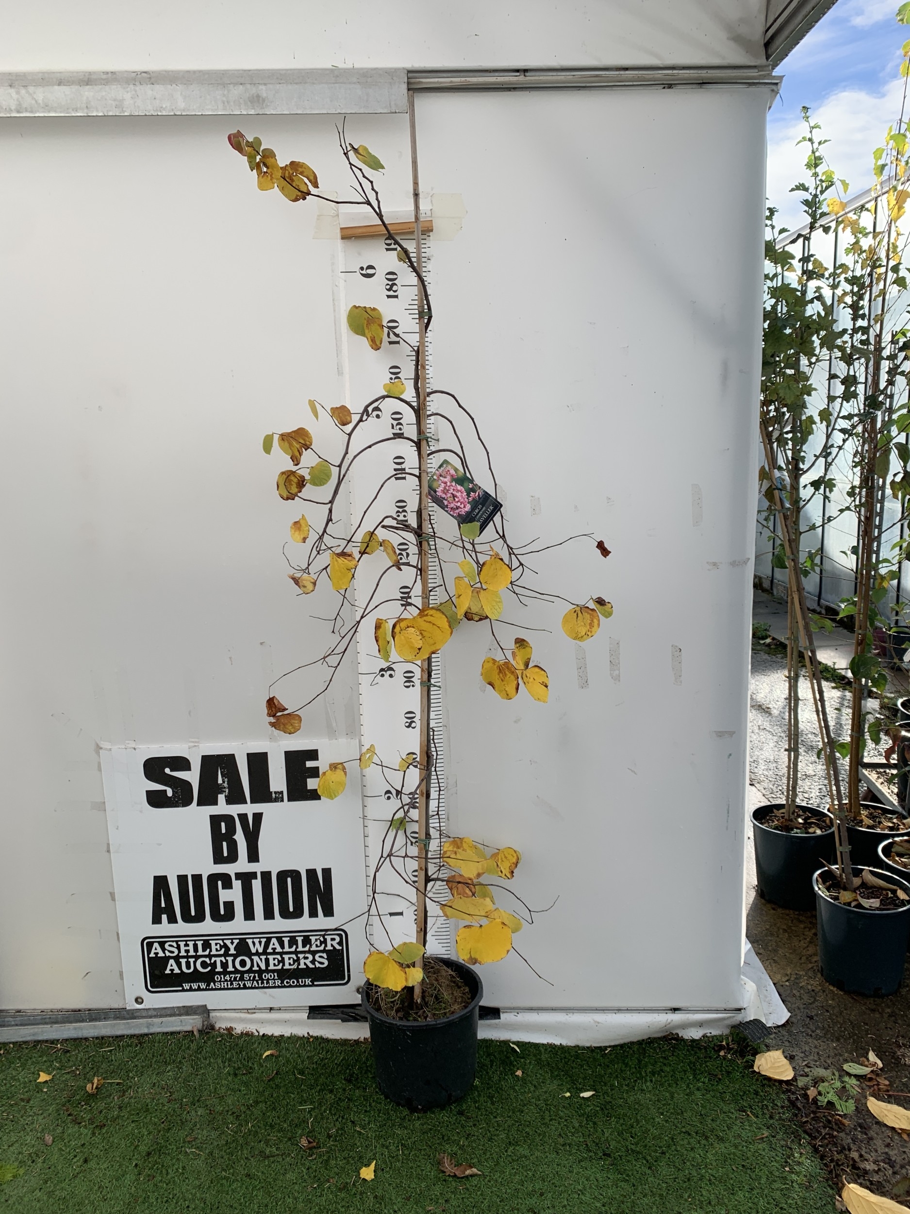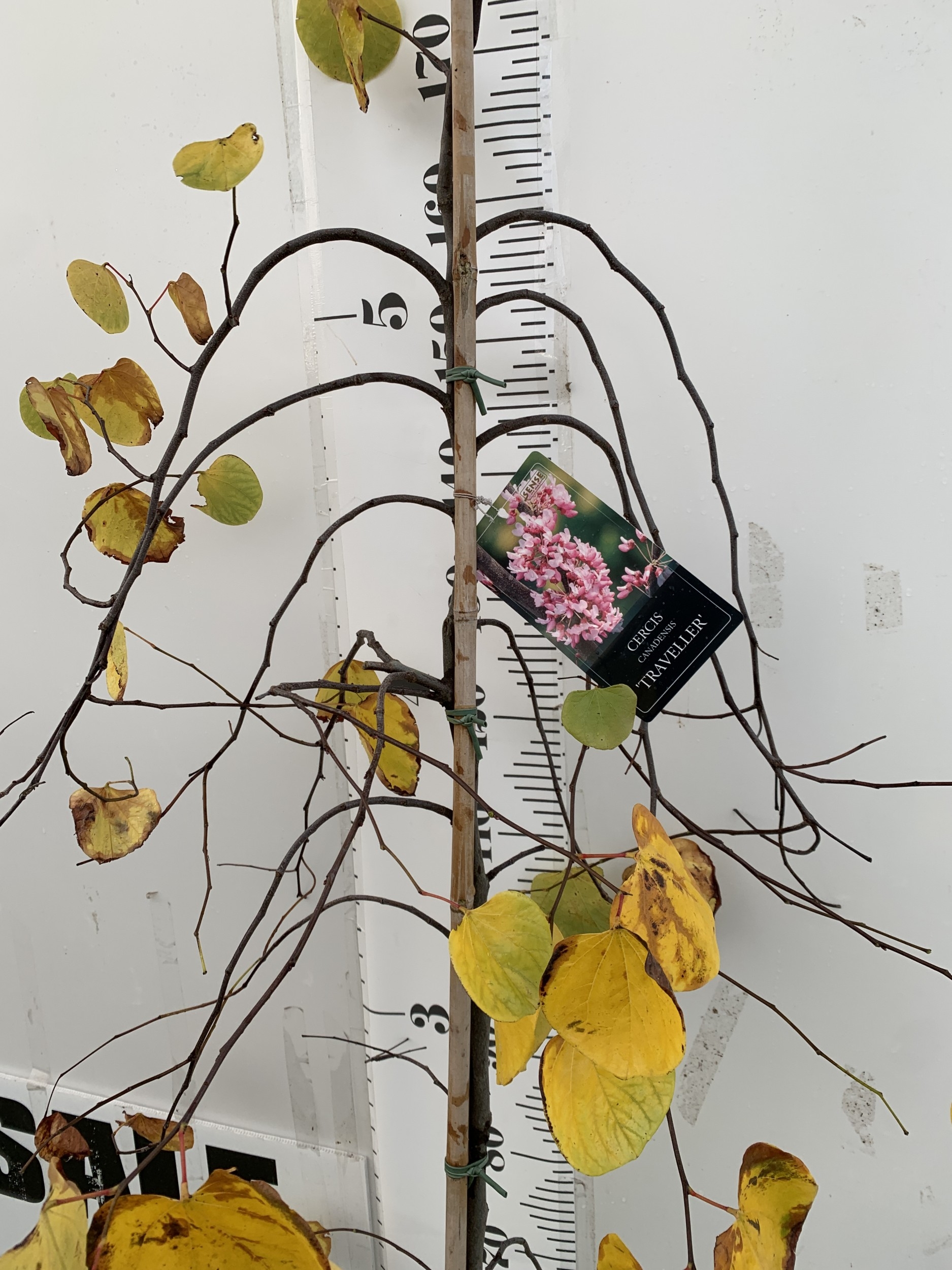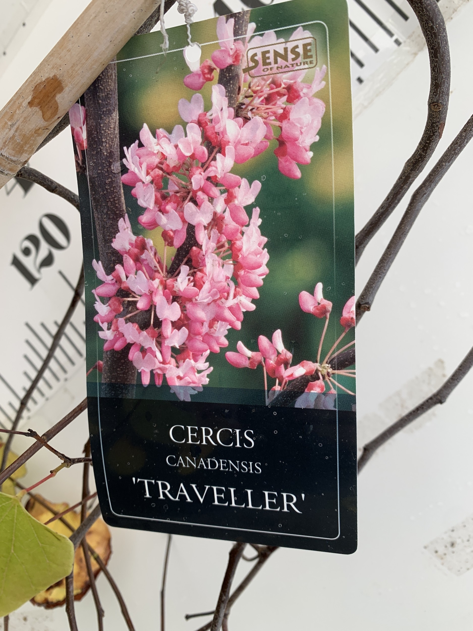 ONE CERCIS CANADENSIS 'TRAVELLER', A WEEPING EASTERN REDBUD THAT PRODUCES A YEAR ROUND DISPLAY. IN EARLY SPRING AND LATE WINTER HAS VIBRANT FUCHSIA-PINK FLOWERS IN CLUSTERS. FOLLOWED BY COPPERY HEART SHAPED LEAVES, FEATHERED STRUCTURE WHICH GIVES A BUSHIER APPEARANCE. IN A 10 LTR POT, APPROX 2 METRES IN HEIGHT.