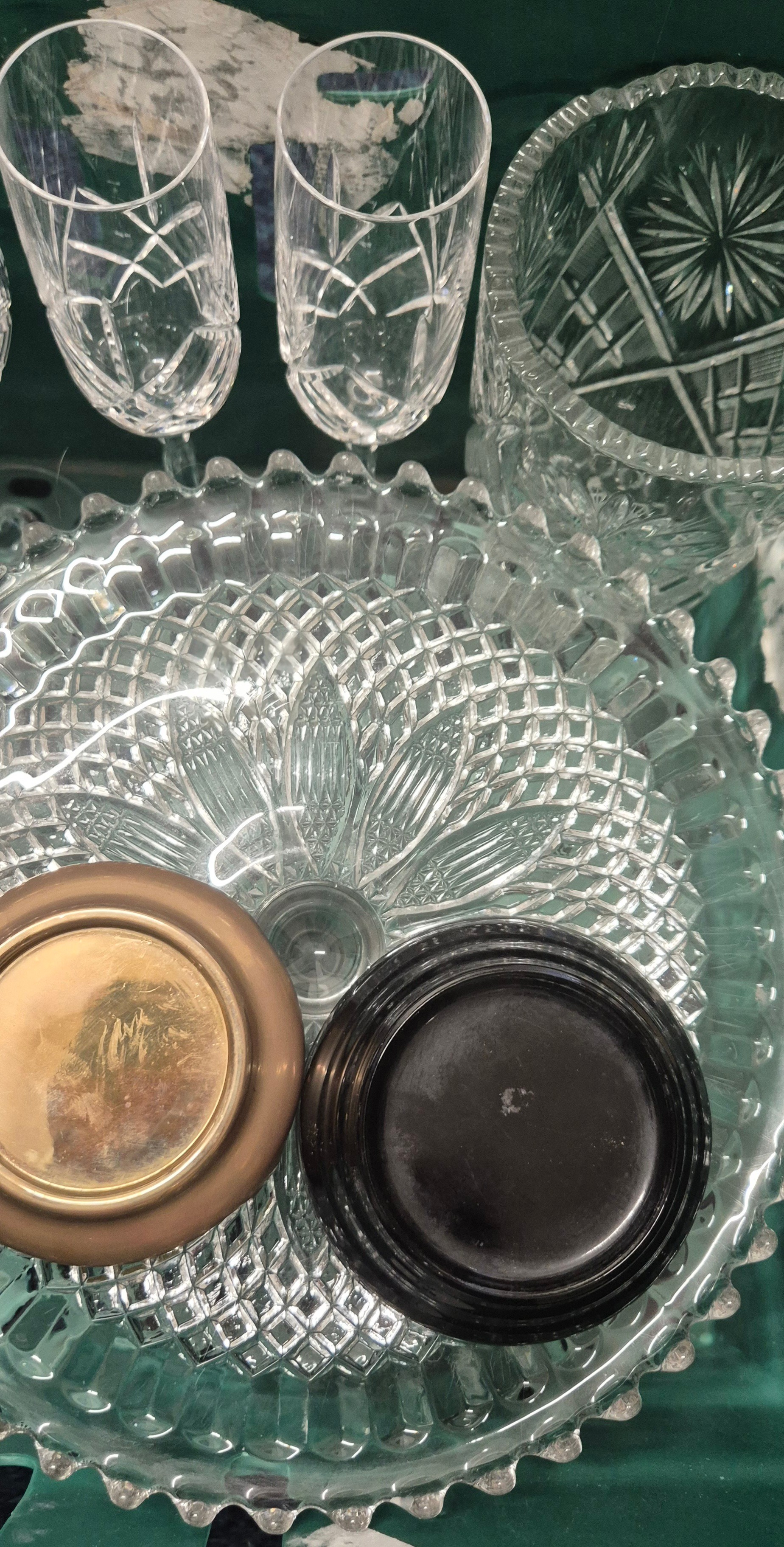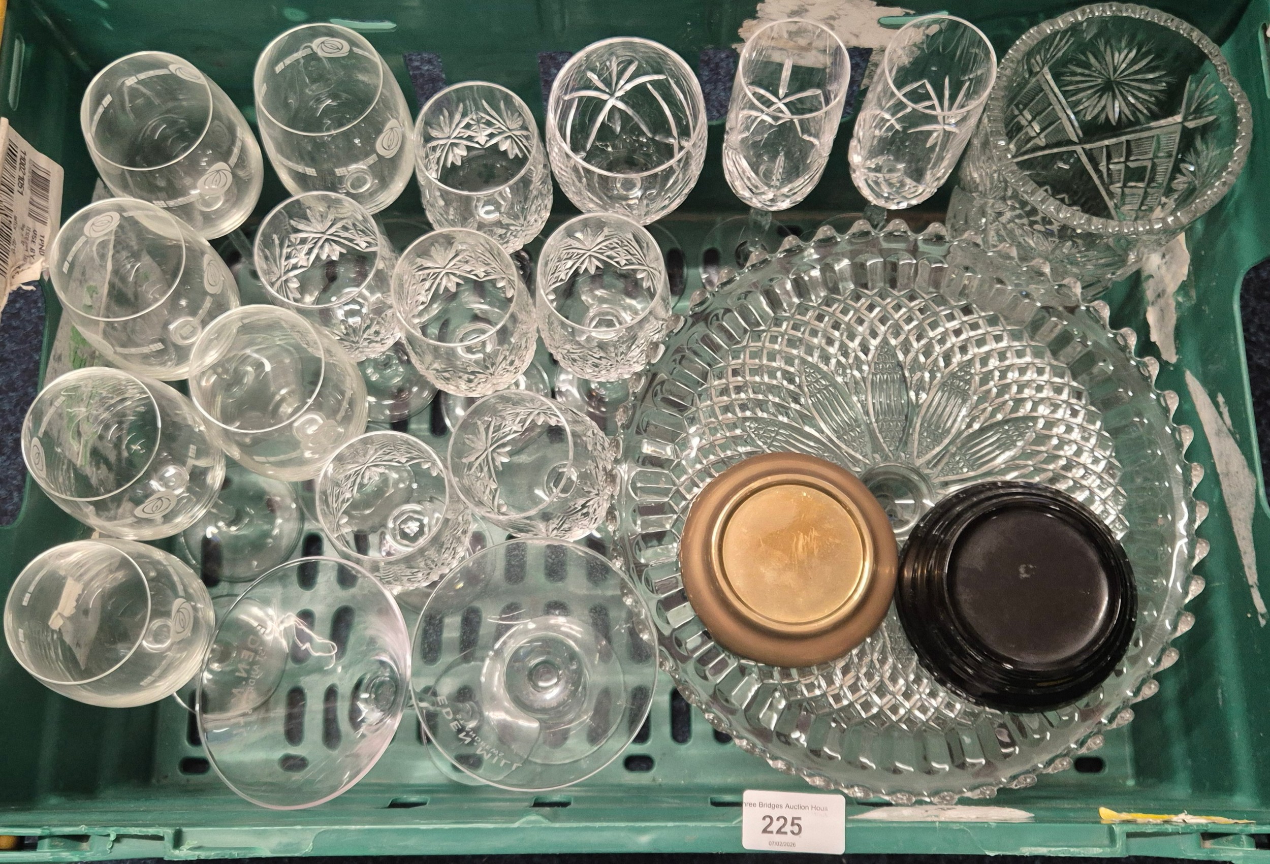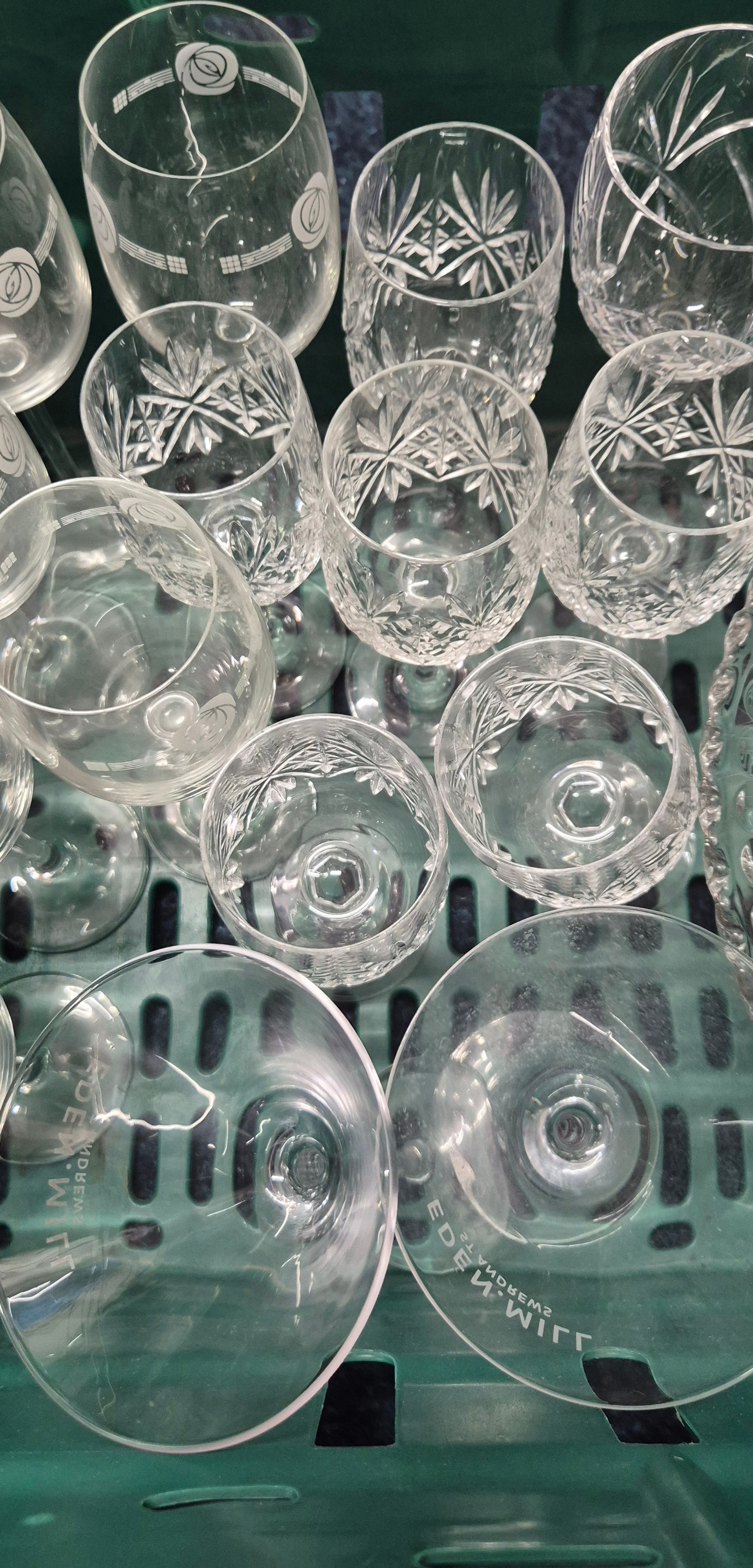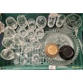Crate of Crystal ware; Rennie Macintosh glasses, crystal vase, cocktail glasses and crystal glasses.