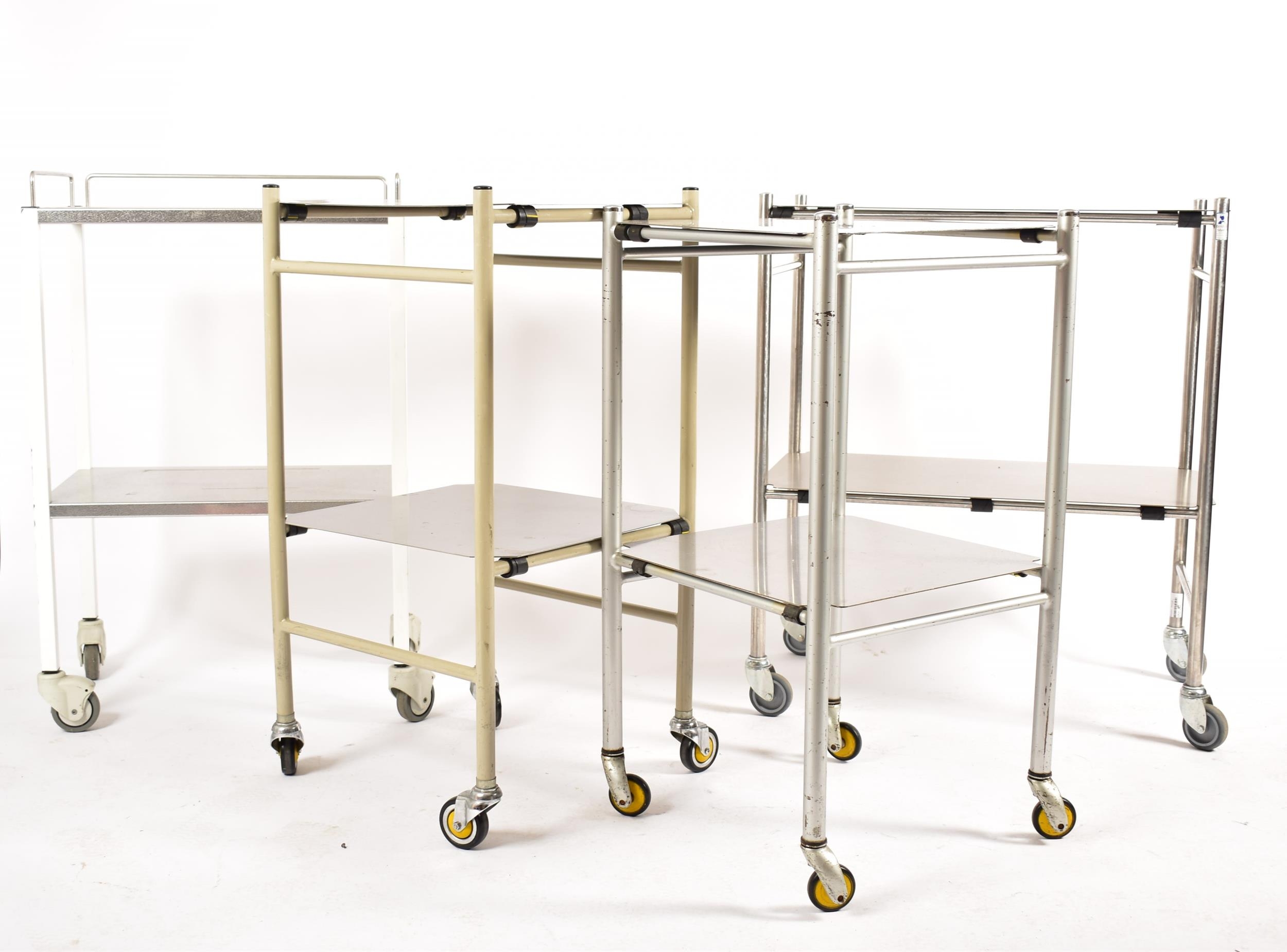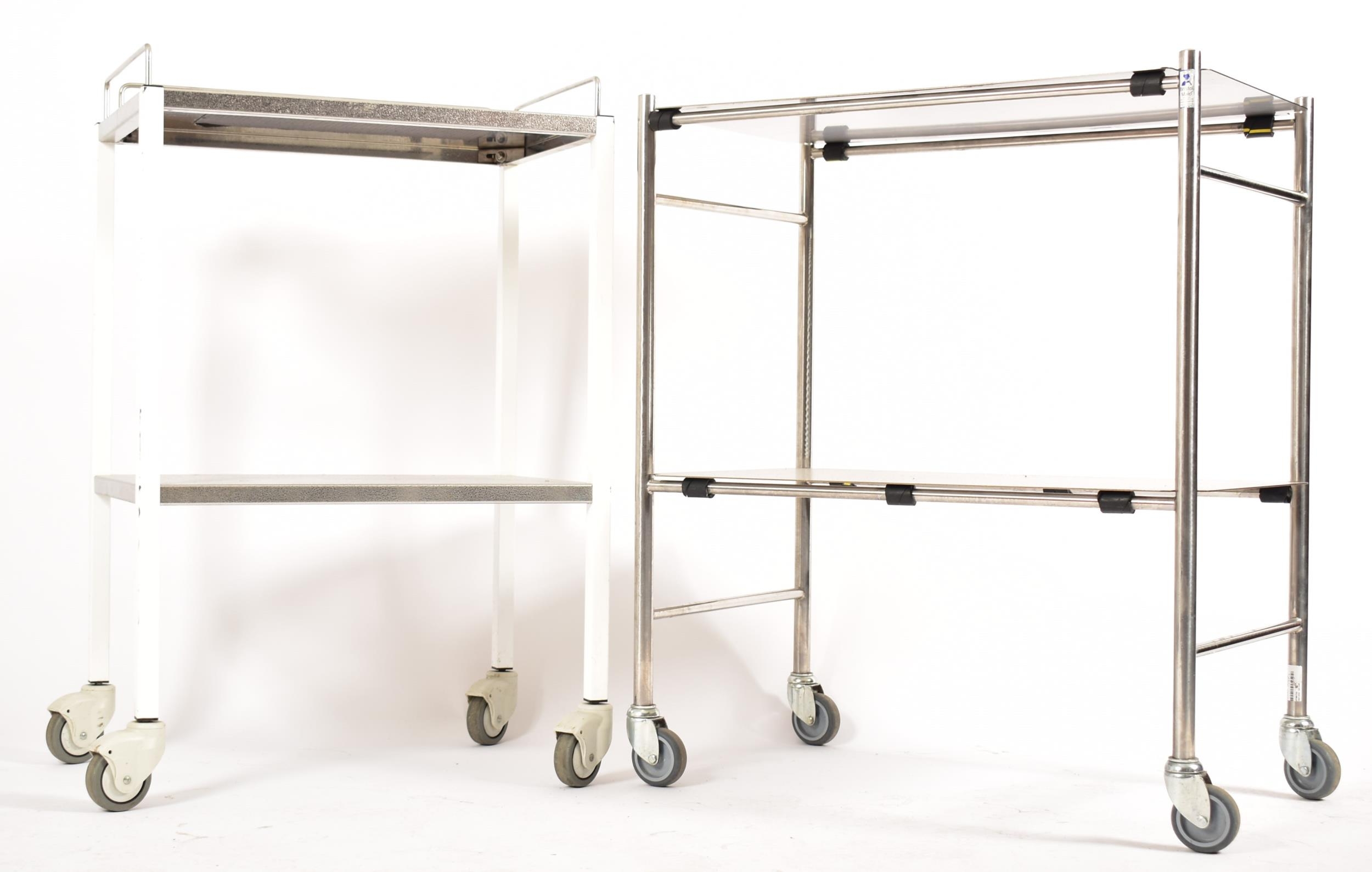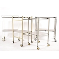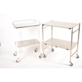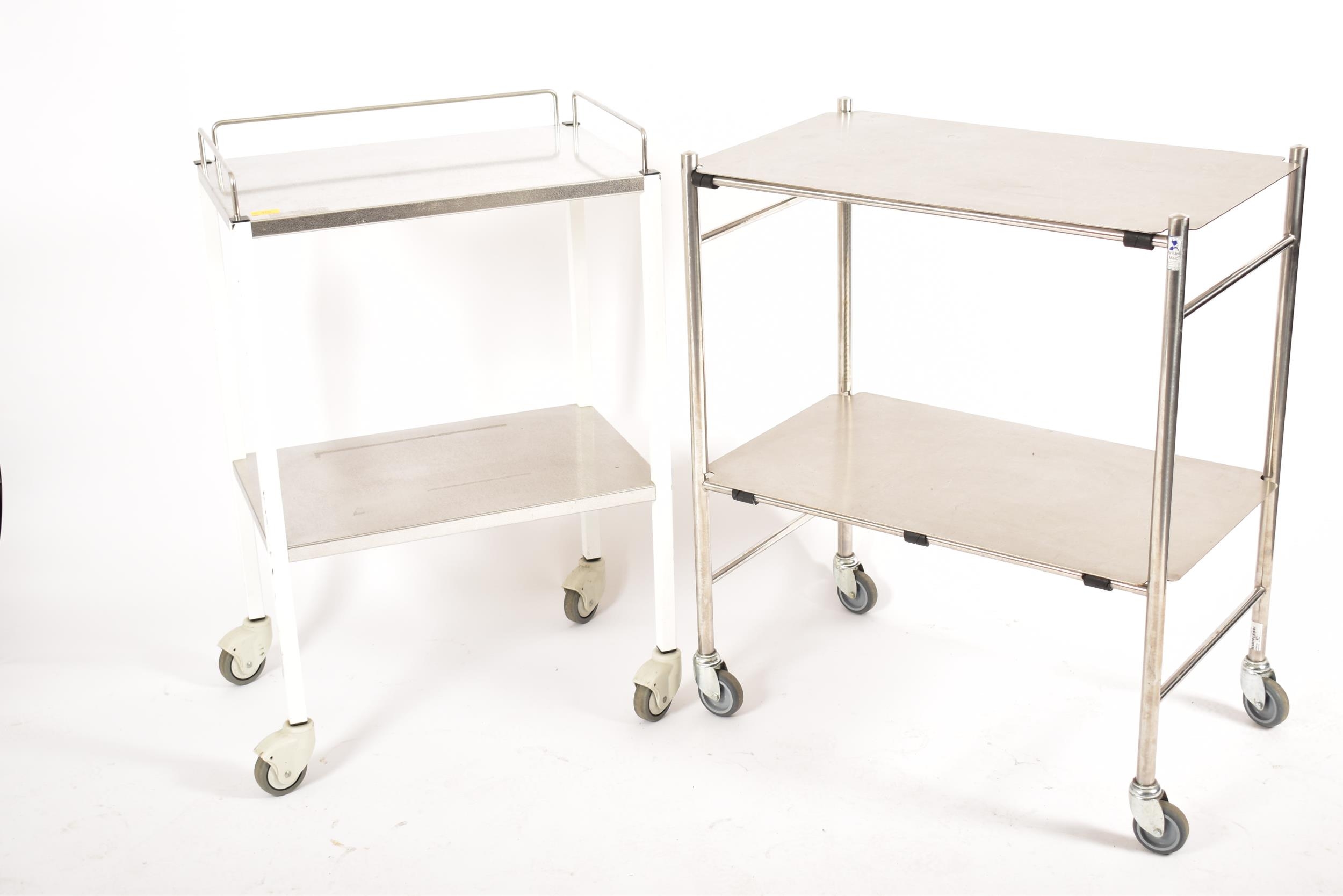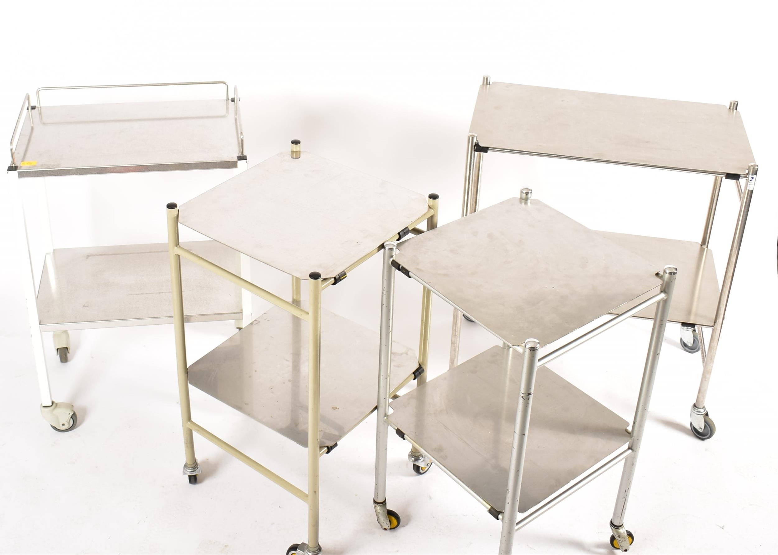 A selection of four 20th century stainless steel medical / hospital trolleys. One trolley having two drawers to the top, two matching two tier examples and one other larger two tier trolley. All raised on castor wheels. Largest measures approx. 91cm x 60cm x 40cm.