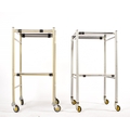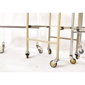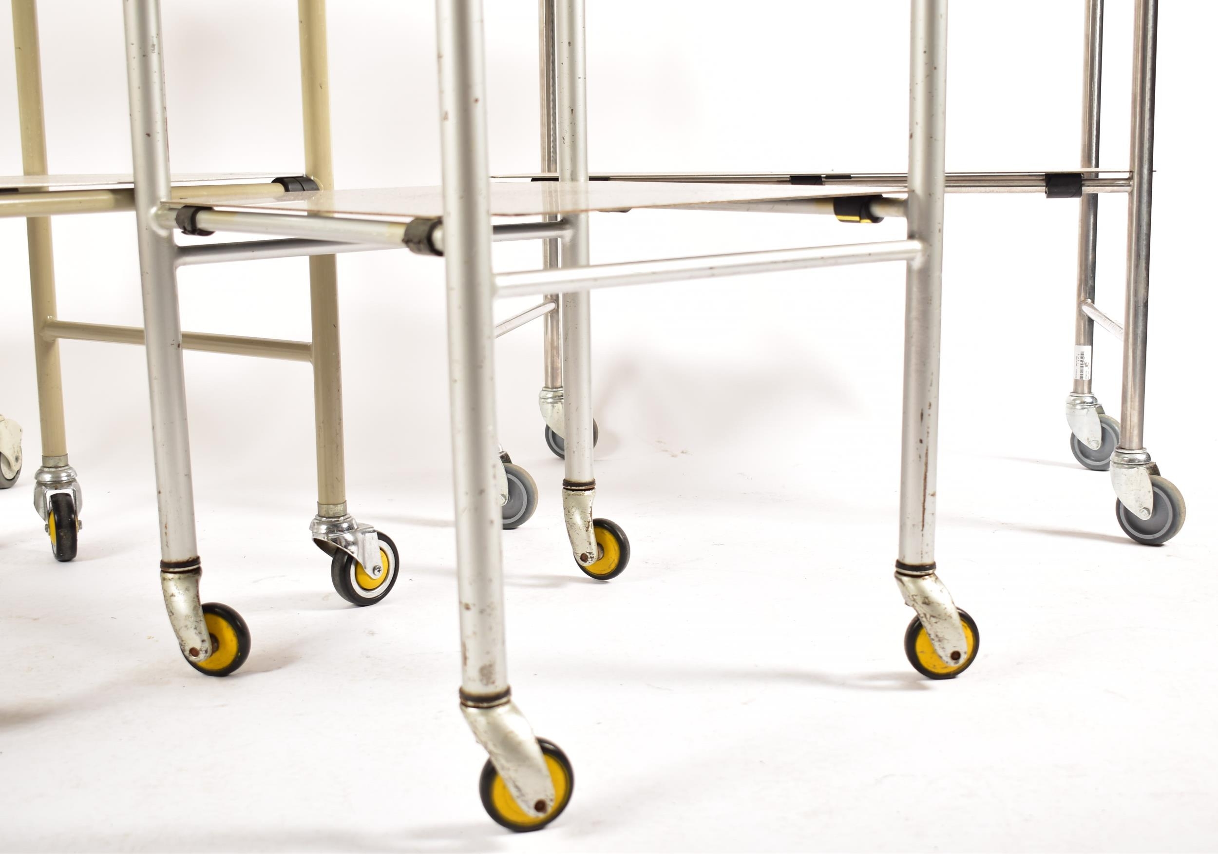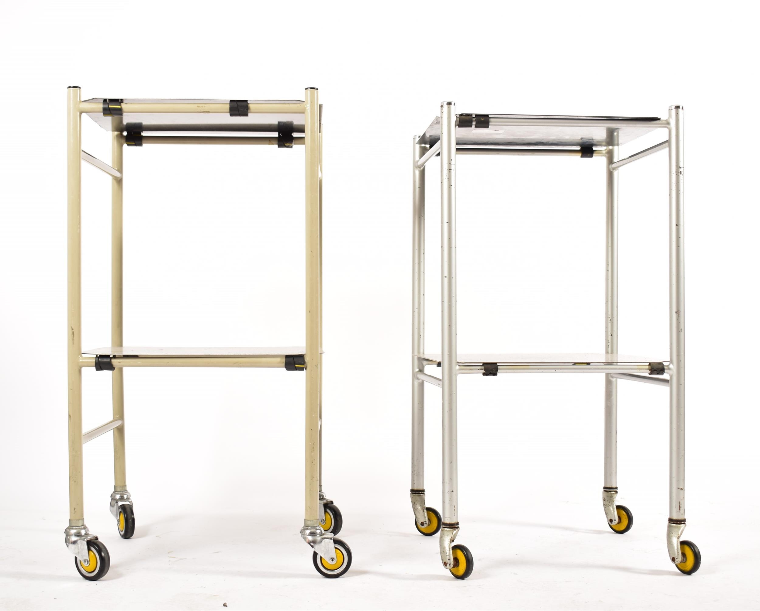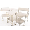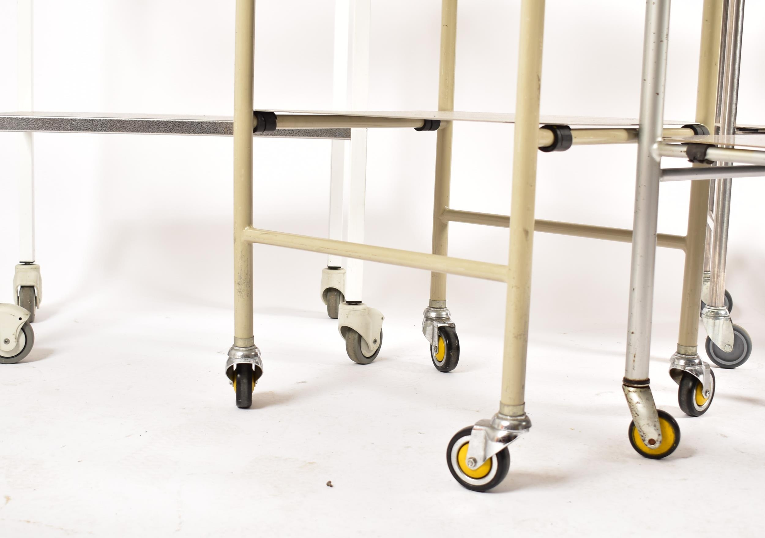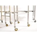 A selection of four 20th century stainless steel medical / hospital trolleys. One trolley having two drawers to the top, two matching two tier examples and one other larger two tier trolley. All raised on castor wheels. Largest measures approx. 91cm x 60cm x 40cm.