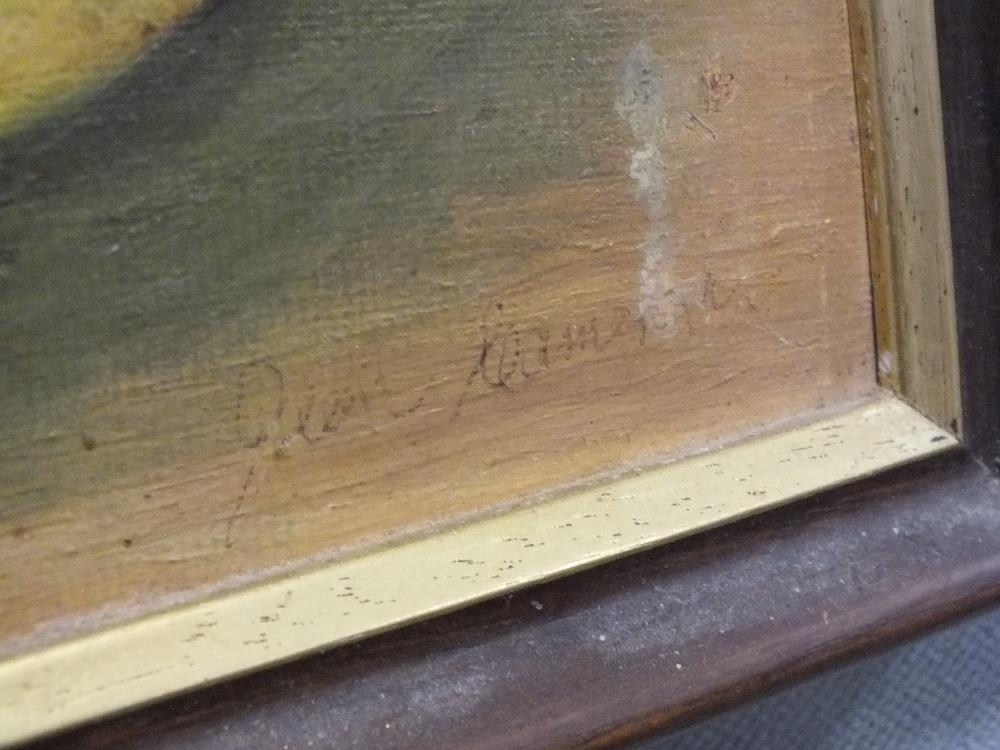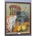 A FRAMED OIL ON BOARD STILL LIFE STUDY OF A TABLE TOP SCENE INDISTINCTLY SIGNED LOWER RIGHT