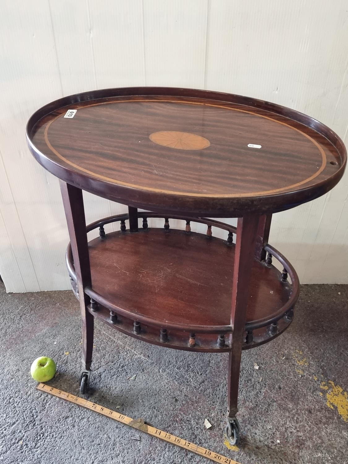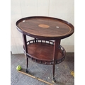 A Vintage 2 Tier Wooden Drinks Table with Attractive Inlay on Castors.