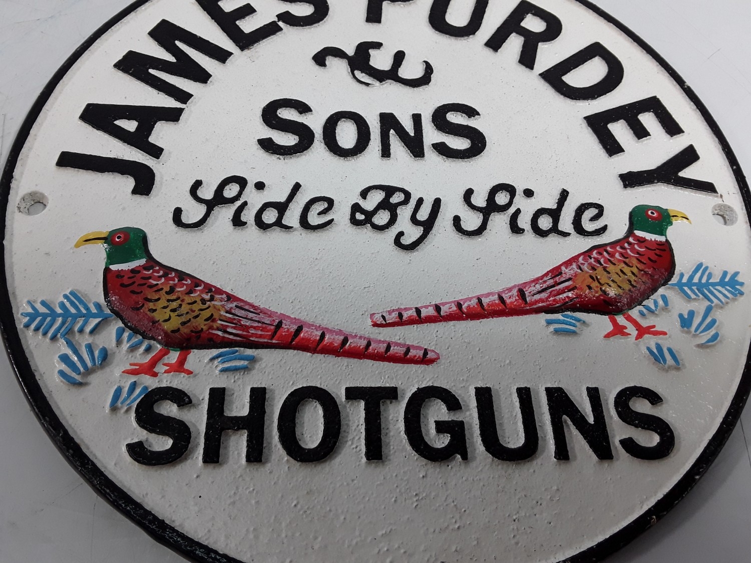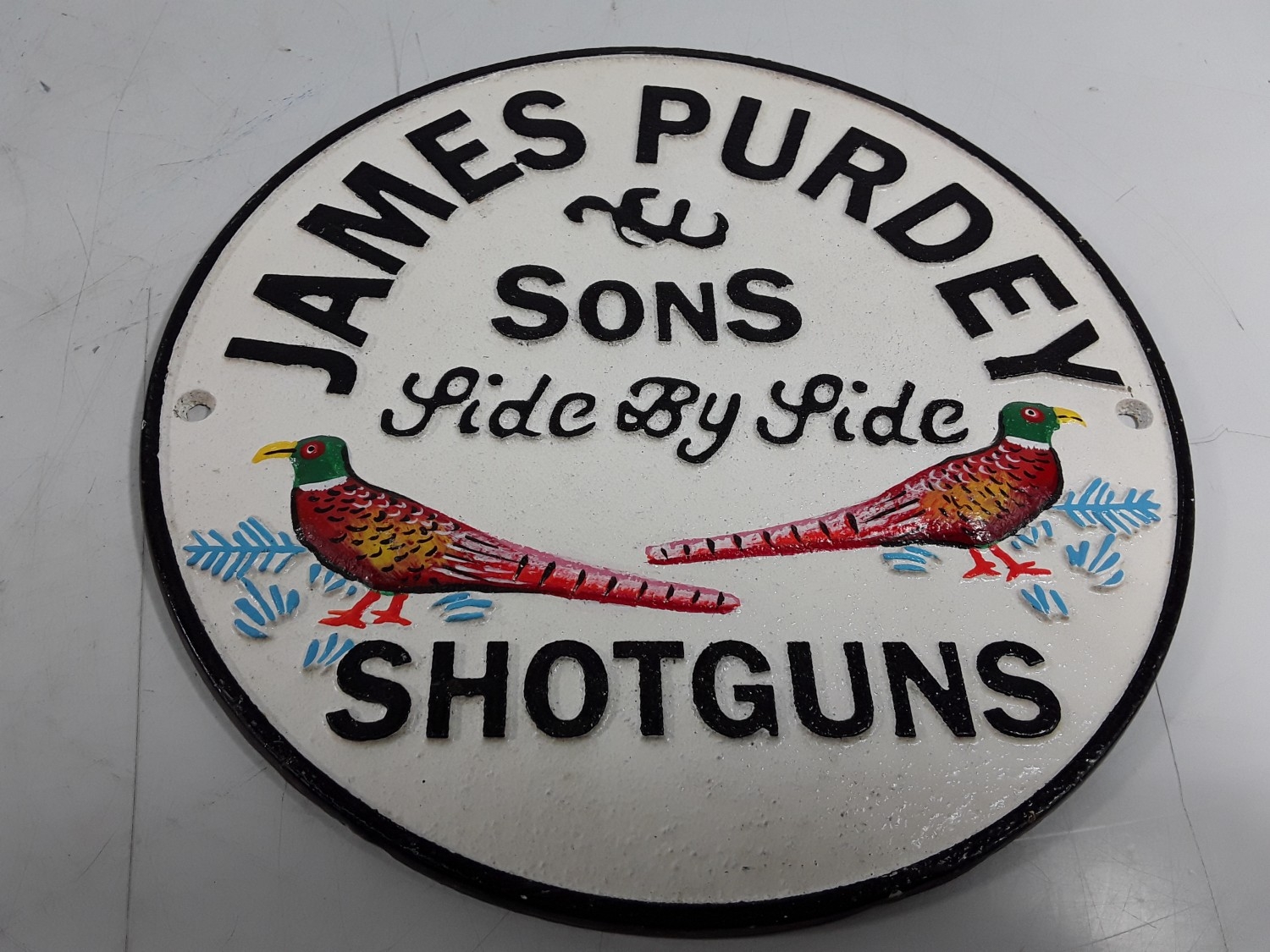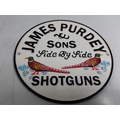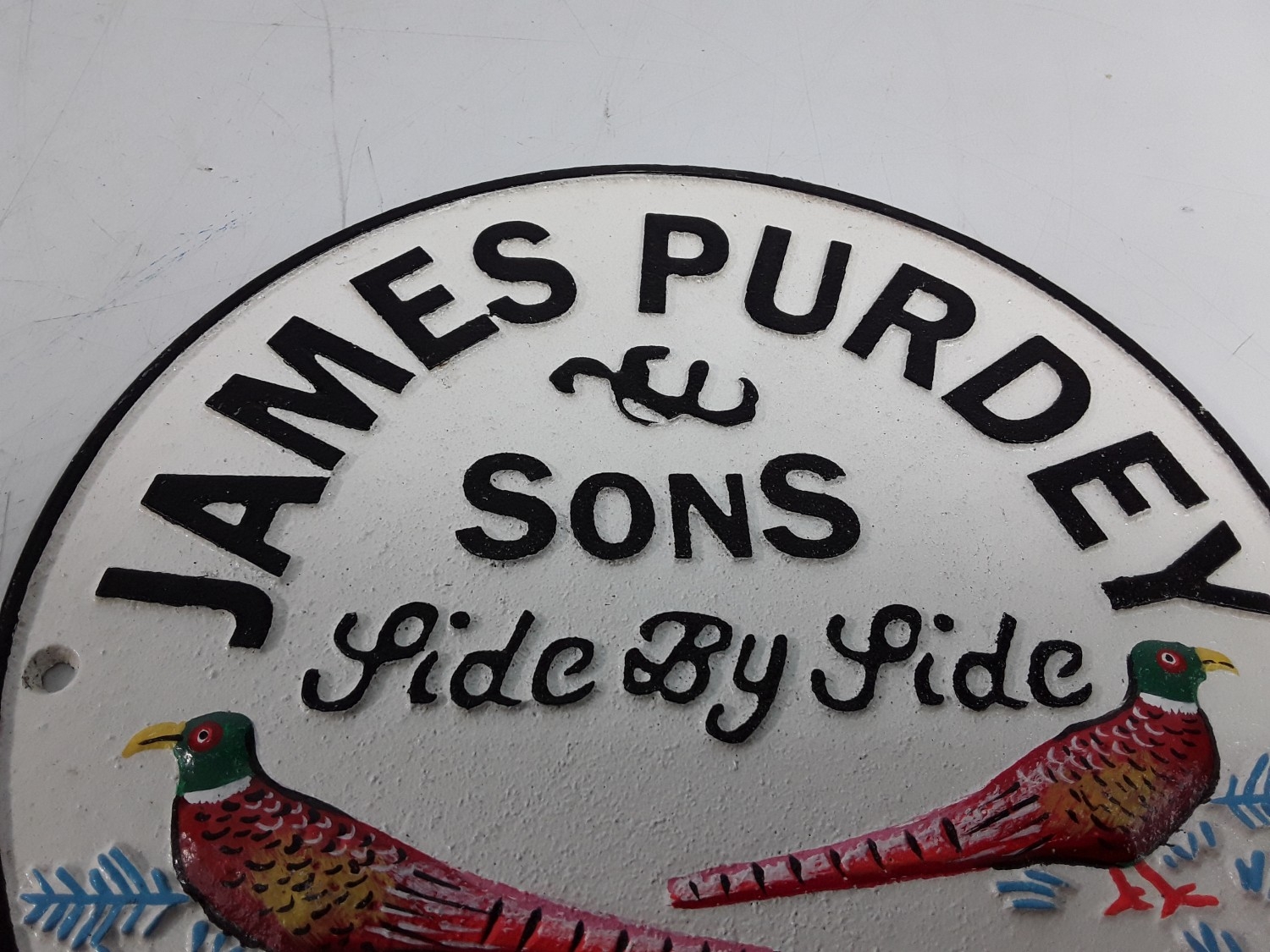 Cast metal James Purdey advertising sign, 24cms in diameter