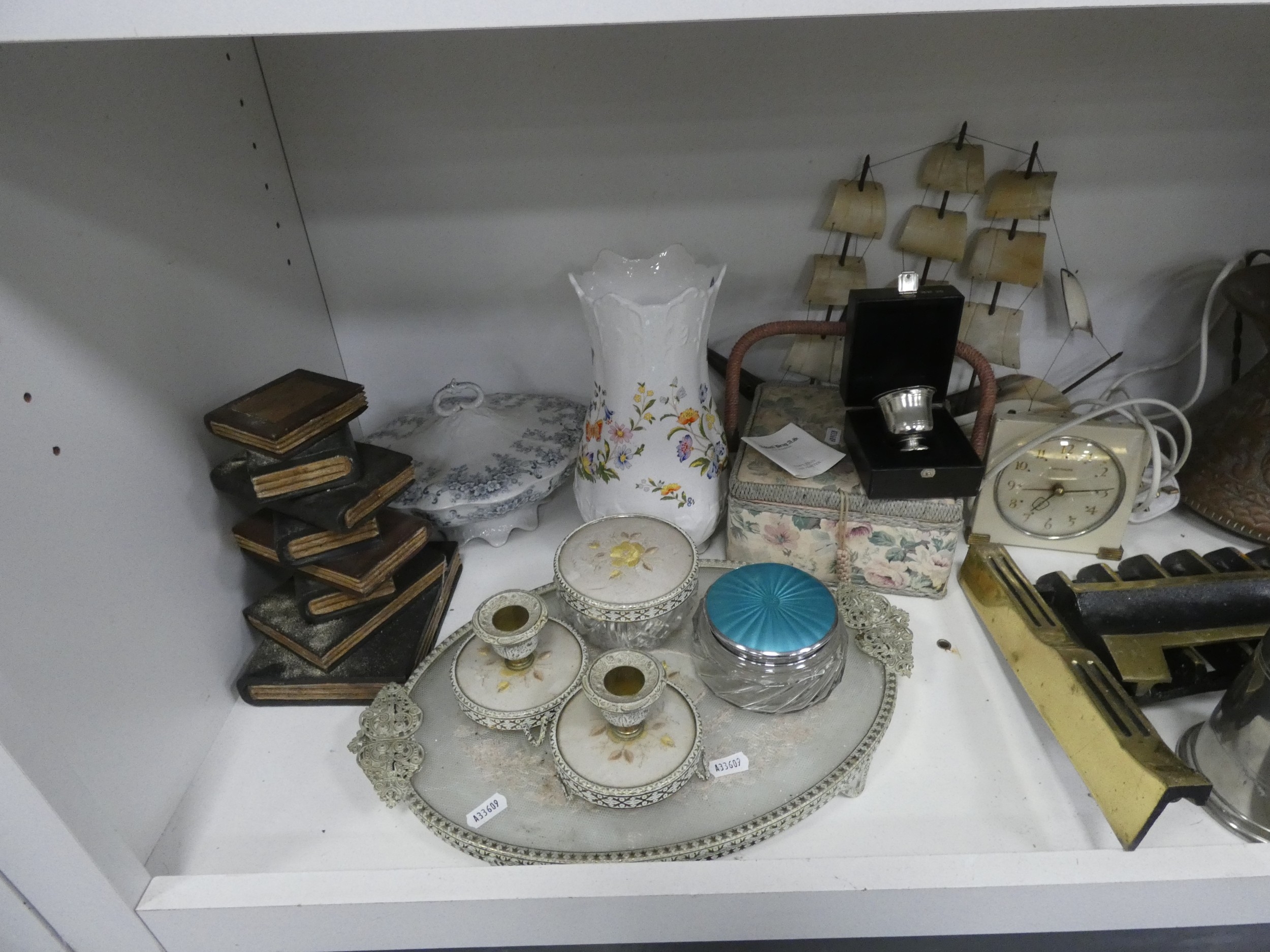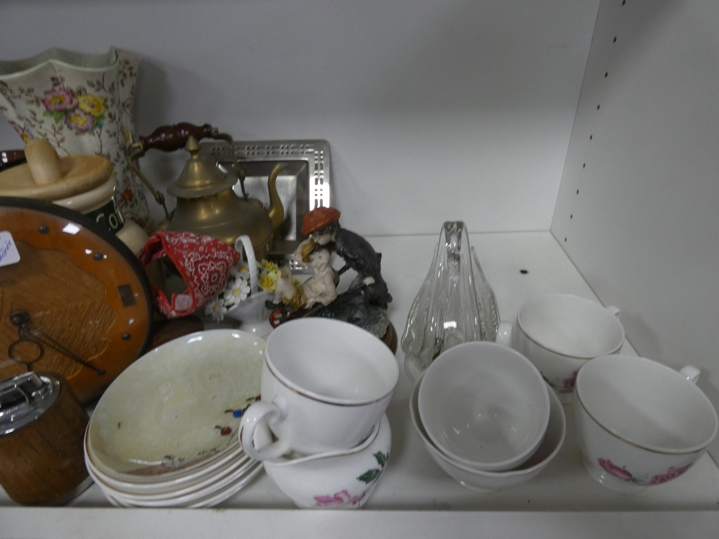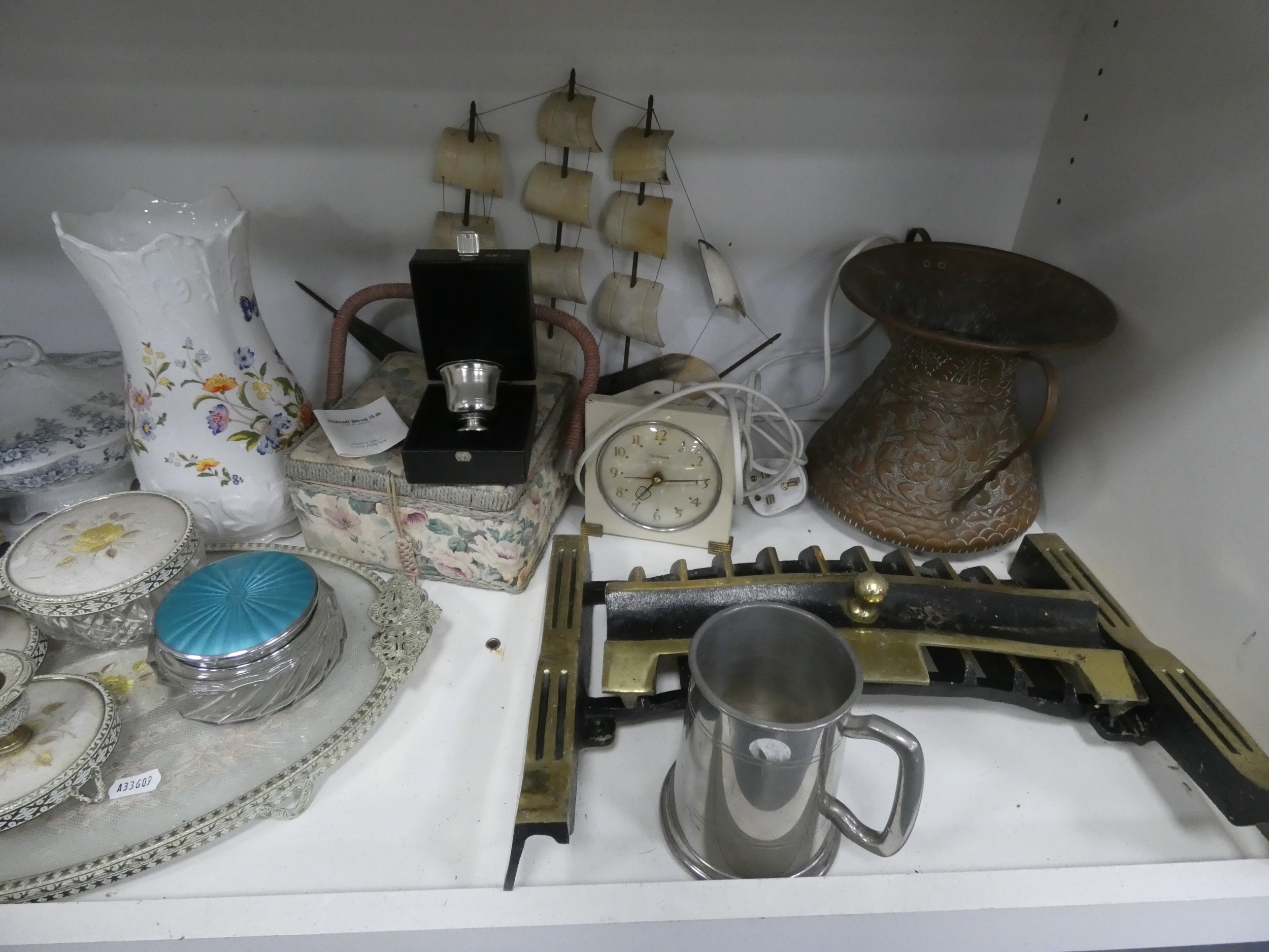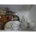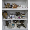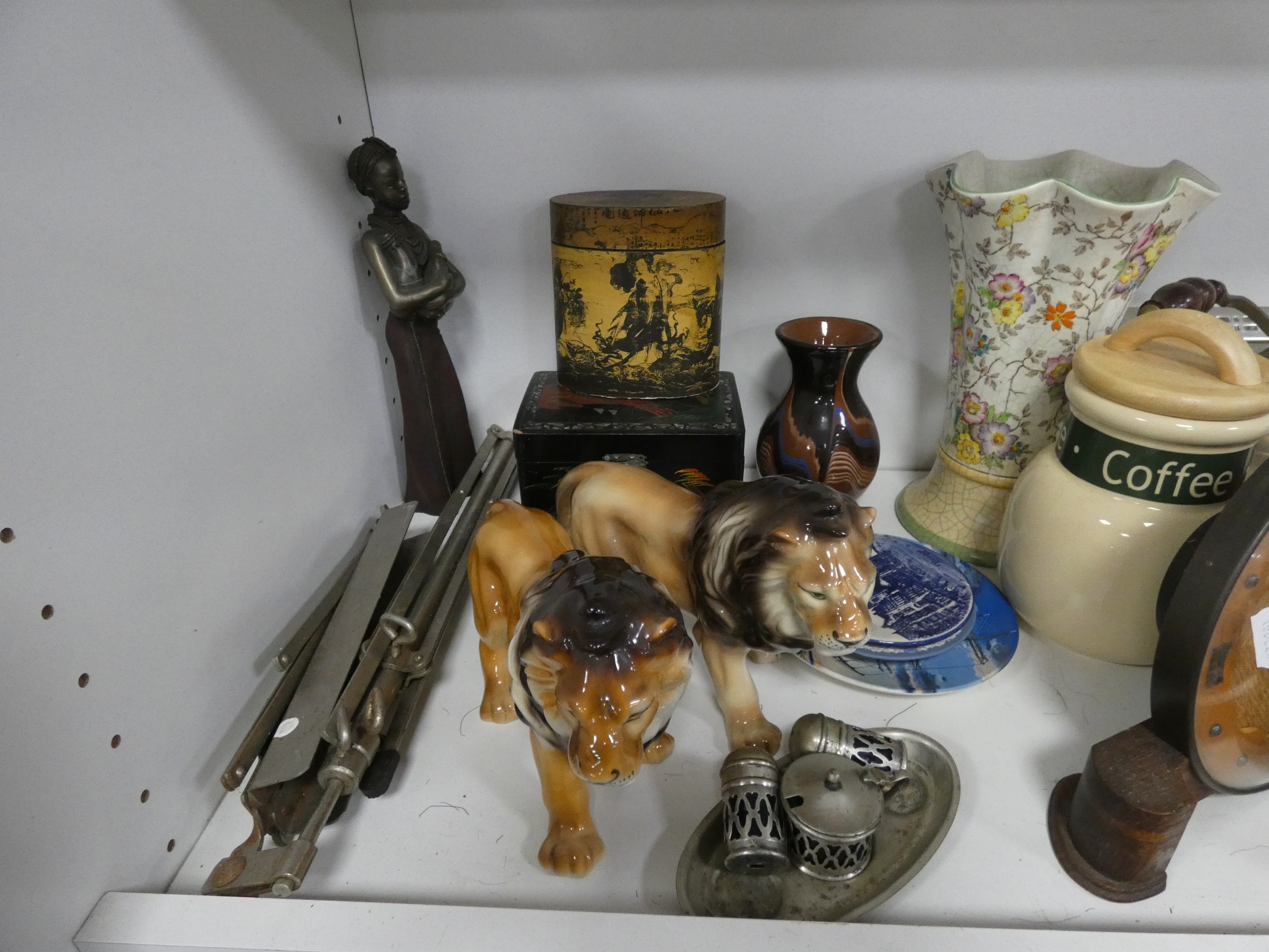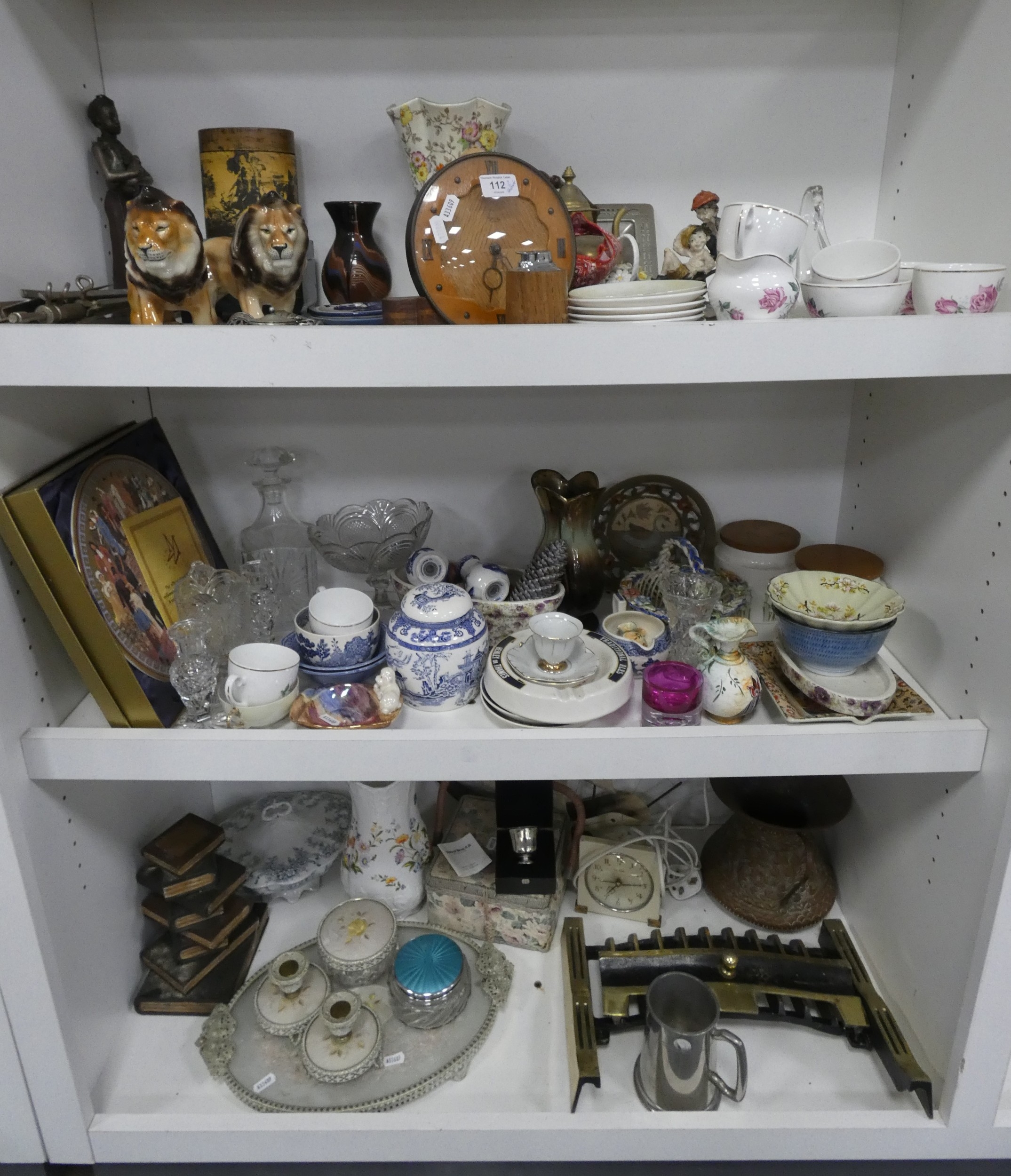 China, sundries, glass to include an Aynsley vase, dressing table items, fire grate, Hornsea storage jars, Smith's clock, Maasai figure, pair of lion ornaments etc (three shelves).