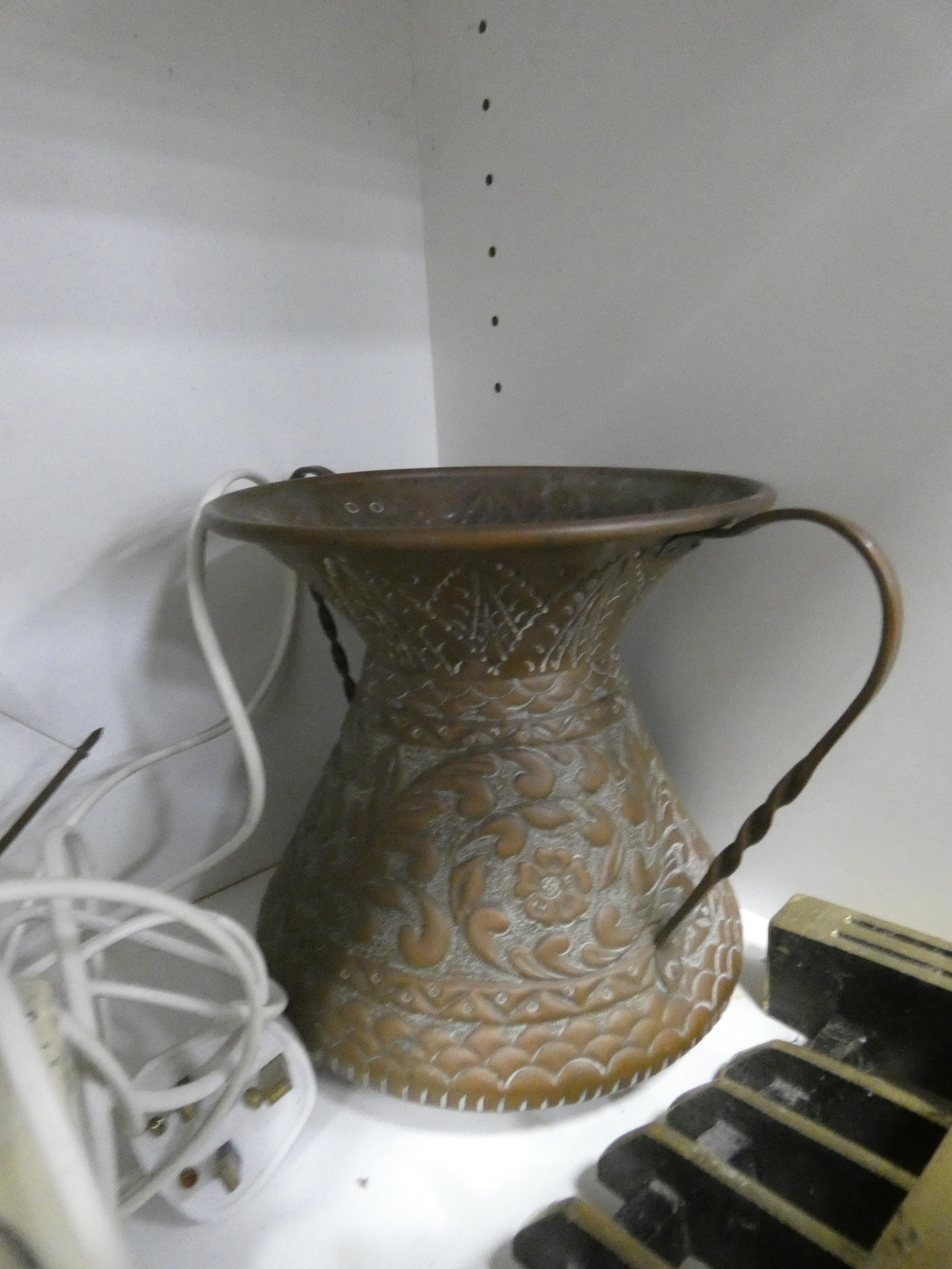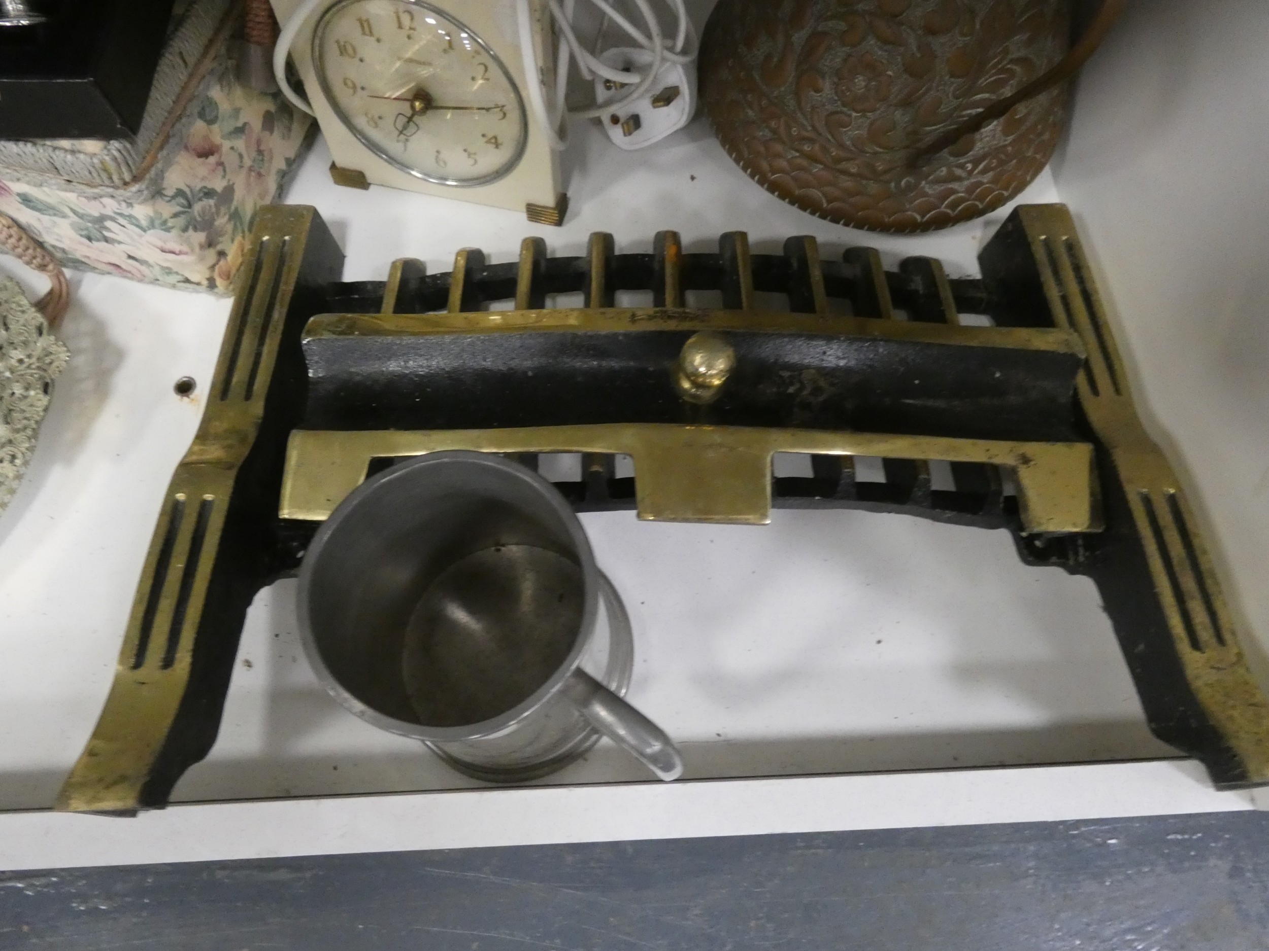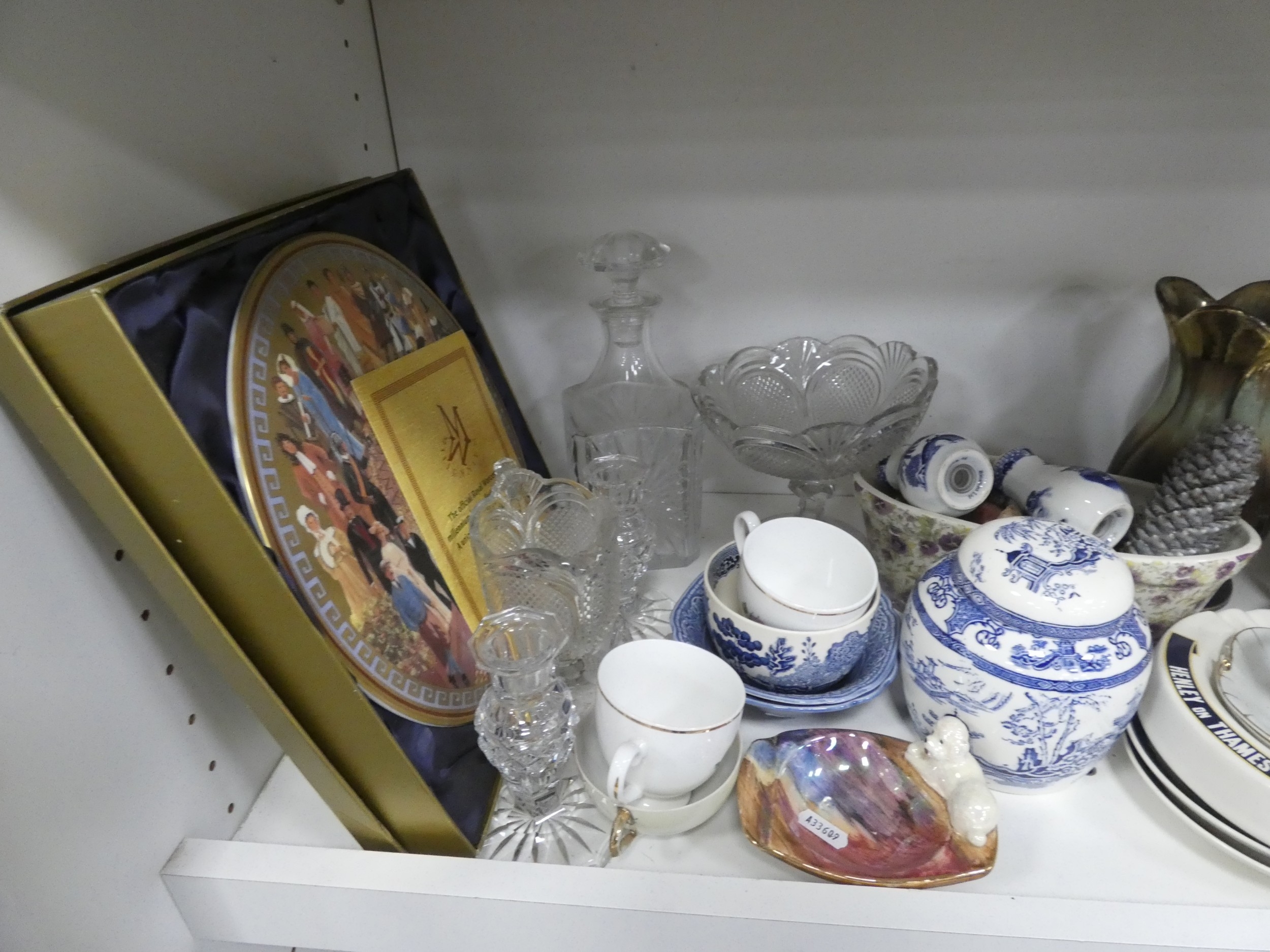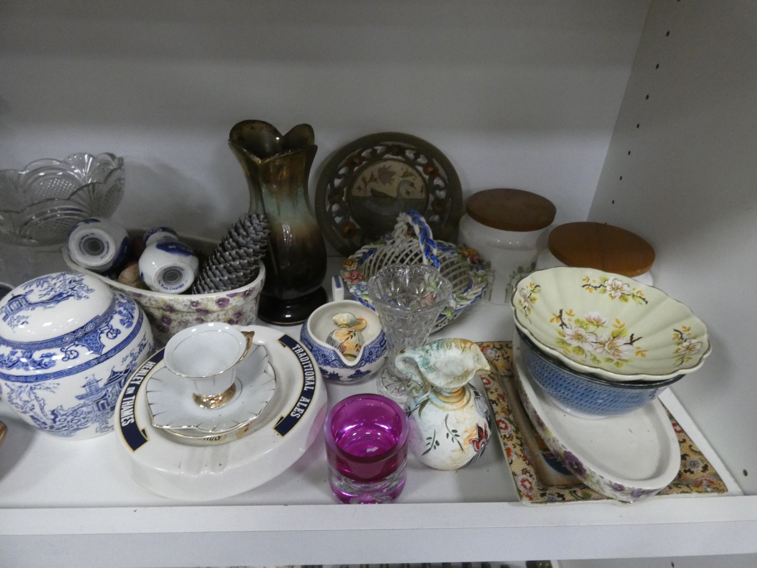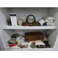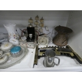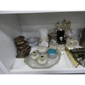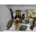 China, sundries, glass to include an Aynsley vase, dressing table items, fire grate, Hornsea storage jars, Smith's clock, Maasai figure, pair of lion ornaments etc (three shelves).