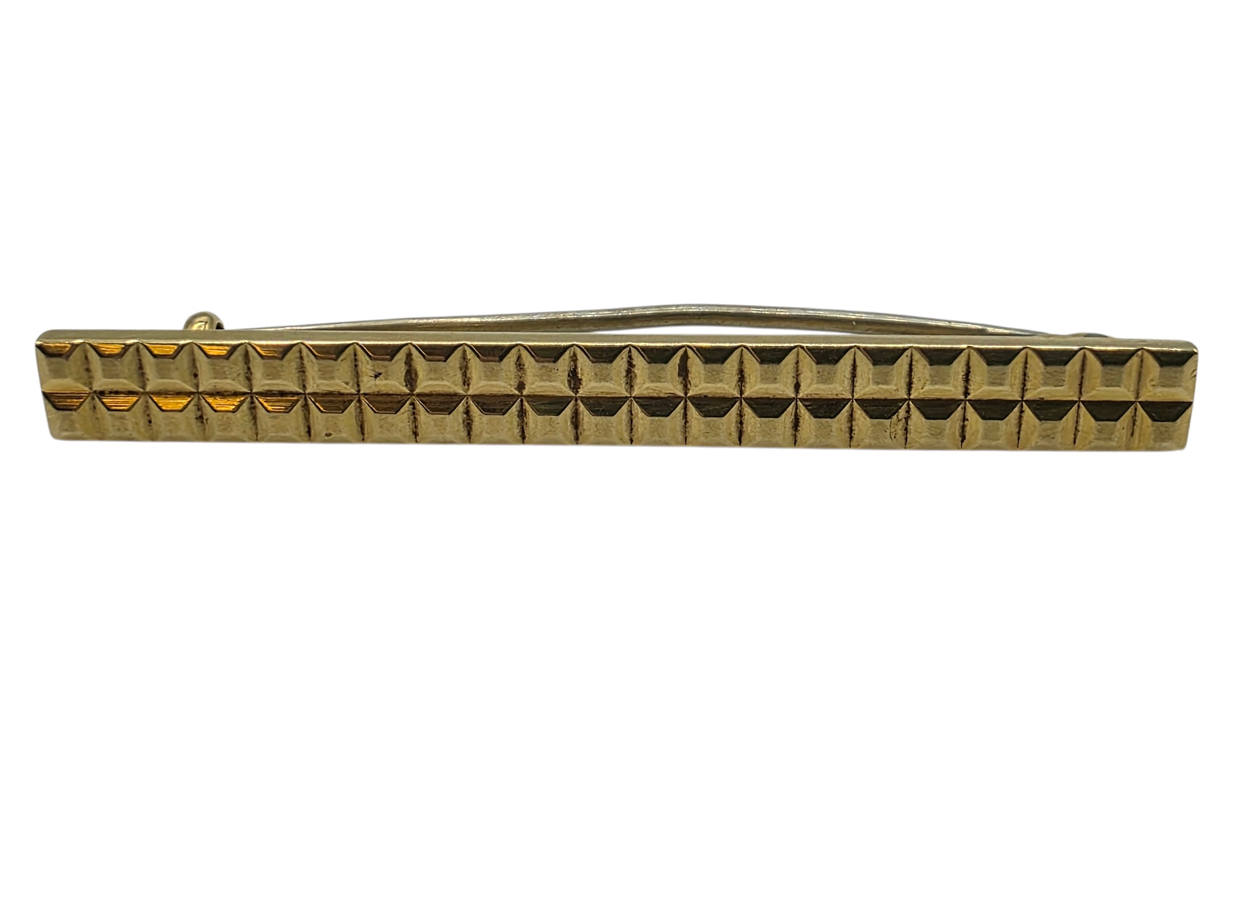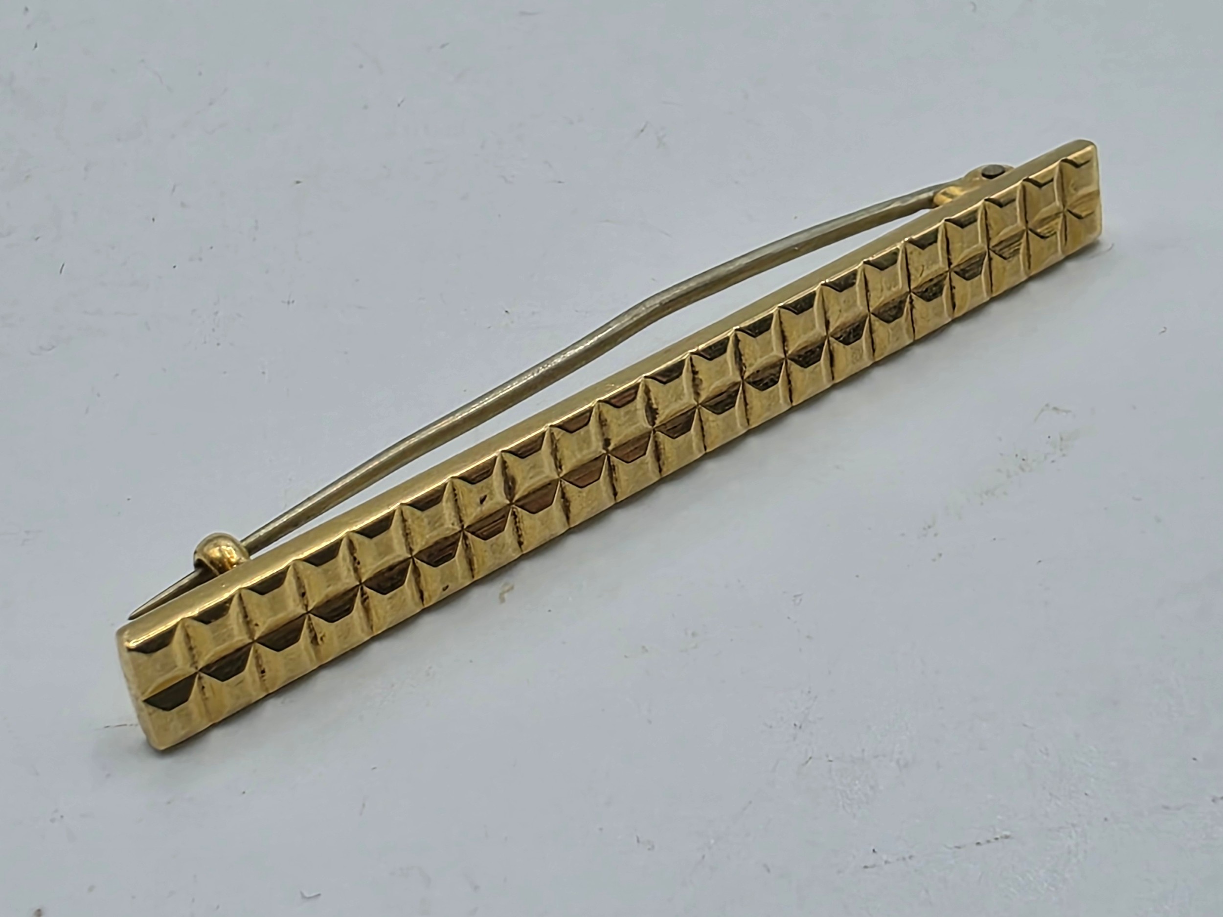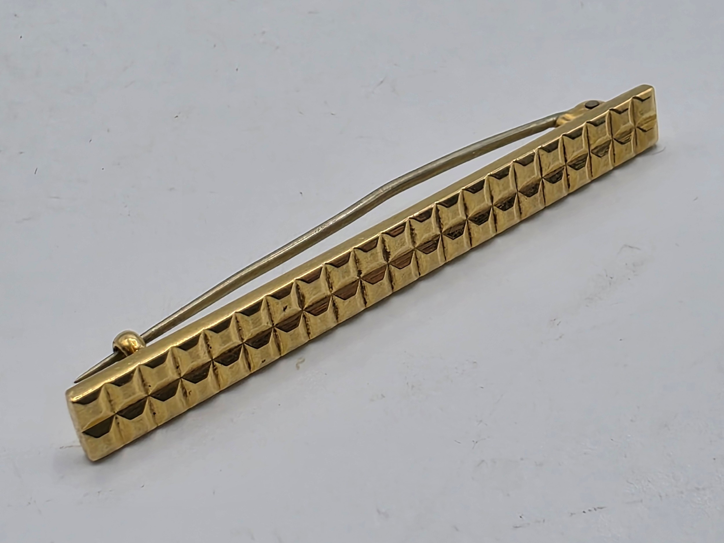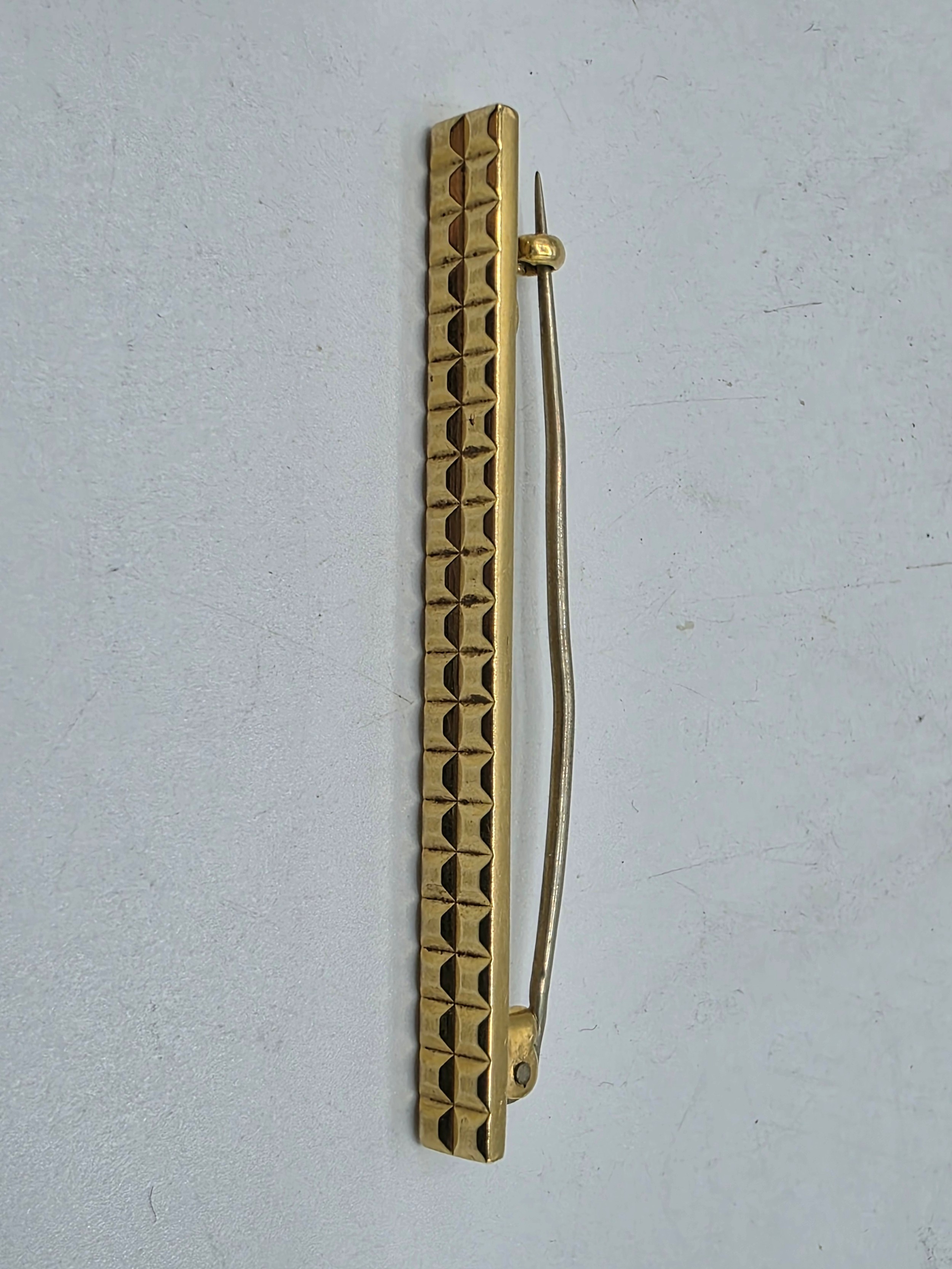 An 18ct gold bar brooch with geometric textured design. 9.9g.
