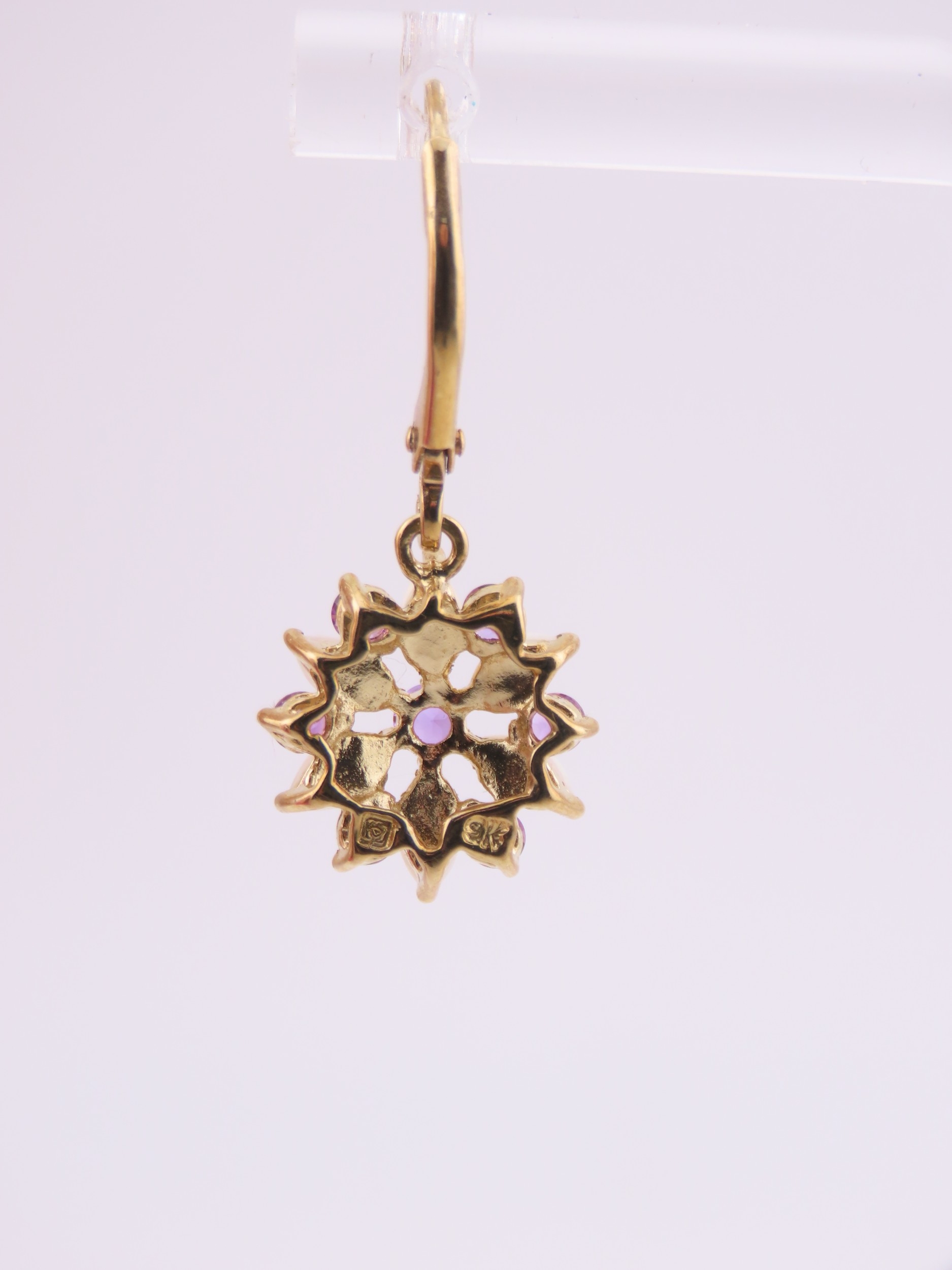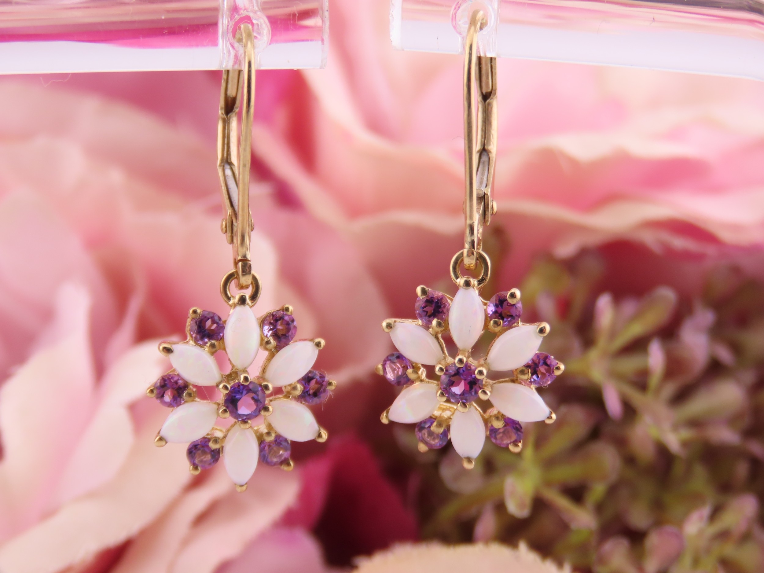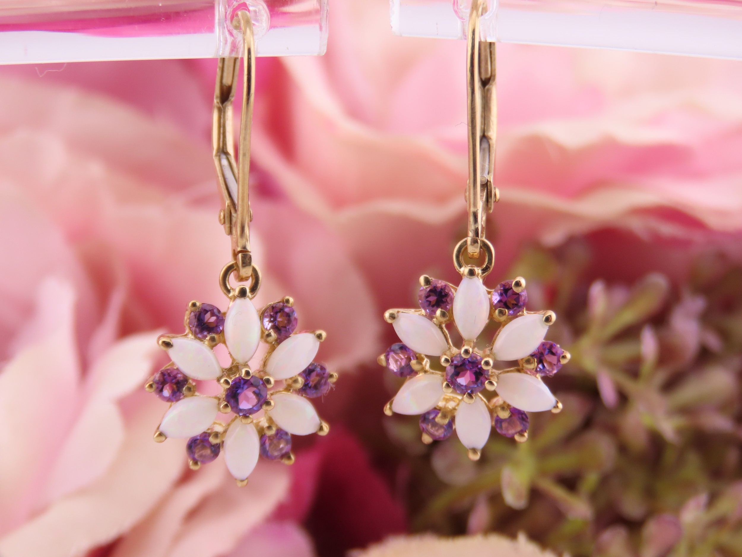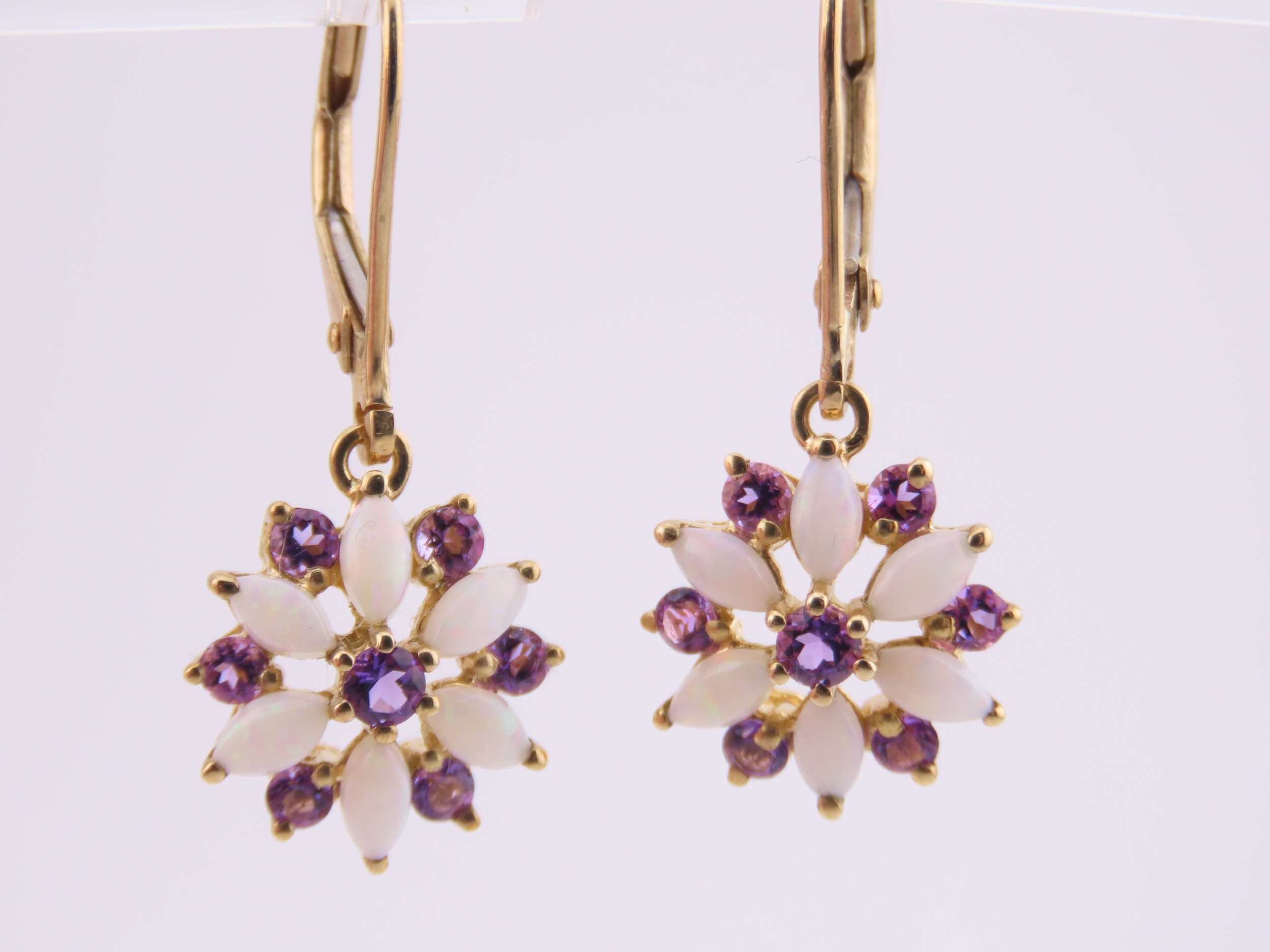 Pair of 9ct Gold Amethyst and Opal Earrings. Each of floral cluster design set with alternating amethysts and opals suspended from hinged fittings. Gross weight 2 grams.