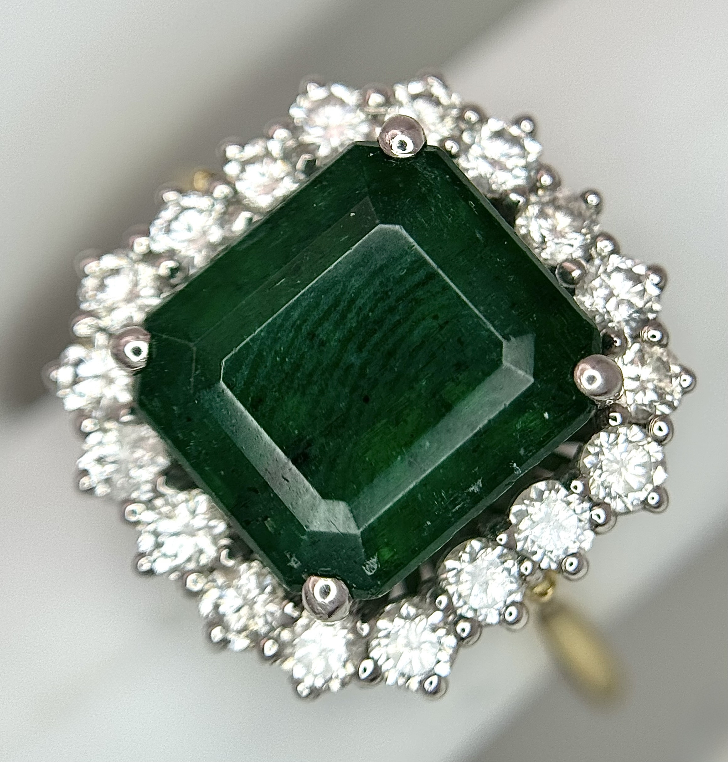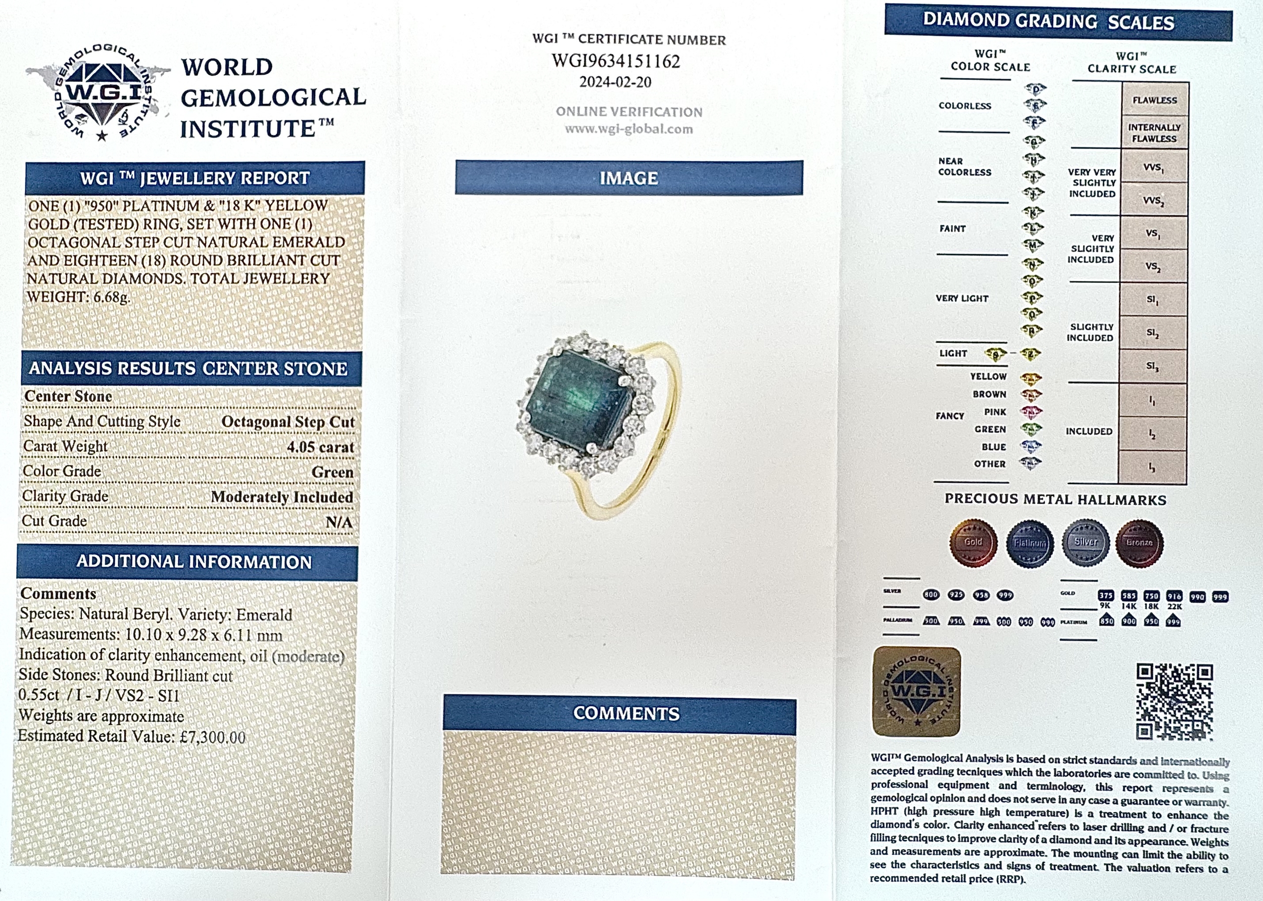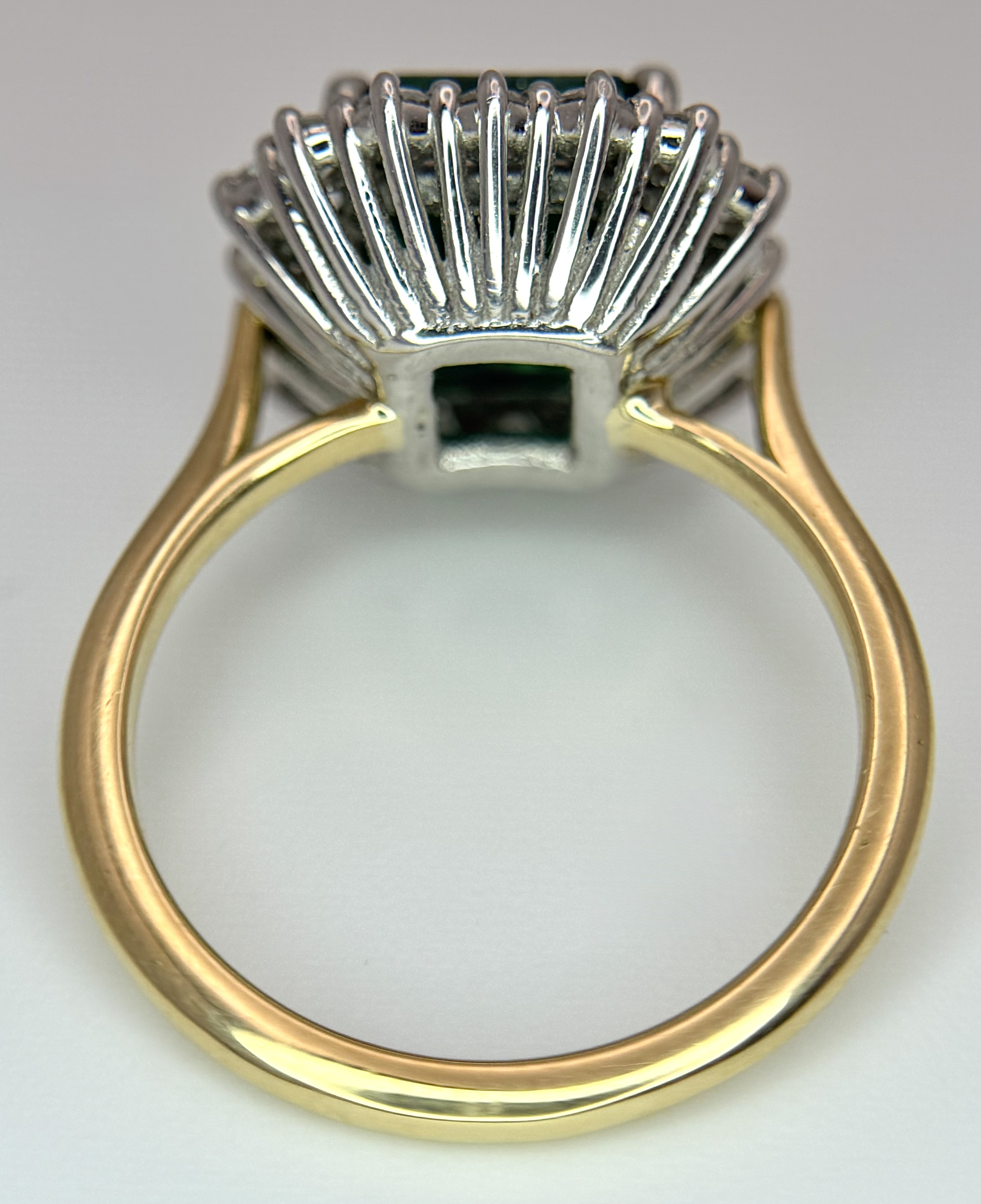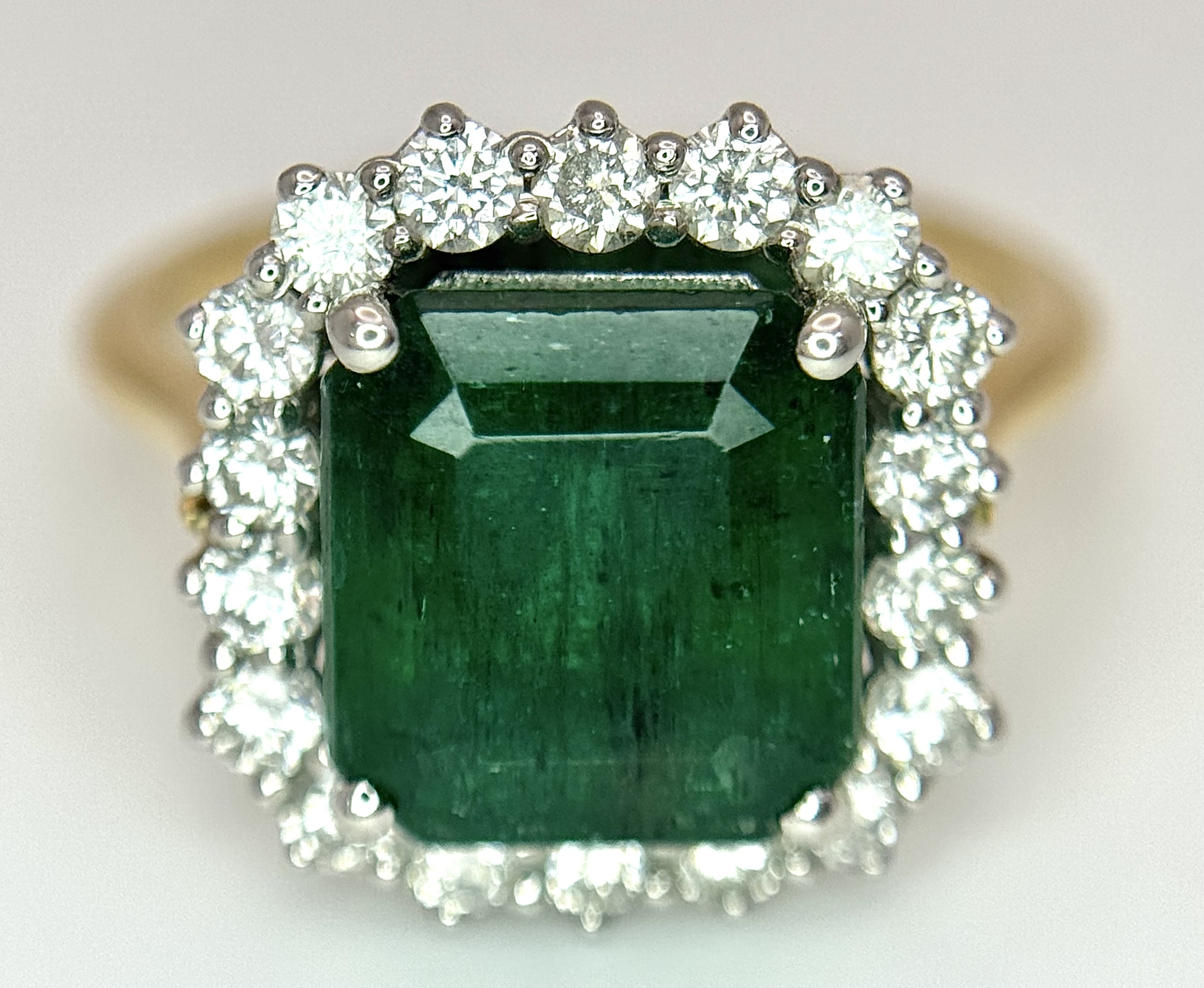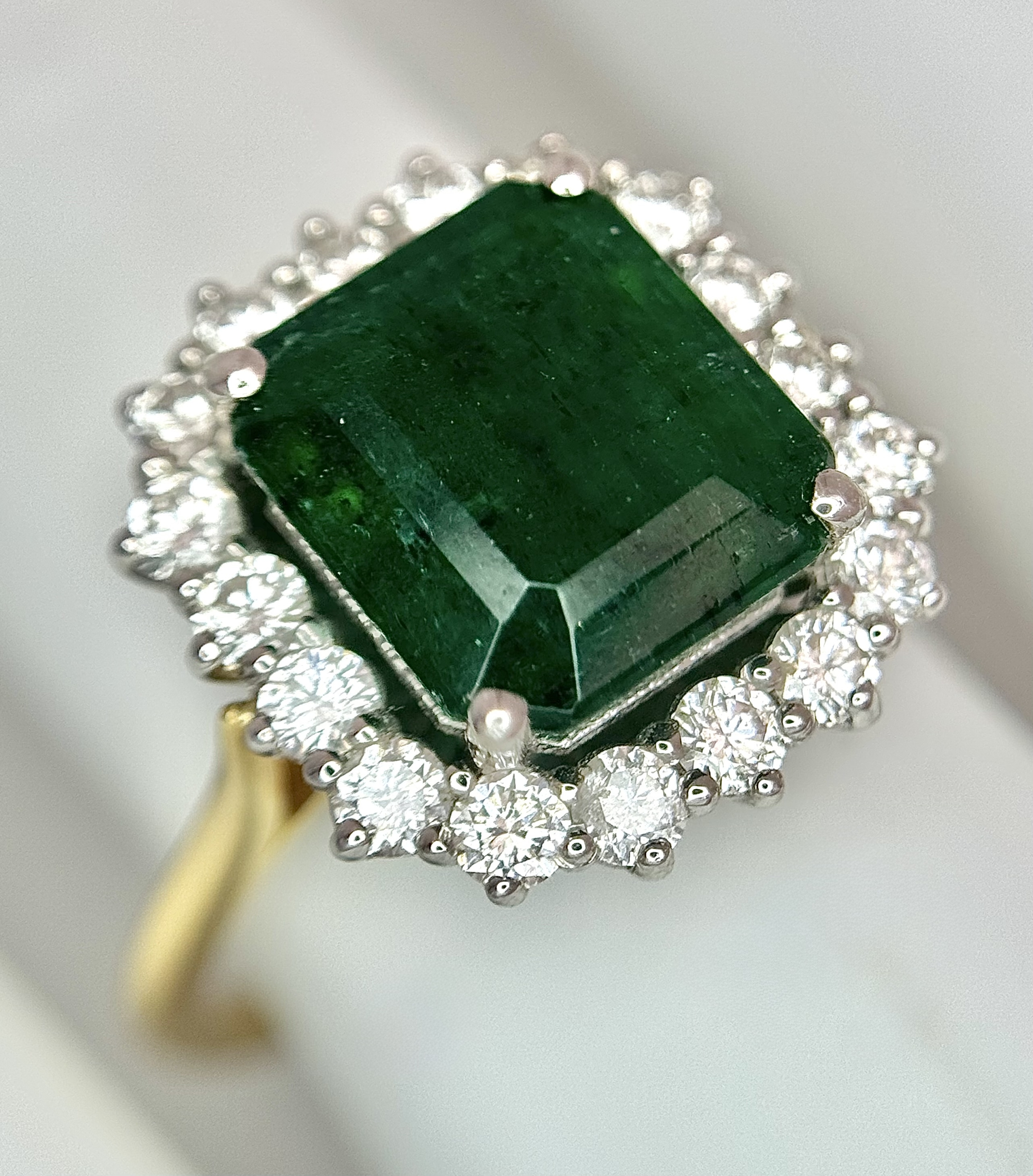 A W.G.I Certified 18K Yellow Gold, 950 Platinum, Emerald and Diamond Ring. An octagonal cut 4.05ct emerald with a 0.55ct diamond surround. Size N 1/2. 6.6g. r-213504.