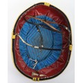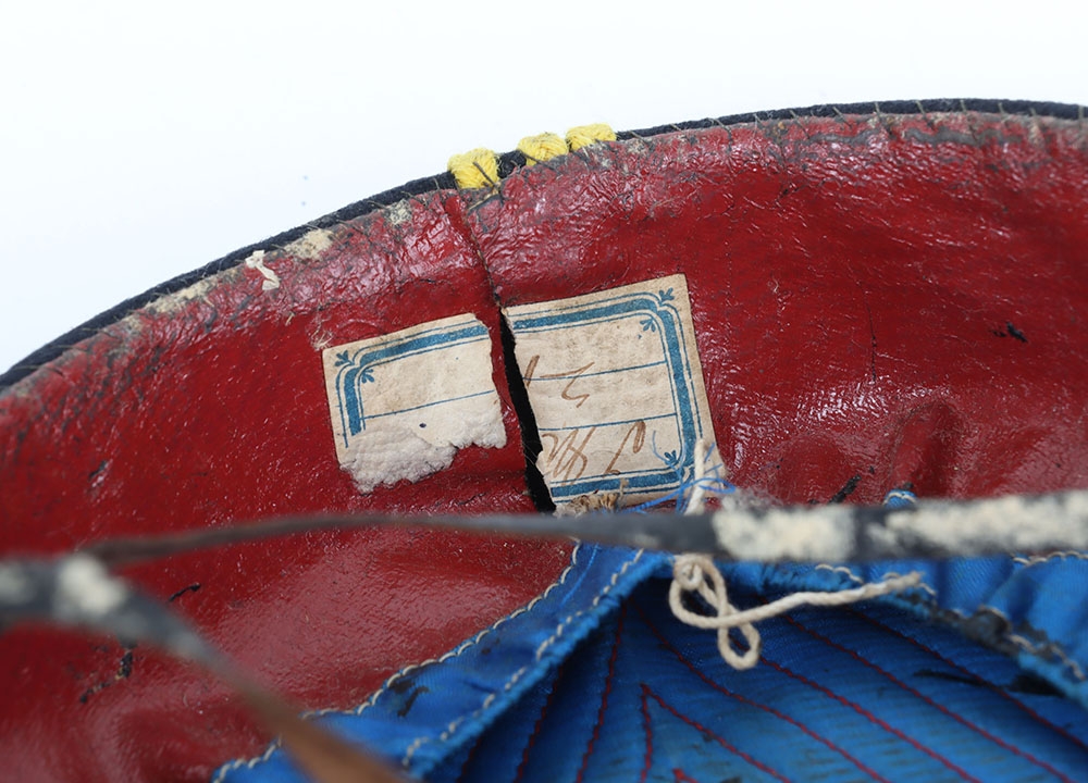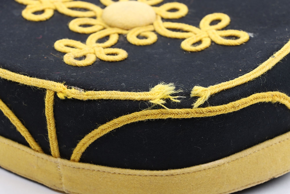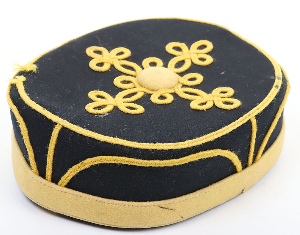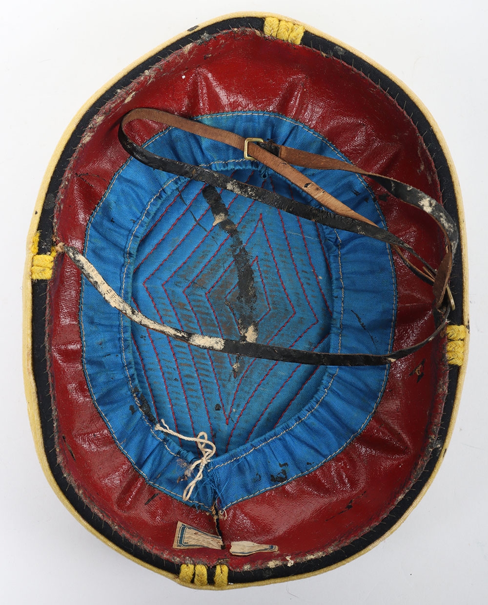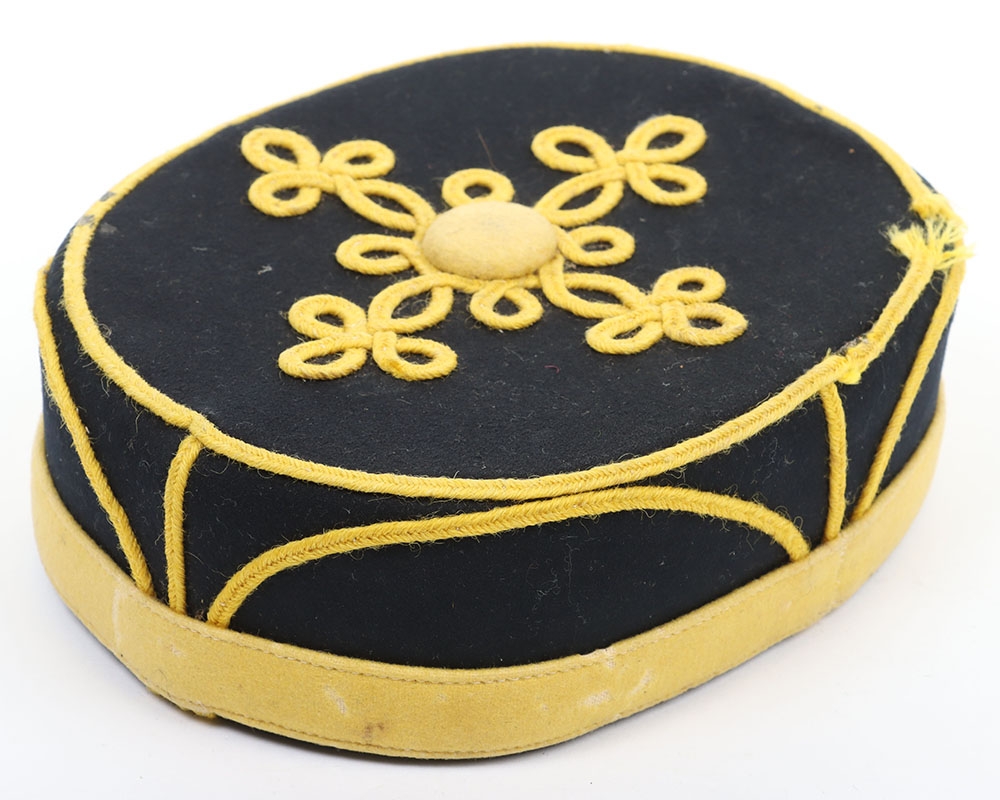 Yeomanry Hussars Other Ranks Pill Box Cap. ORs Pill Box made from dark blue cloth with yellow band and yellow cord pattern to top and sides. Scarlet and blue lining with chin strap. In generally near very good condition, but with damage to yellow band & cord.