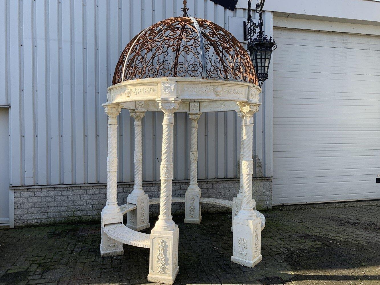 Good quality cast stone garden gazebo with wrought iron dome top.