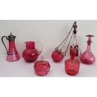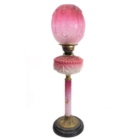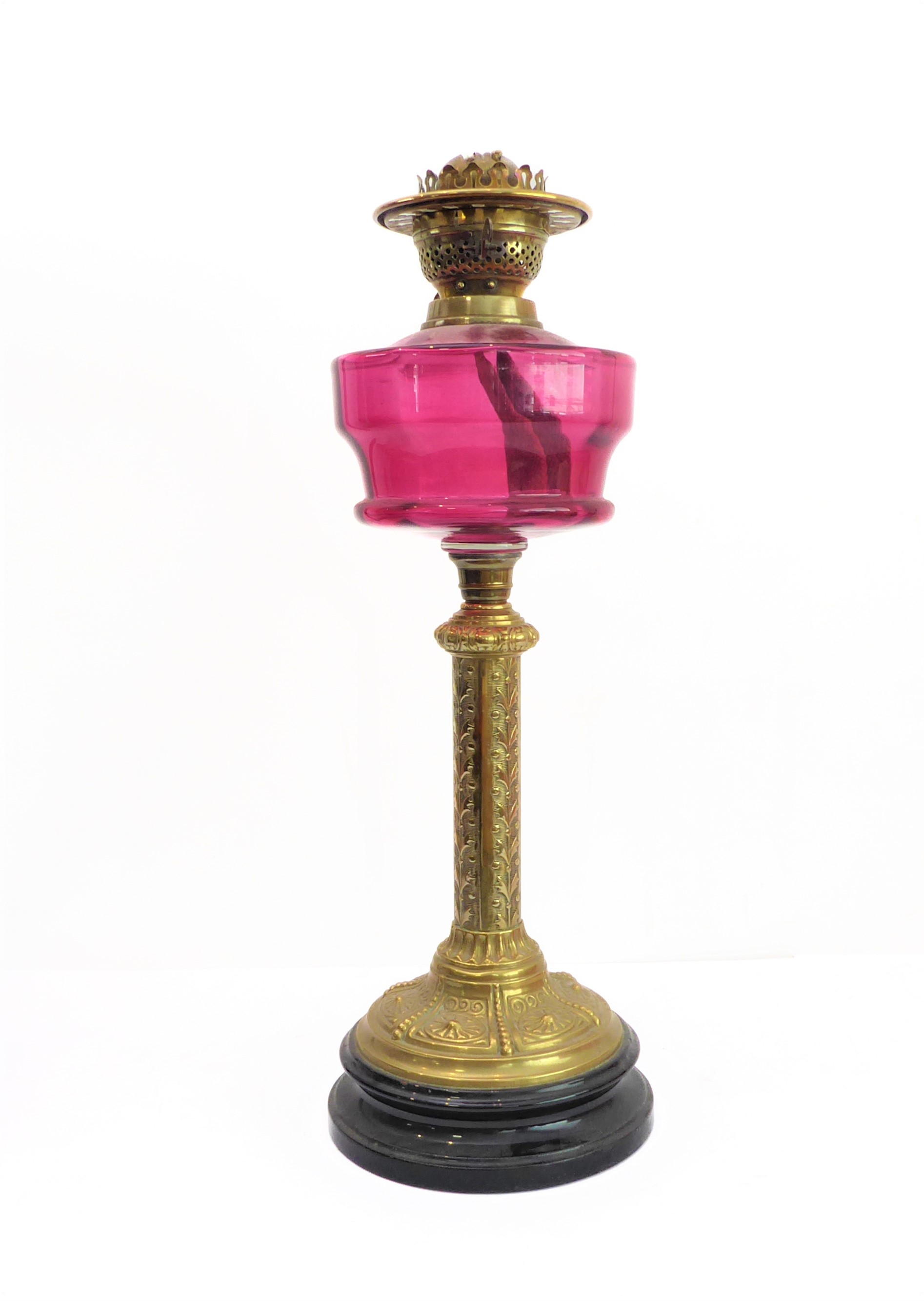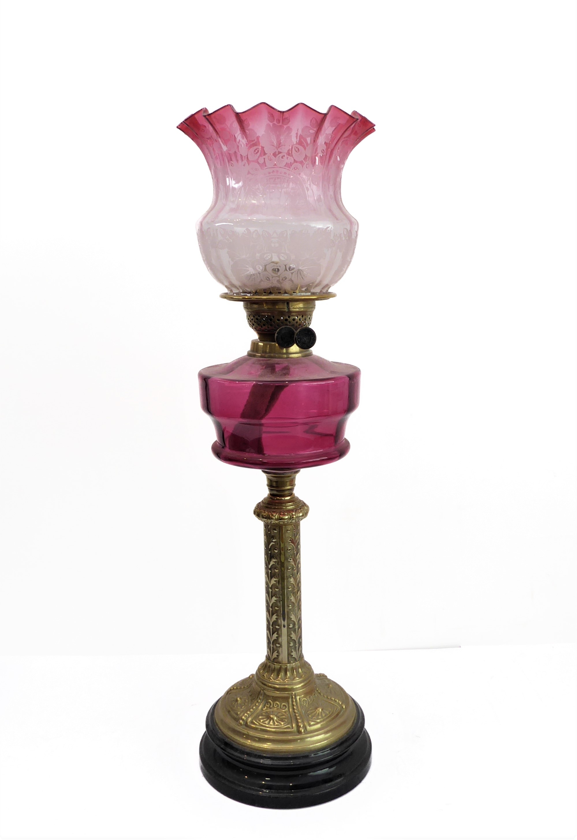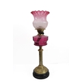 A 19th century brass-mounted oil lamp with cranberry glass reservoir and crimped shade: foliate decoration to the stem and with oval pateras in relief (66.5 cm high)