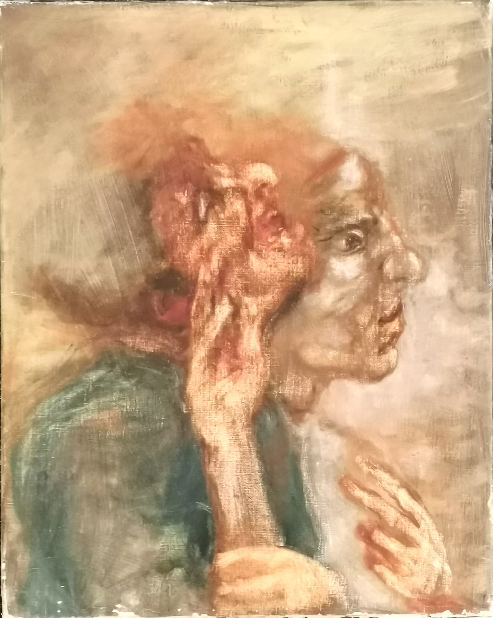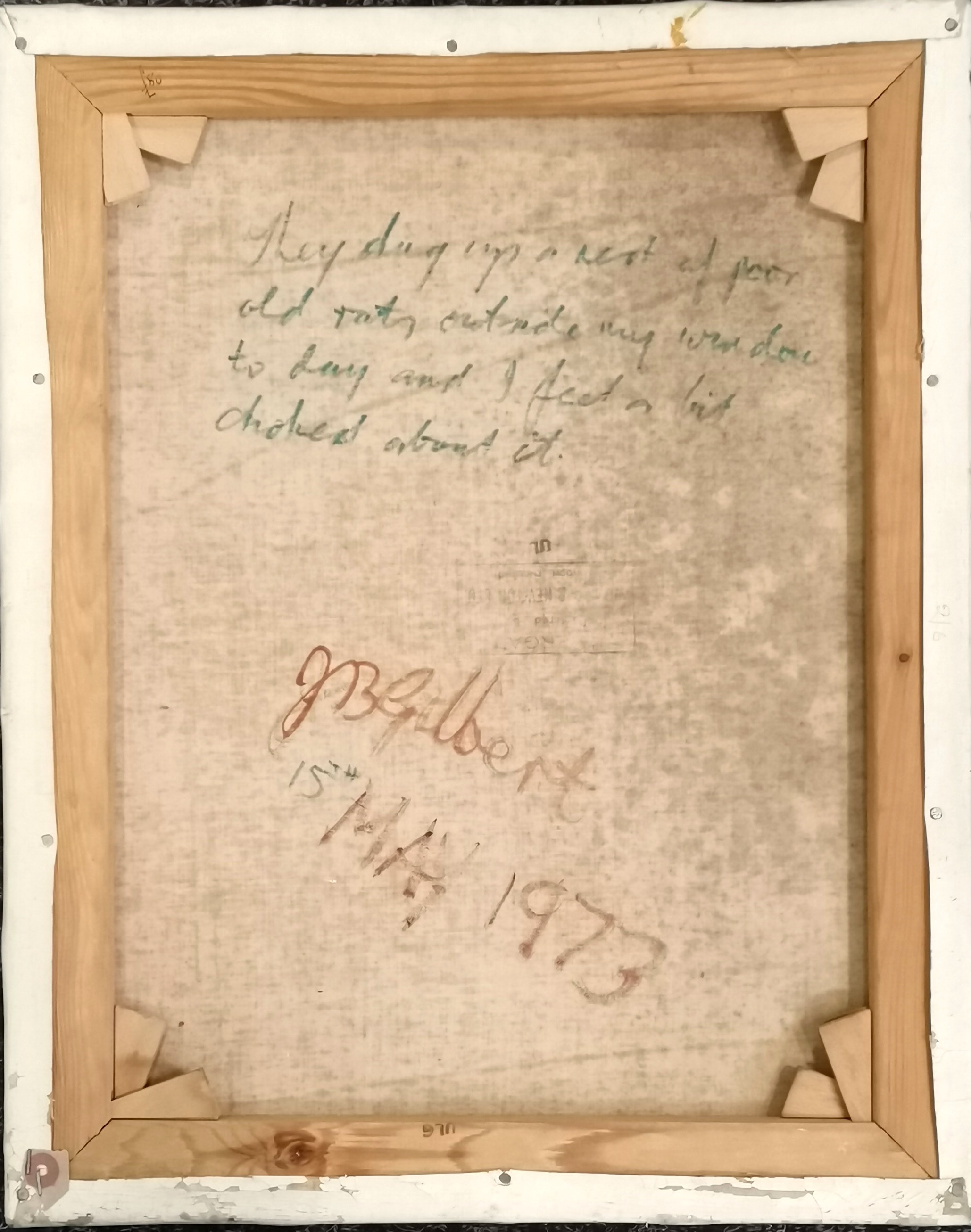 Jim Gilbert (1933-95) oil painting on canvas 'They dug up a nest of poor old rats outside my window today and I feel a bit choked about it' & dated 1973 - 51cm x 41cm ~ some losses to the paint around the edges