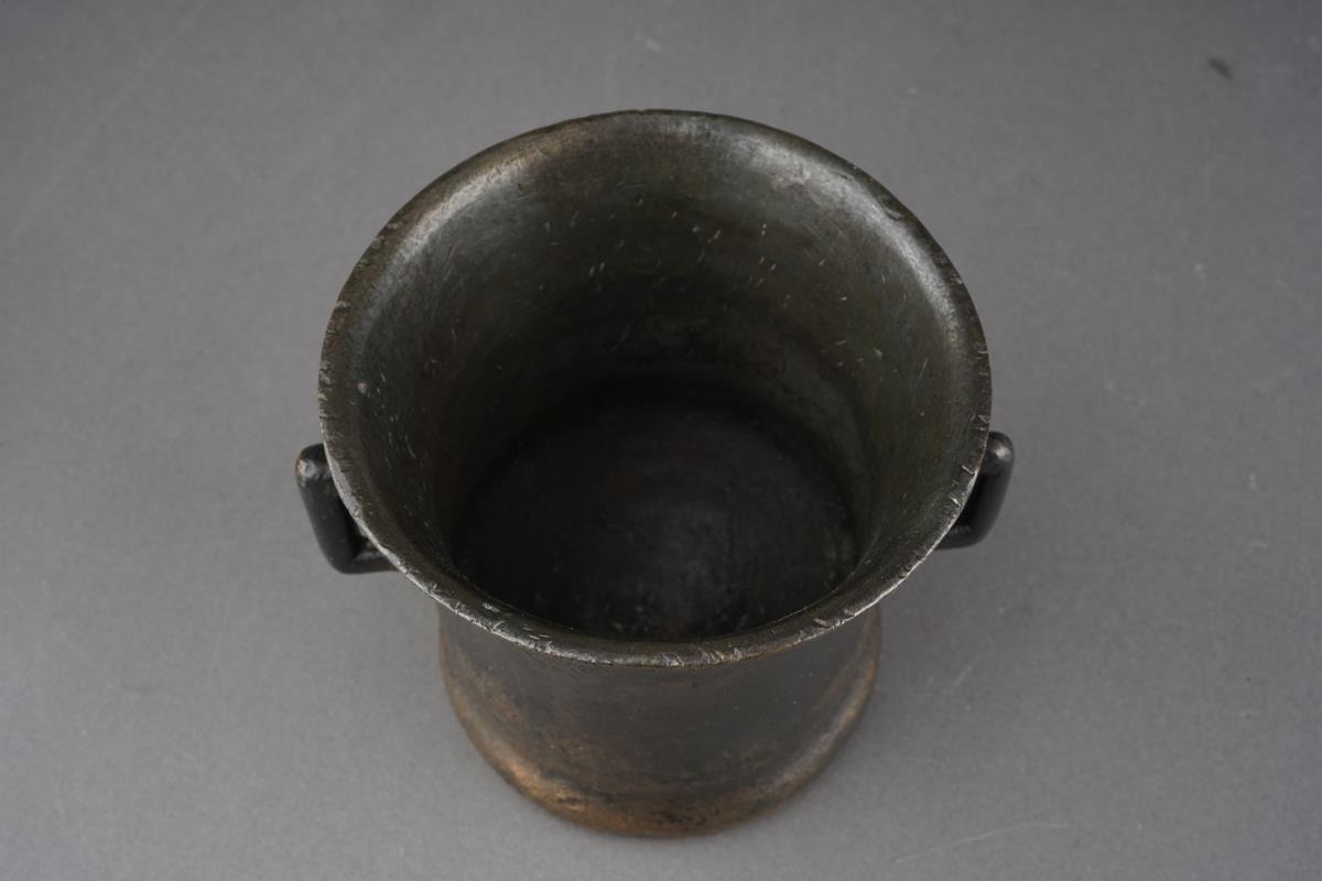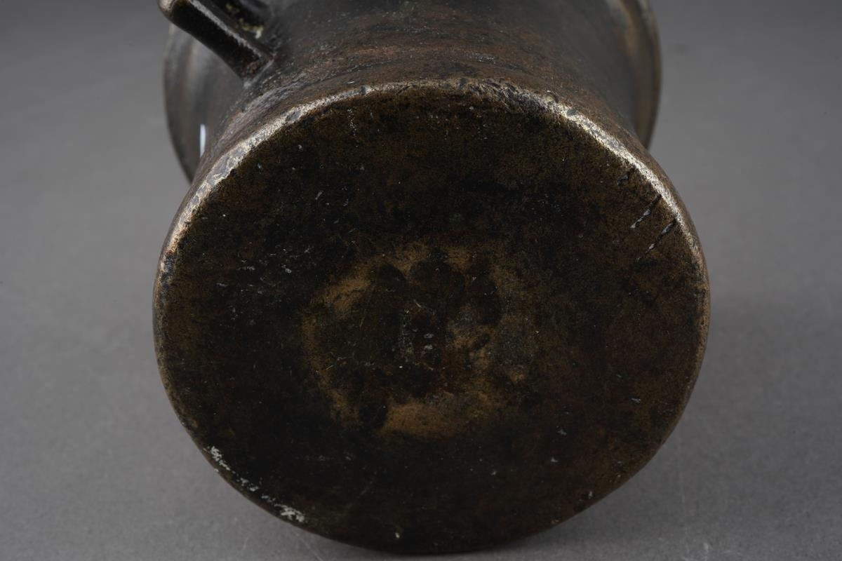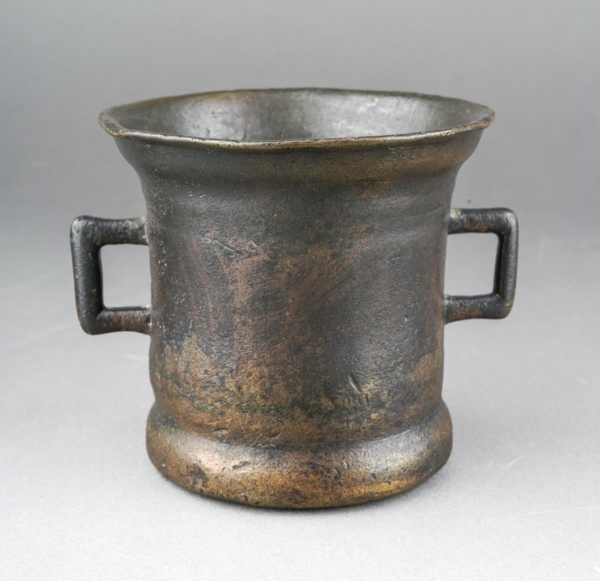 A Chinese bronze two handled mortar, flared cylinred with angular handles, approx 8.5cm high [1]