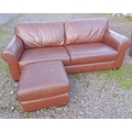 BROWN LEATHER 3 SEATER WITH MATCHING FOOTSTOOL