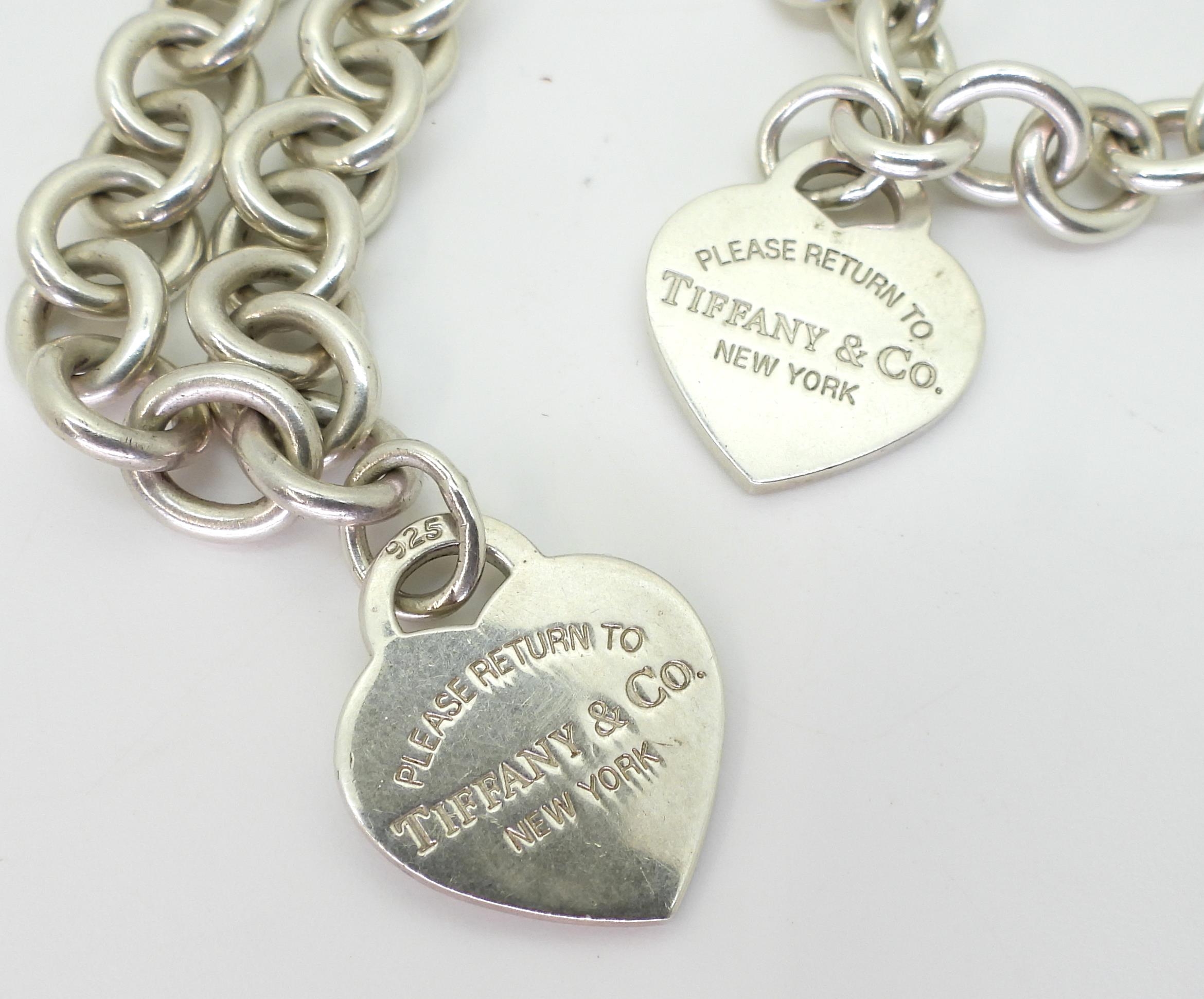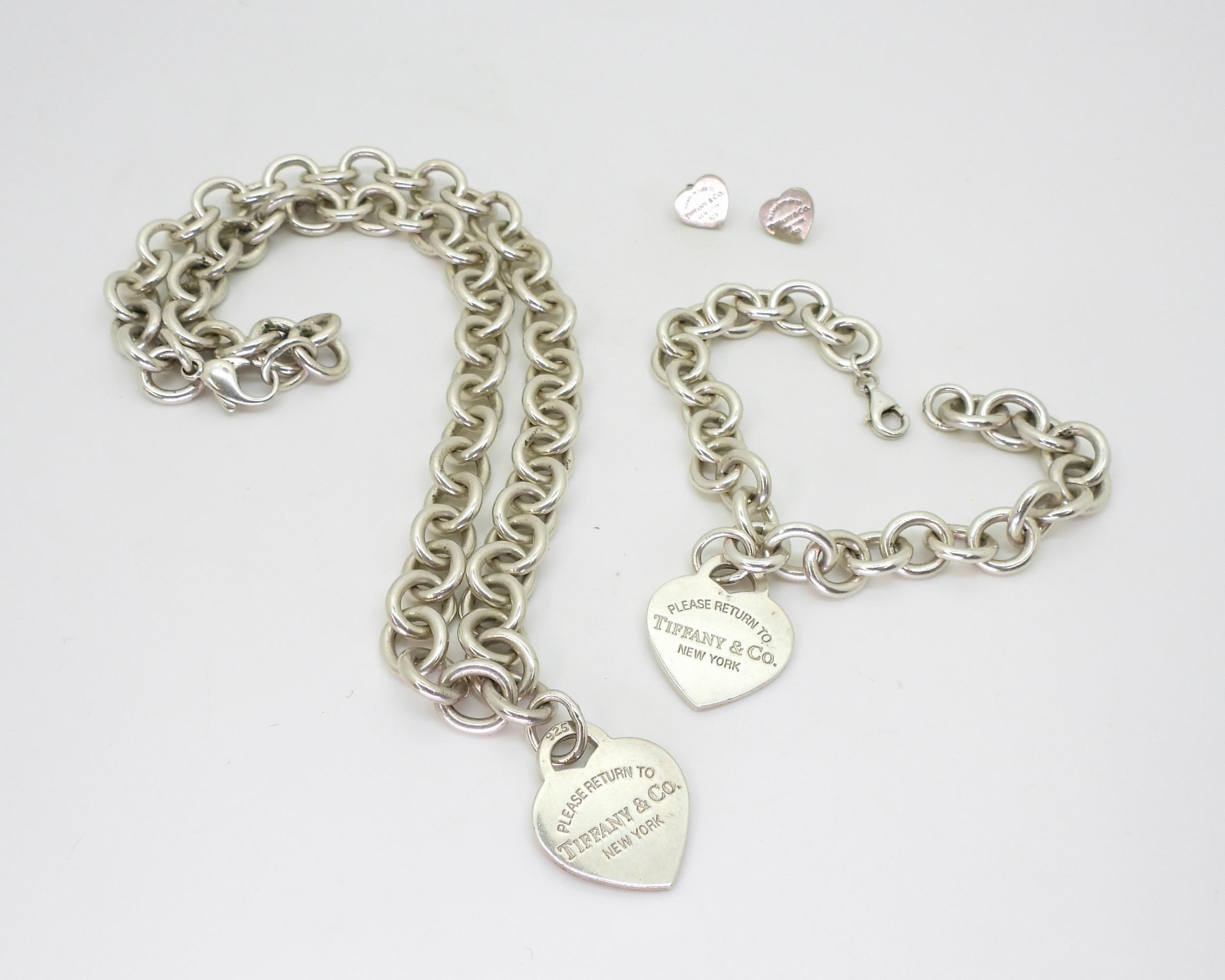 A collection of silver 'Please return to' Jewels, all stamped 'Tiffany & Co, New York', comprising of necklace, bracelet and earrings, earring butterflies also stamped T&Co