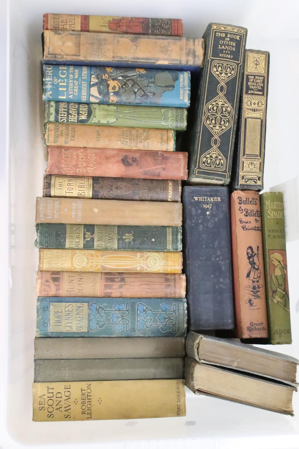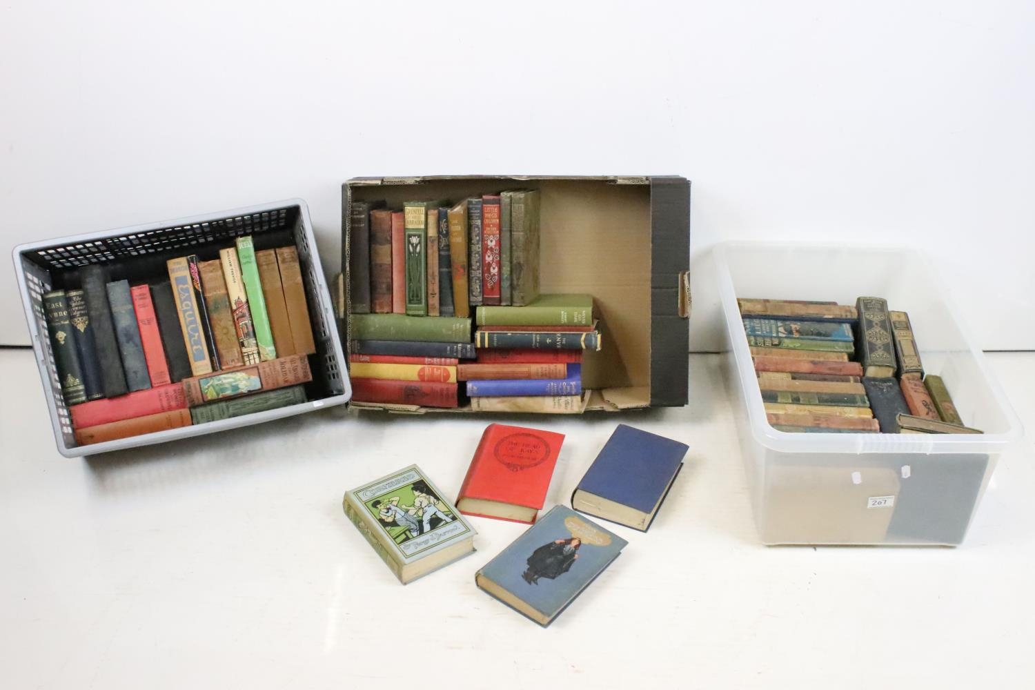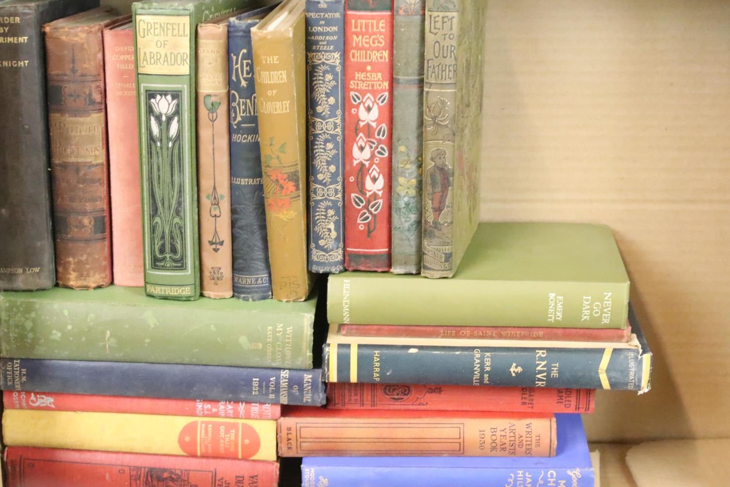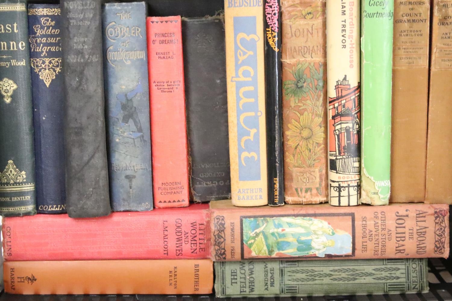 Collection of around 65 books, mostly early-to-mid 20th century fiction examples in cloth bindings, to include Little Women And Good Wives (L.M. Alcott), All Aboard The 'Jolibar'... (Epworth Press), Sea scout And Savage (Robert Leighton), The Fellow Who Won (Andrew Home), etc (3 boxes)