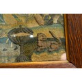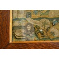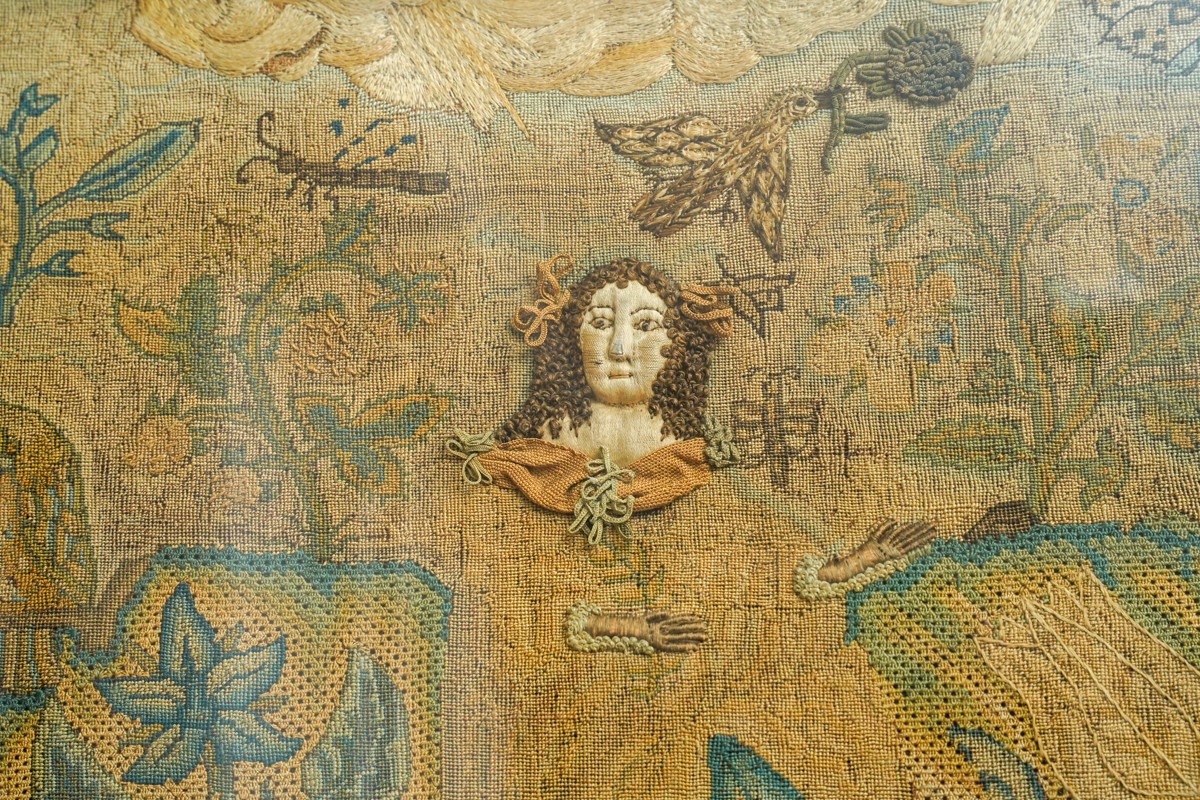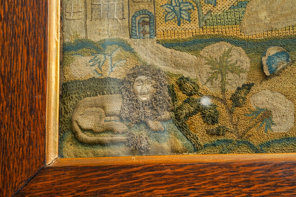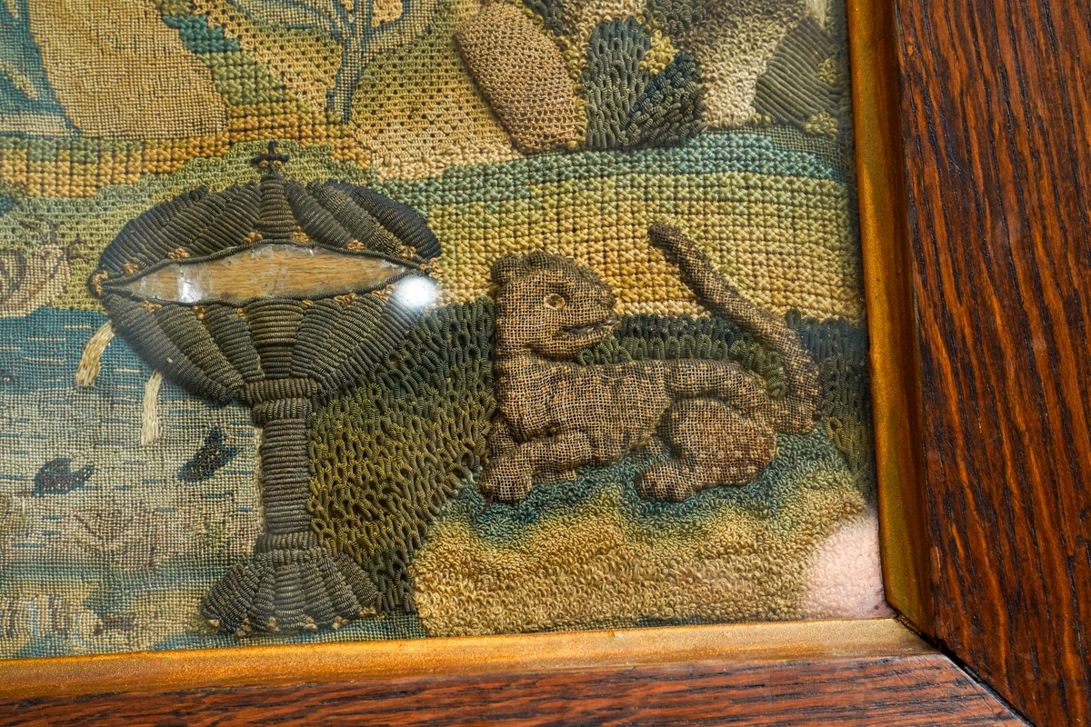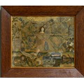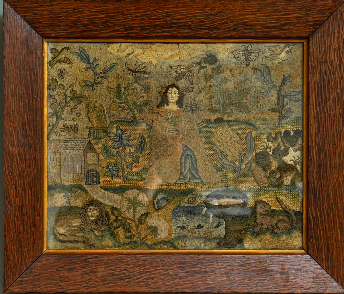 A mid 17th Century stumpwork and needlework panel, profusely decorated with a central figure of a Lady [Henrietta Maria] wearing a cape and gloved hands standing in a landscape, the upper section with clouds, birds, insect, butterfly, ladybird, foliage, the mid section with Church, two large flowers including a Tulip and rockery; the lower section with a recumbant Lion, large flowers, butterfly, fish pond, catepillar, a Chalice with tarnished gold thread and a leopard., the panel approx 31 x 38cm, framed and glazed [1]