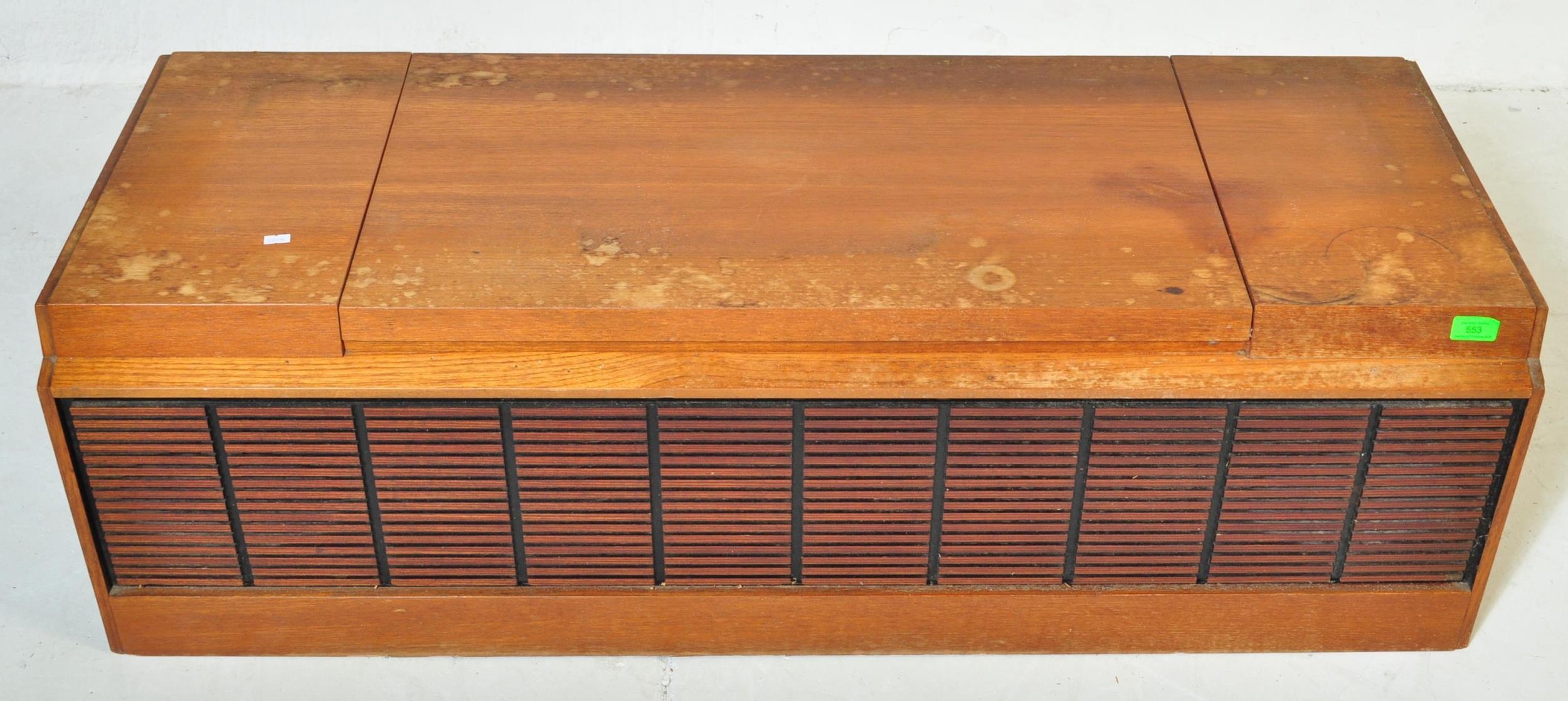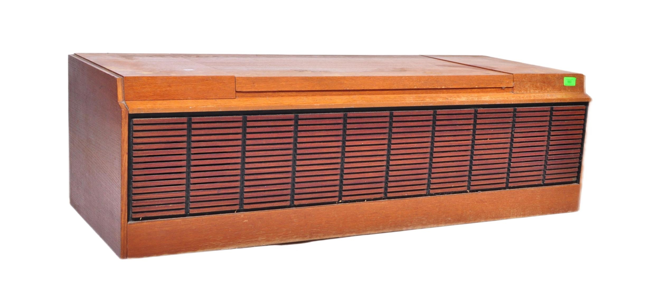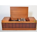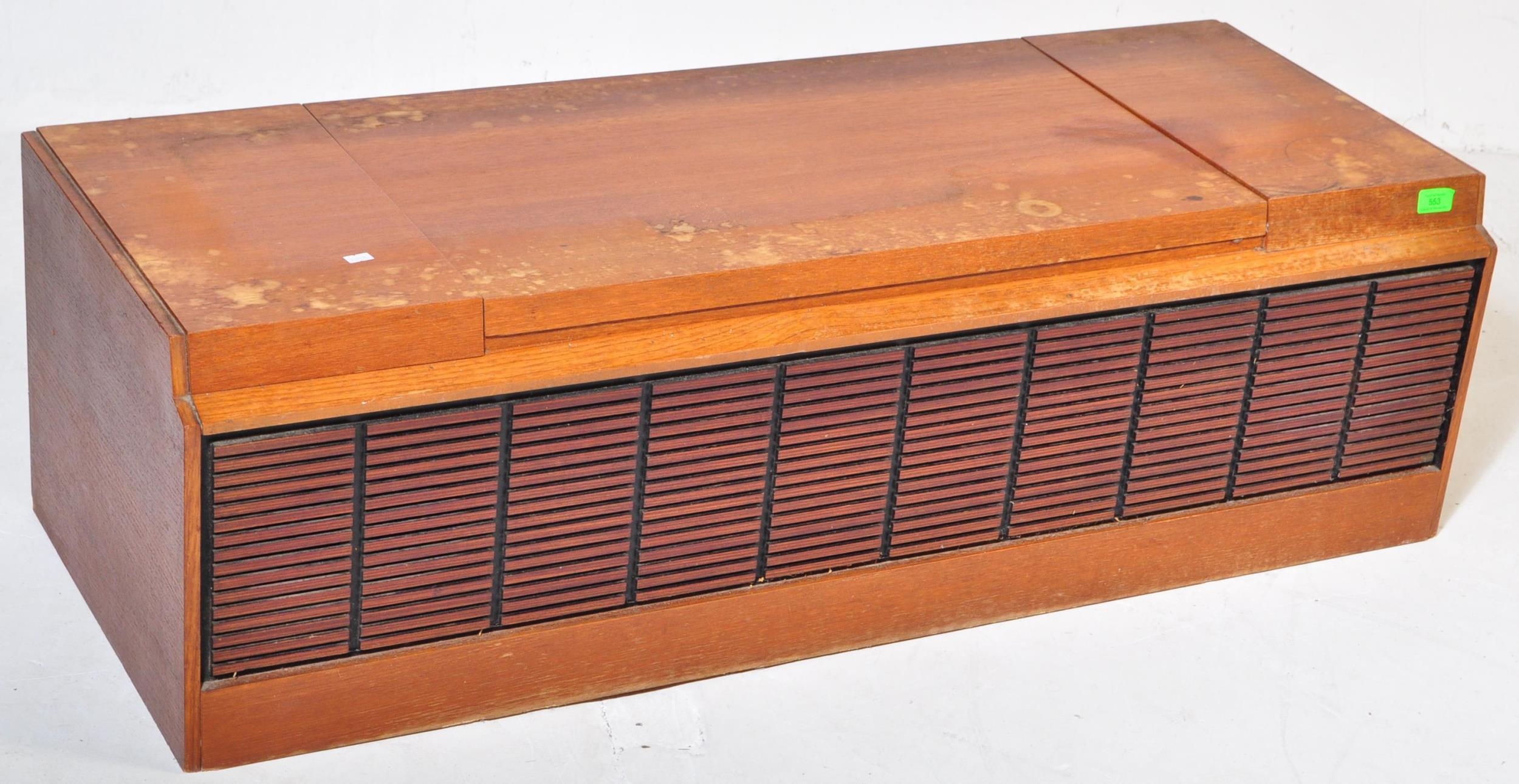 A vintage retro mid 20th century teak stereogram with lift up top. Legs AF but present. Measures approx; 37cm x 123cm x 46cm.