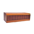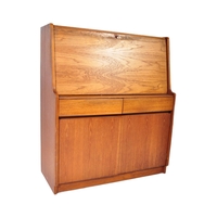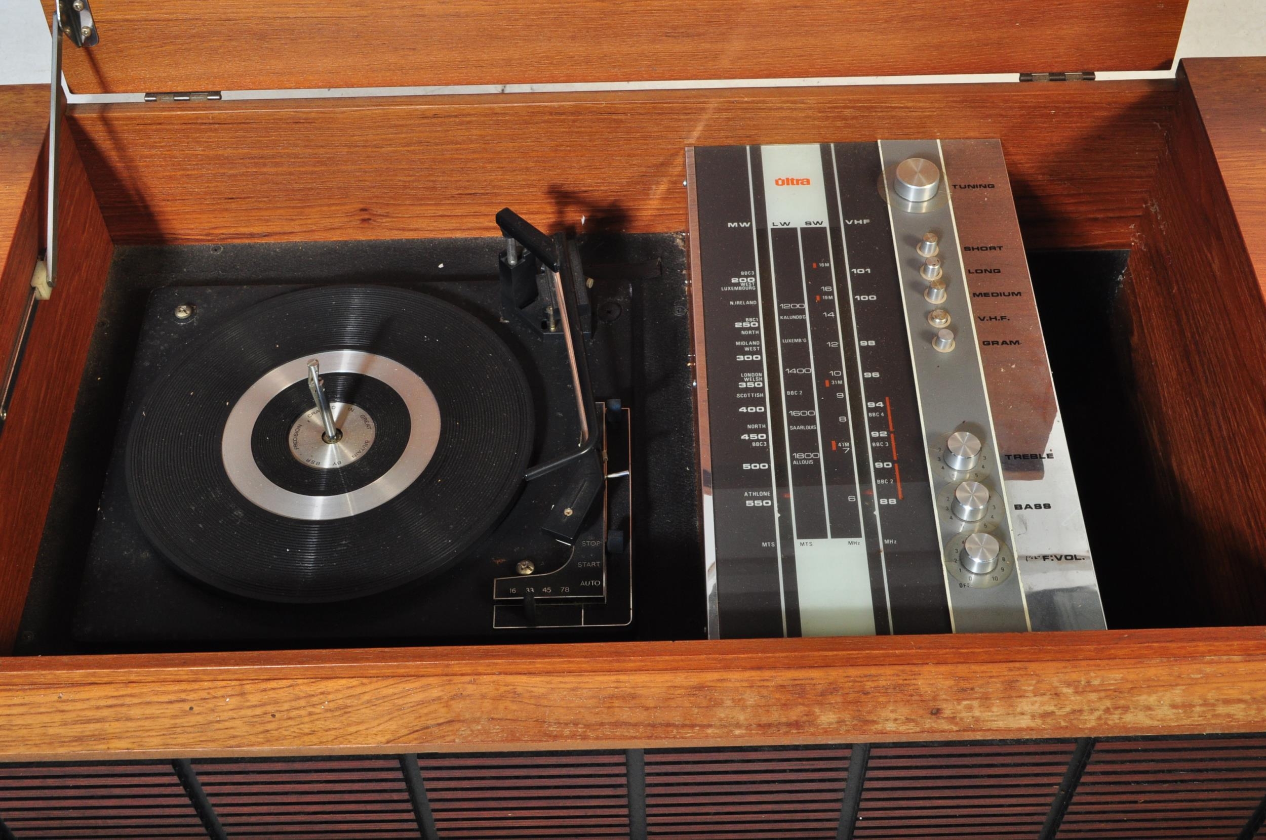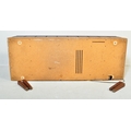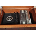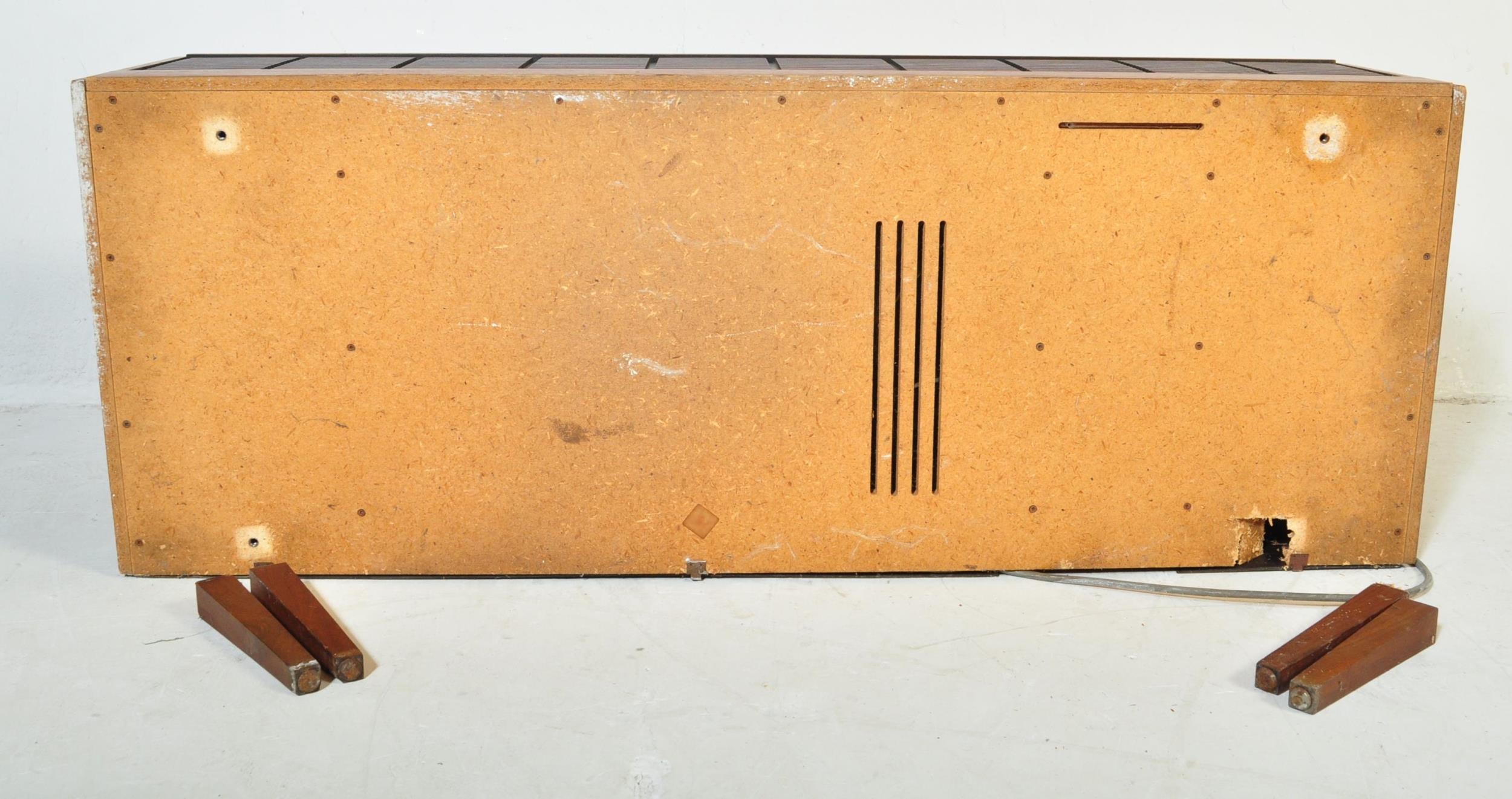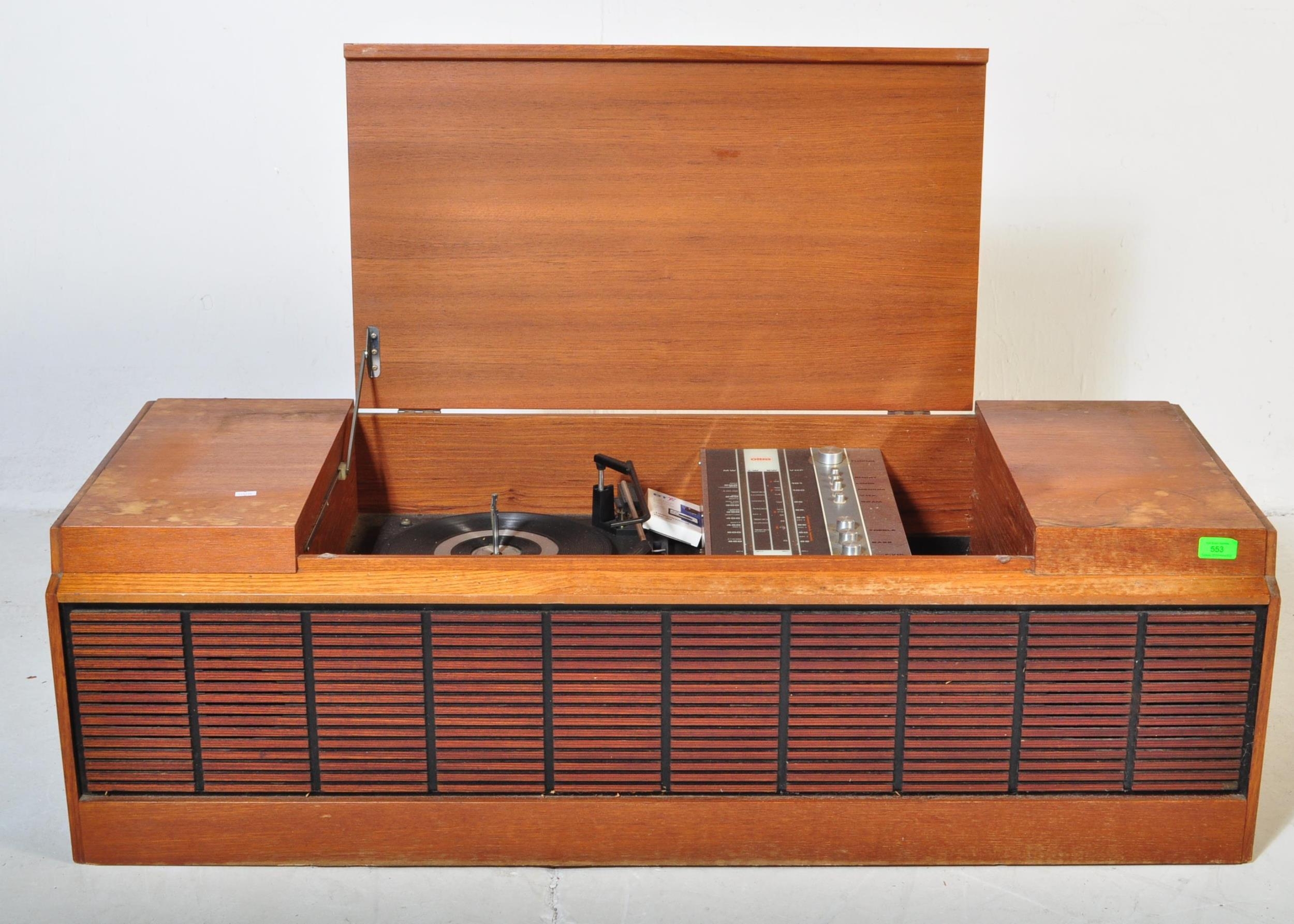 A vintage retro mid 20th century teak stereogram with lift up top. Legs AF but present. Measures approx; 37cm x 123cm x 46cm.