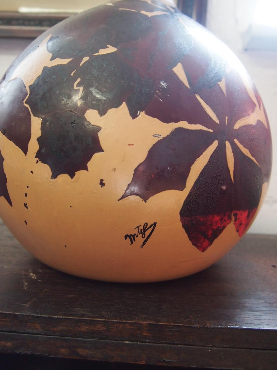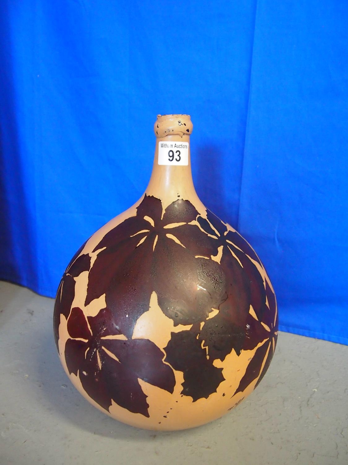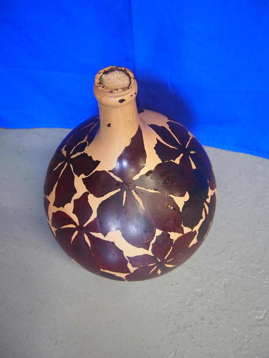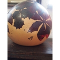 A large vintage/retro French onion shaped glass bottle, hand painted with horse chestnut leaves and signed