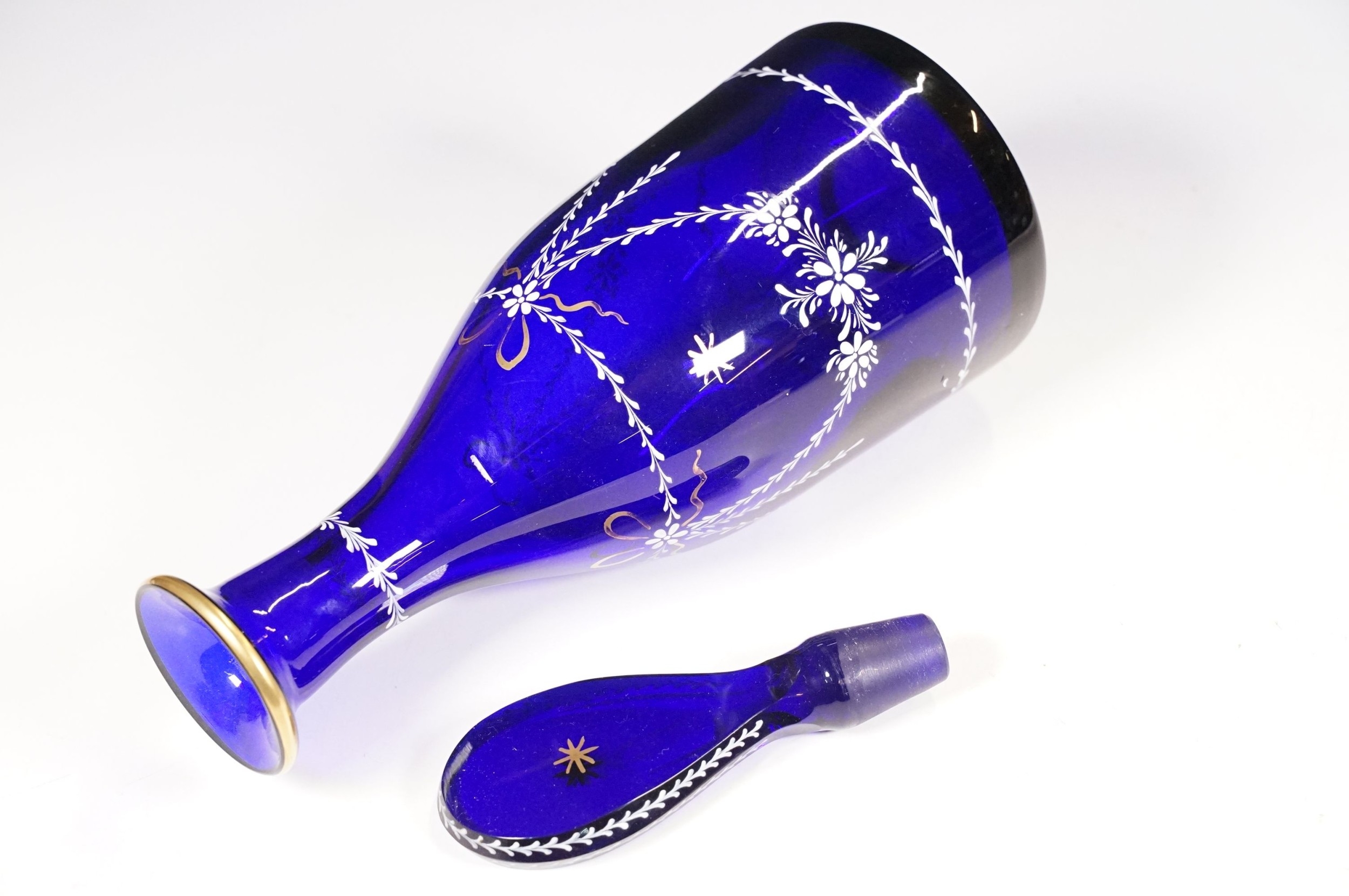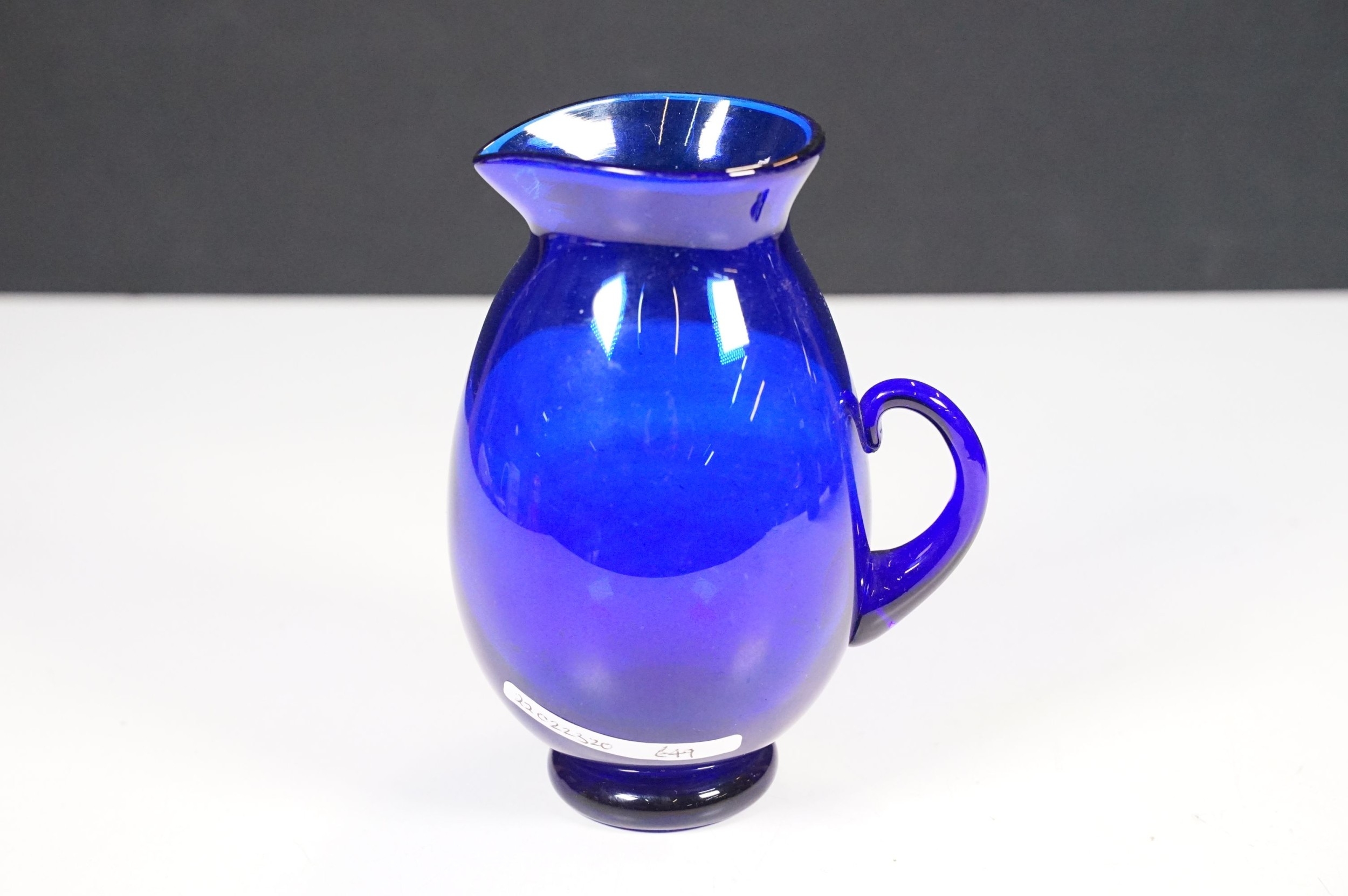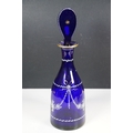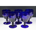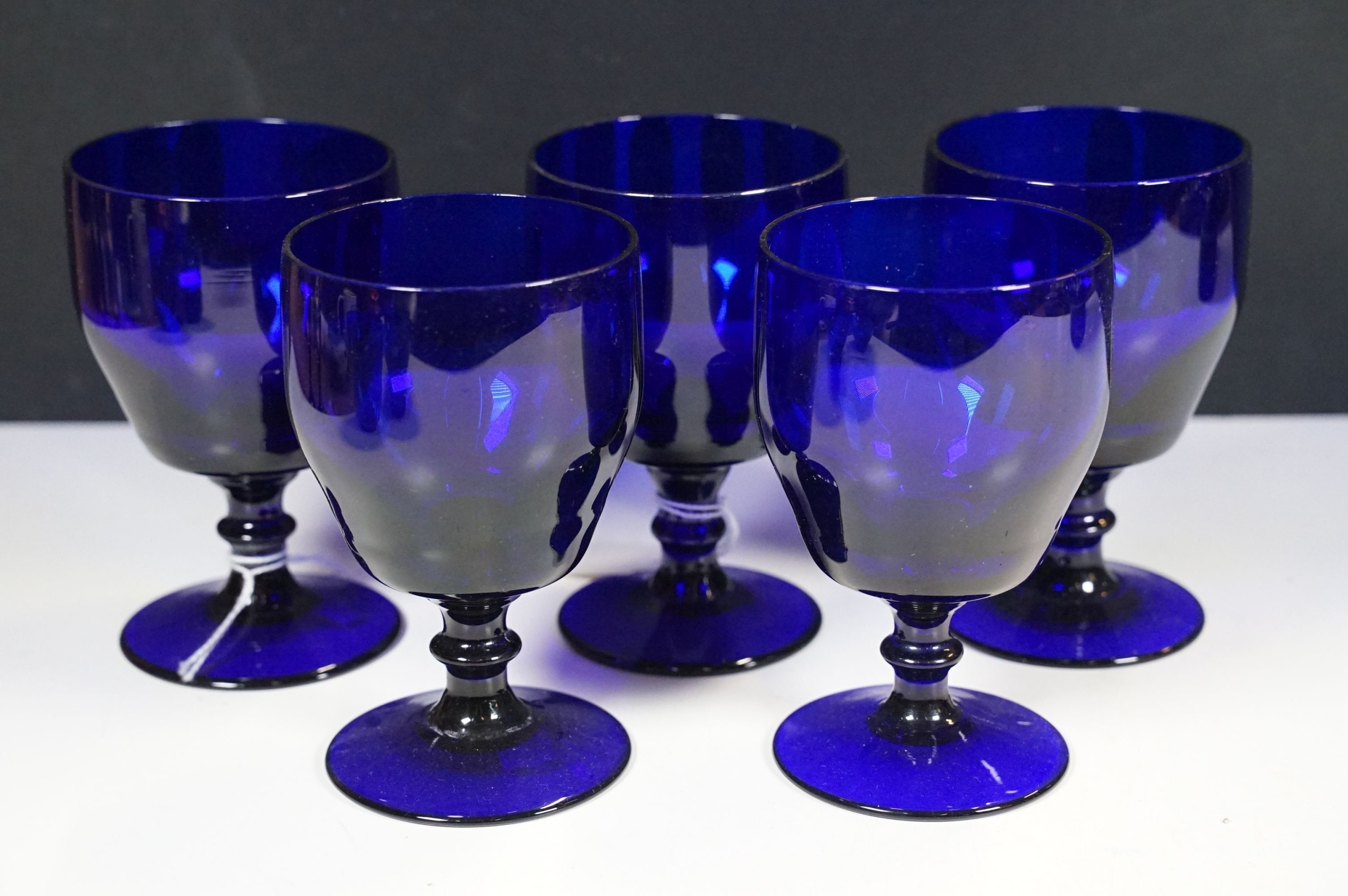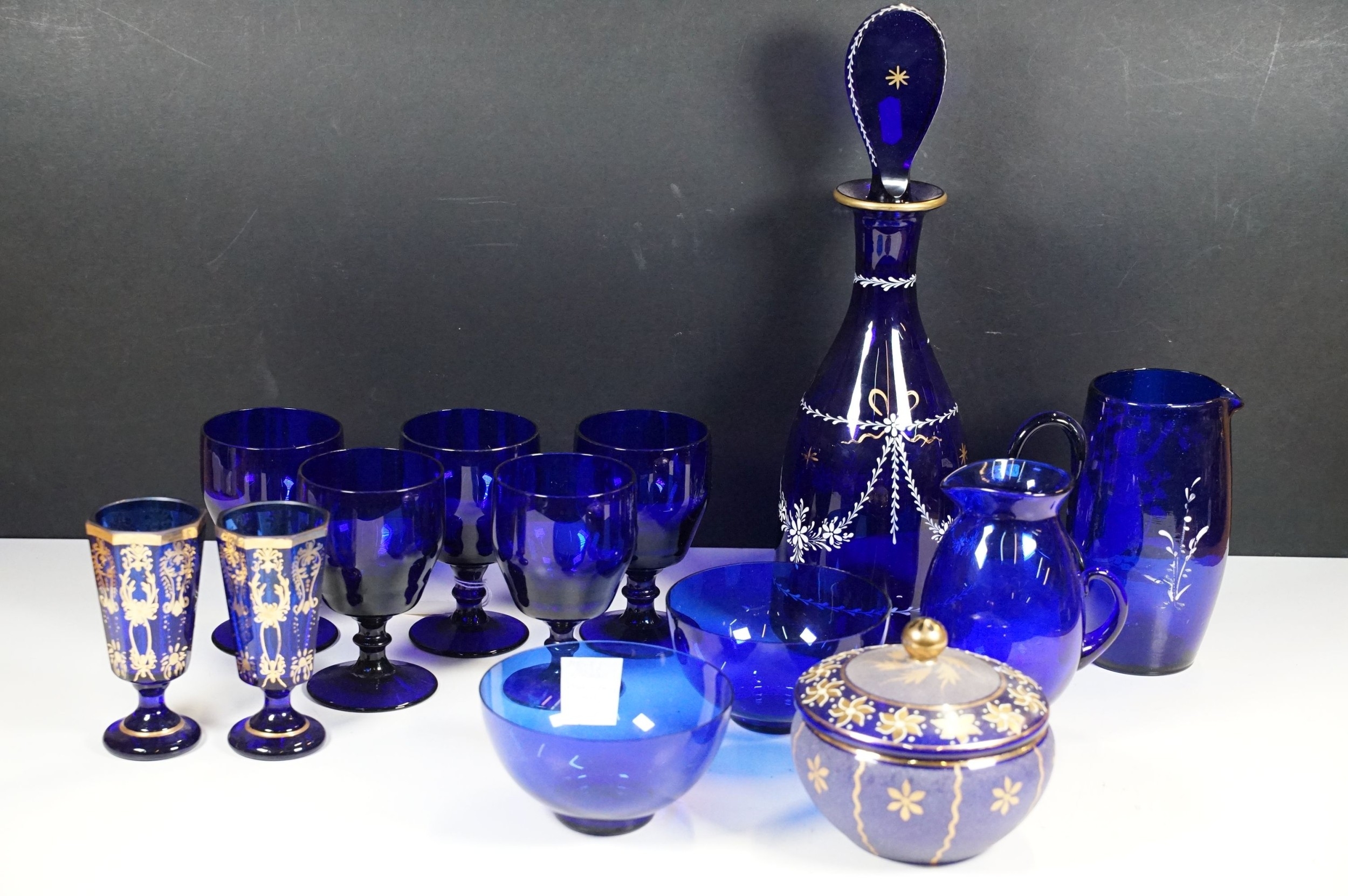 Selection of 19th Century and later Bristol blue glass to include wine glasses, jug, sugar bowl and gilt decorated frosted lidded jar, decanter and pair of vases, etc
