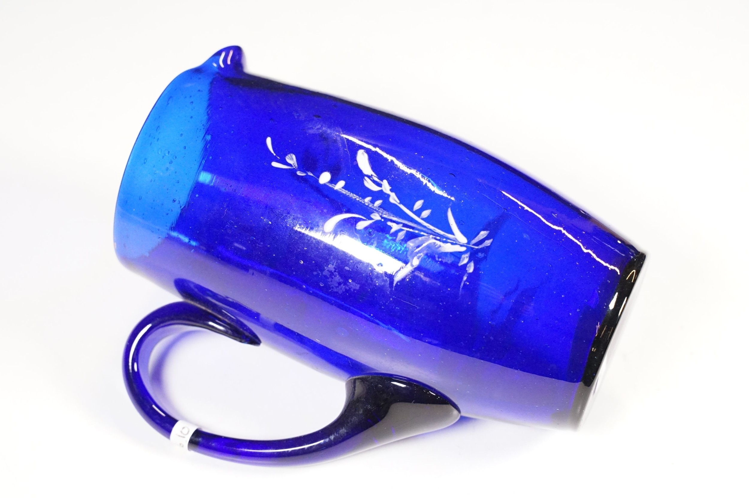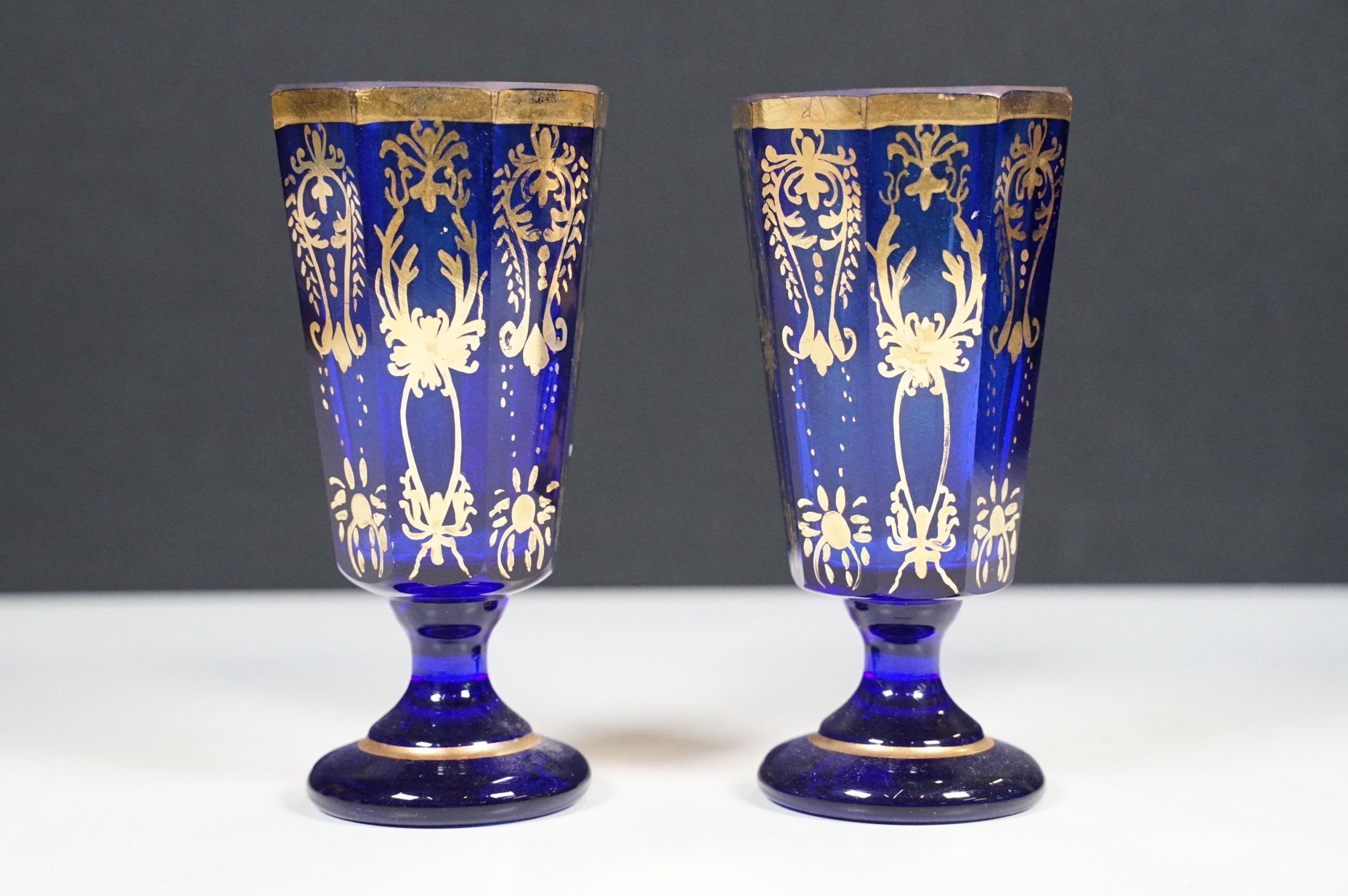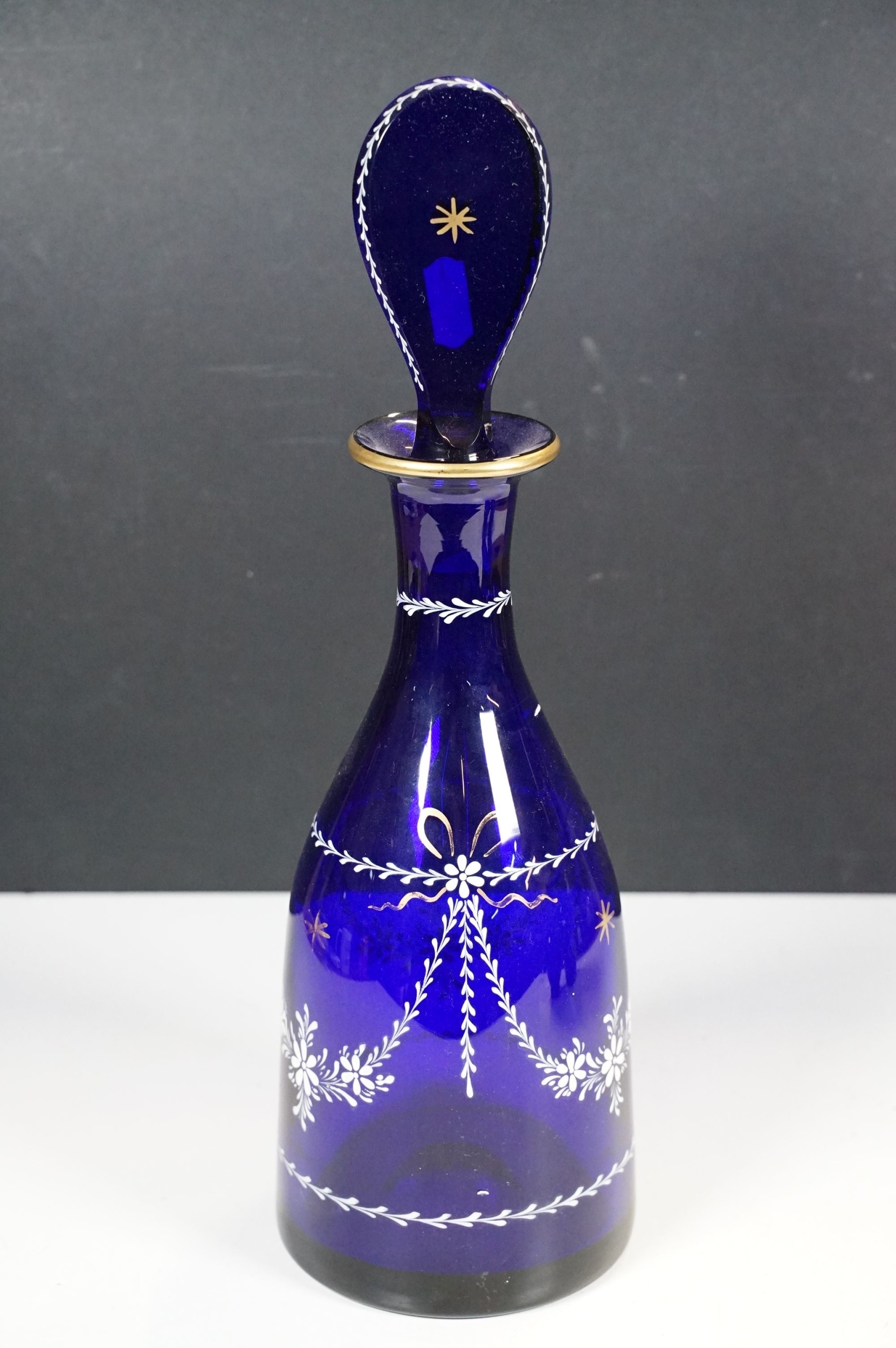 Selection of 19th Century and later Bristol blue glass to include wine glasses, jug, sugar bowl and gilt decorated frosted lidded jar, decanter and pair of vases, etc