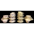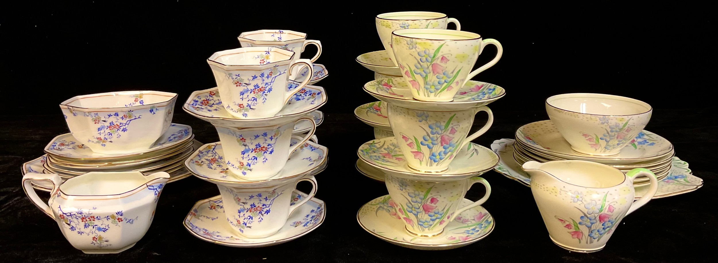 A Royal Doulton Art Deco octagonal tea service for six, pattern H3917, comprising cake plate, cream jug, sugar bowl, side plates, cups and saucers; another, Foley China, qty