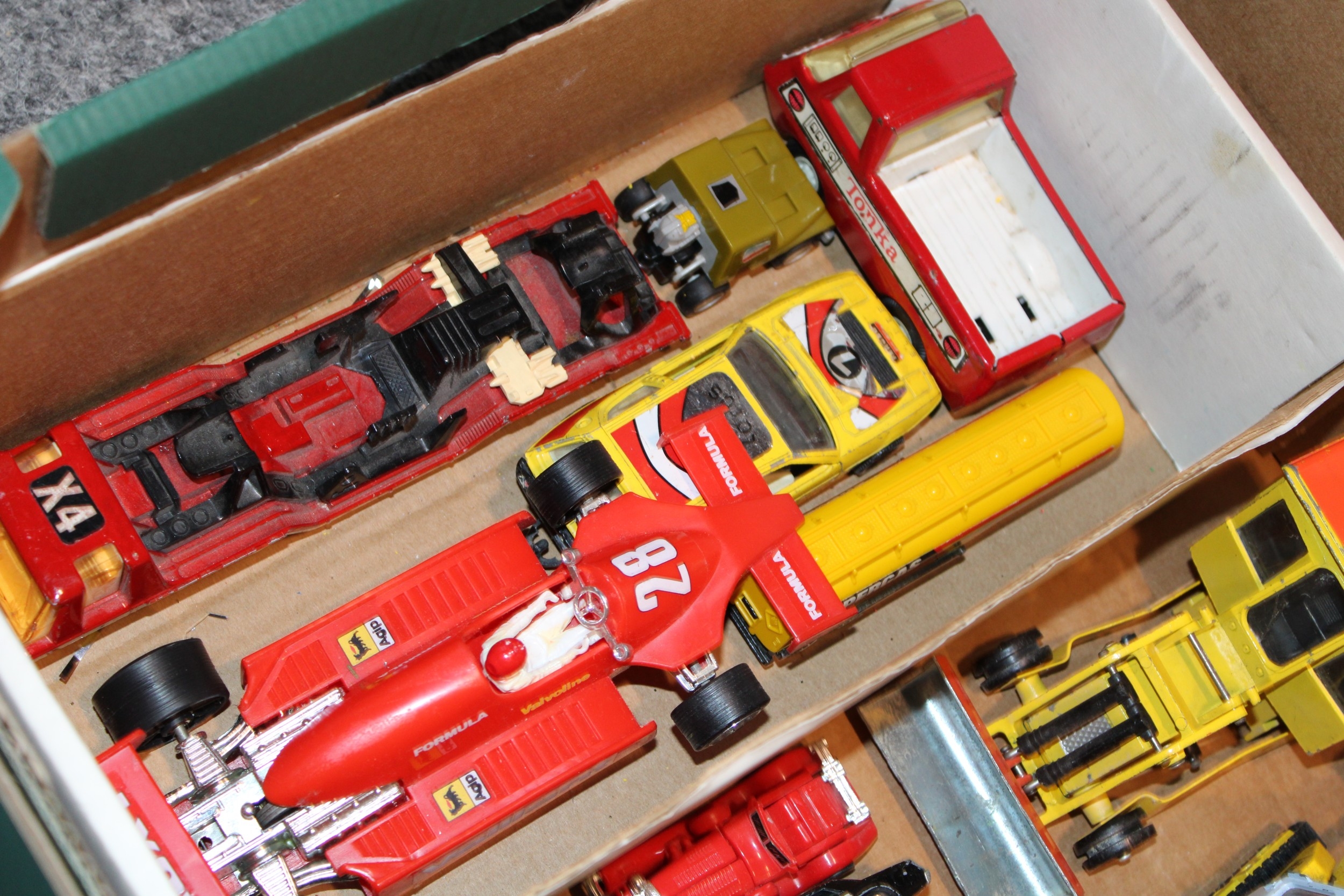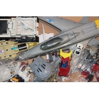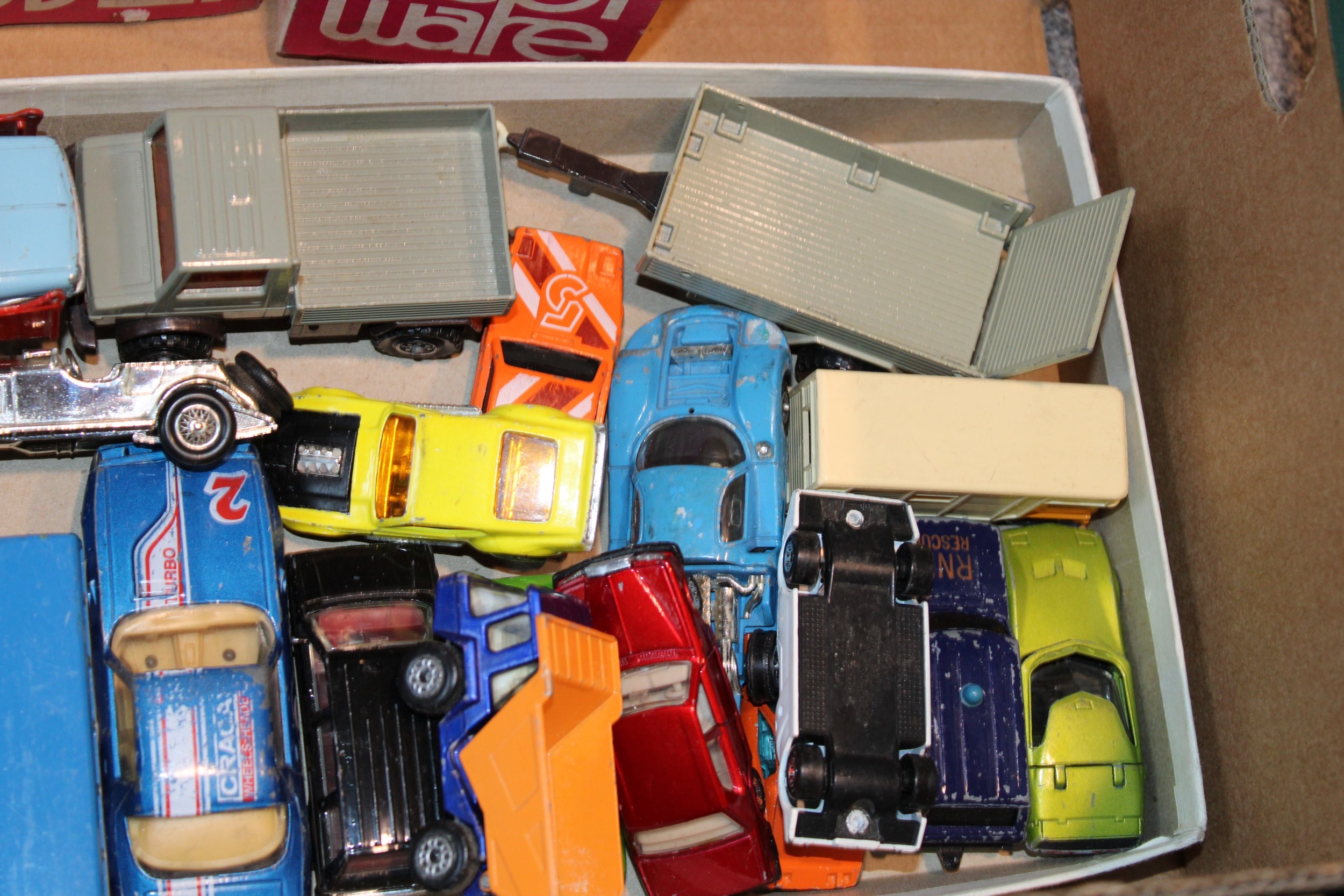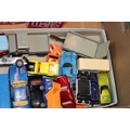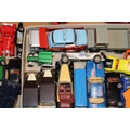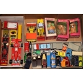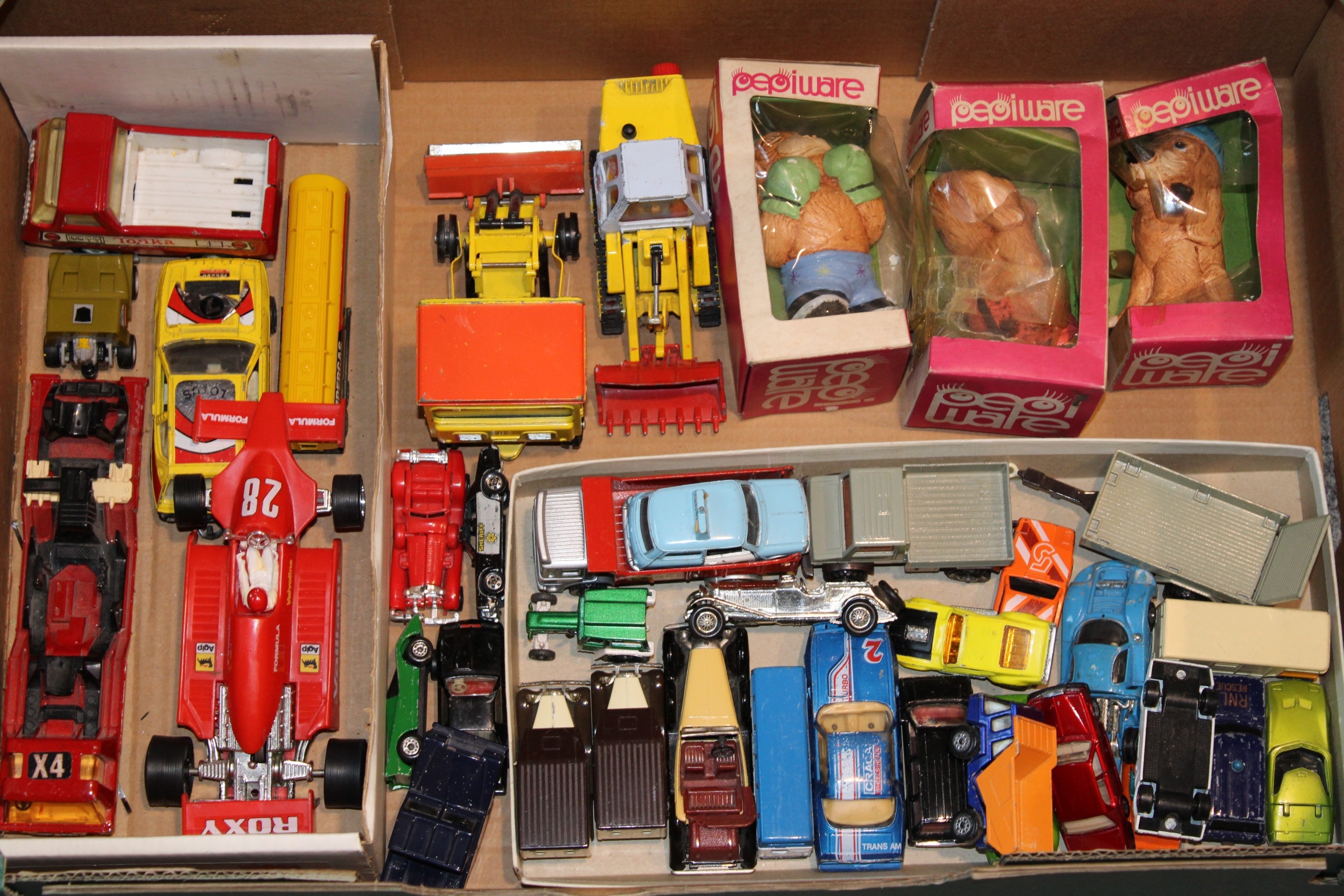 A group of vintage die cast toys to include Dinky Toys Shovel Dozer, Corgi Major Toys JCB, Matchbox Superkings Unimog and Trailer, together with three boxed Pepiware figures, (Qty).