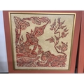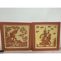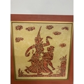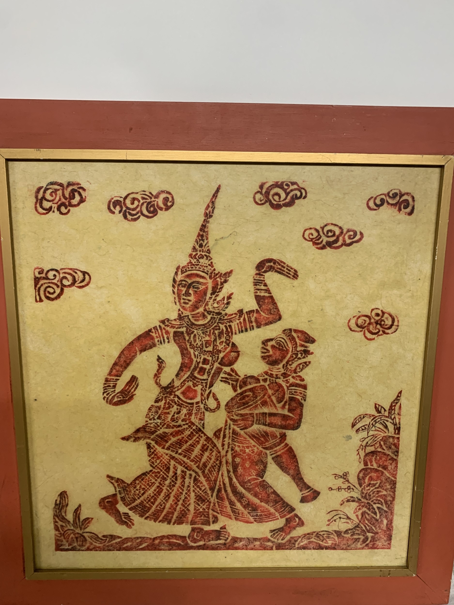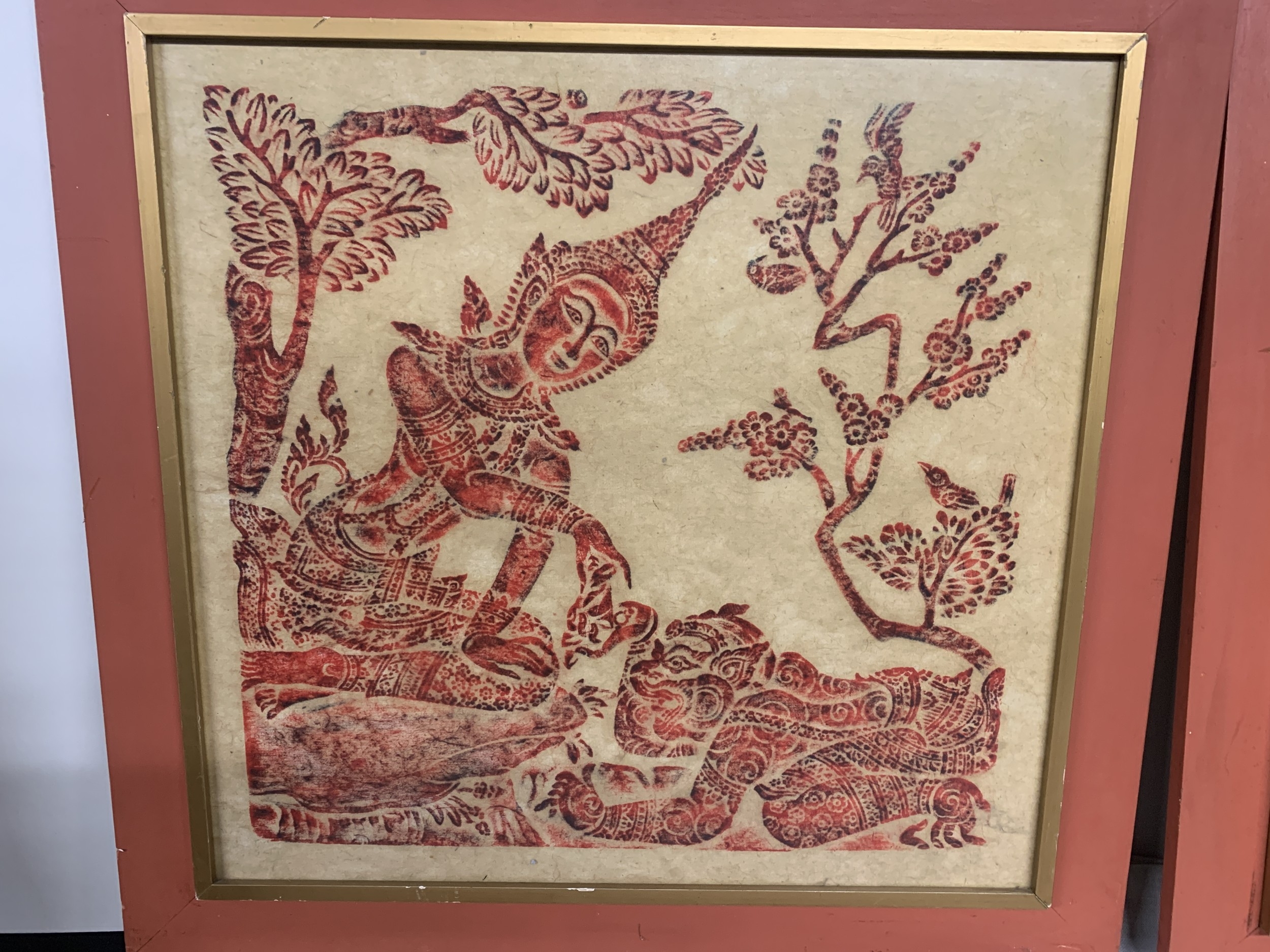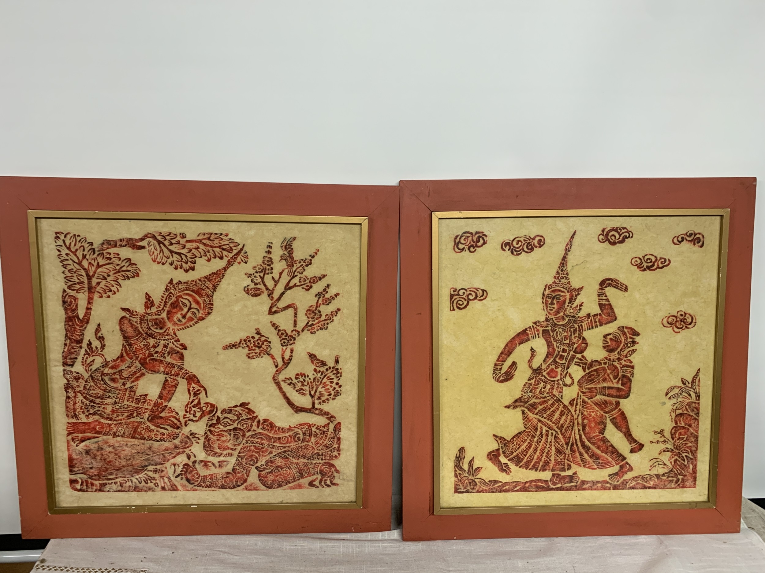 A PAIR OF VINTAGE THAI TEMPLE RUBBINGS ON RICE PAPER DEPICTING A THAI FEMALE DANCER AND MUSICIAN AND A THAI FEMALE AND CROUCHING TIGER - 48 X 46.5 CM (NOT INCLUDING THE FRAME)