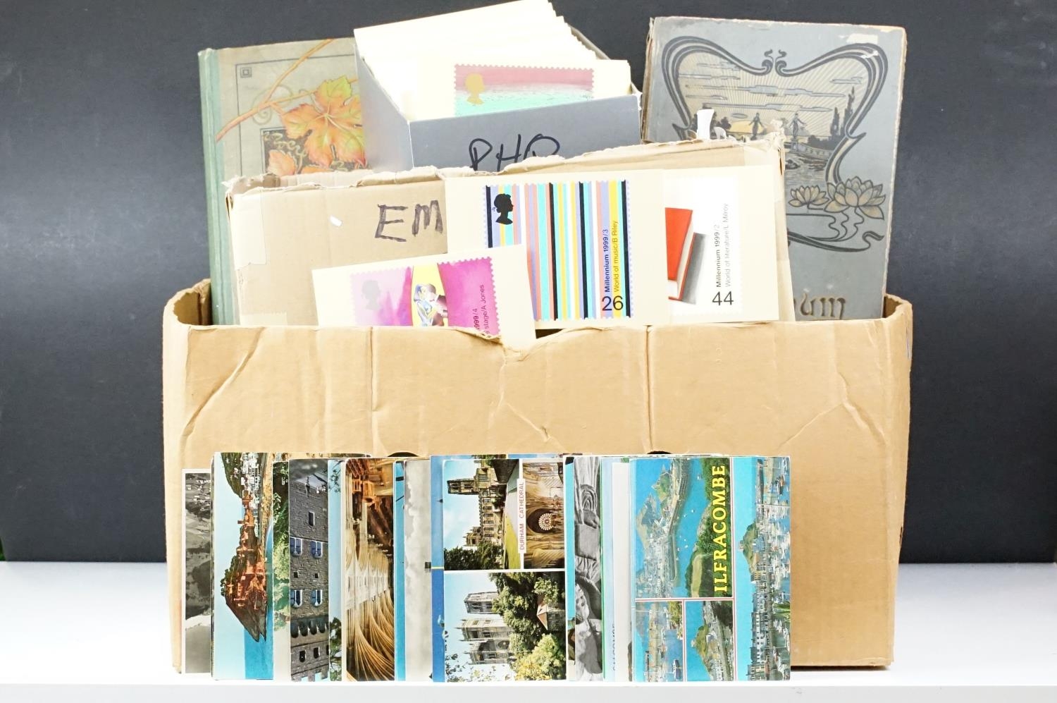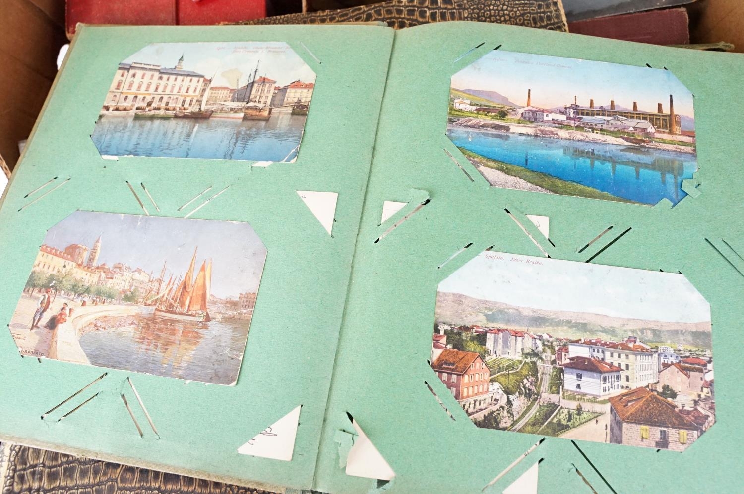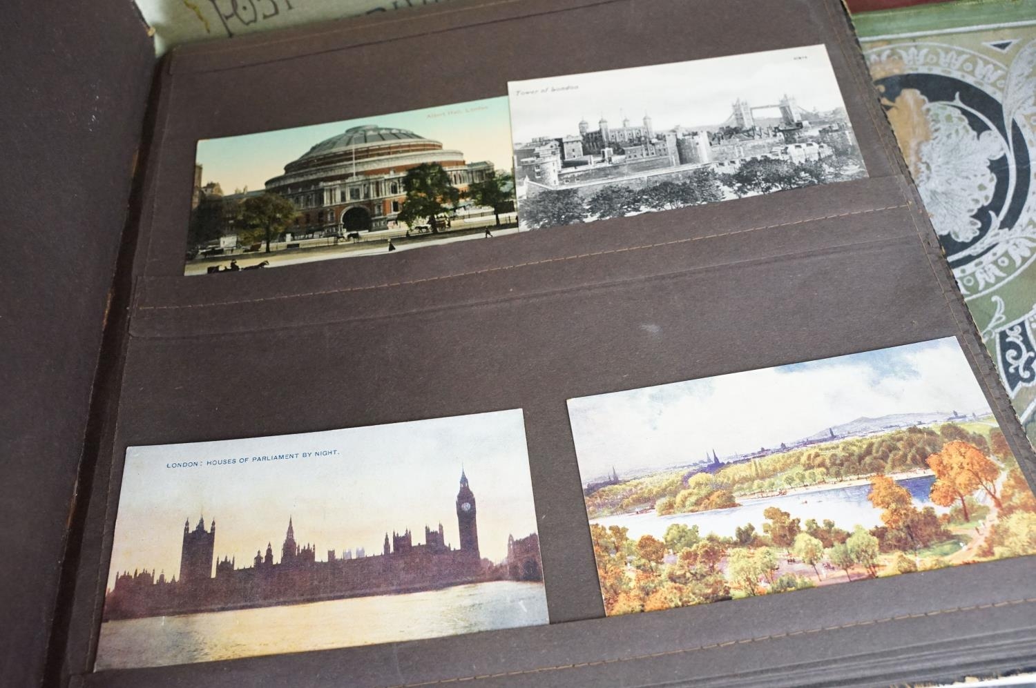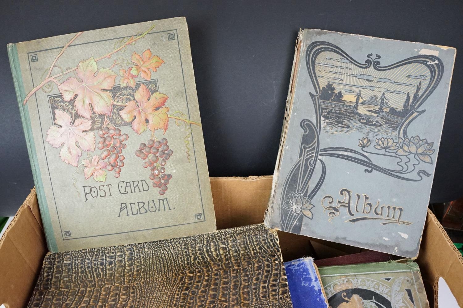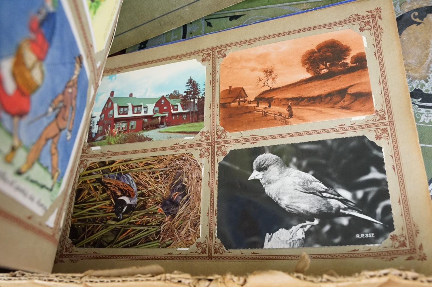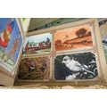Collection of early 20th Century postcards across multiple albums to include World War One interest cards, greetings cards and topographical examples. Together with a collection of later 20th Century topographical cards and a collection of post office stamp postcards. 2 boxes.