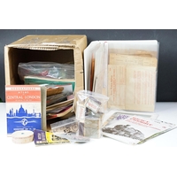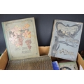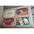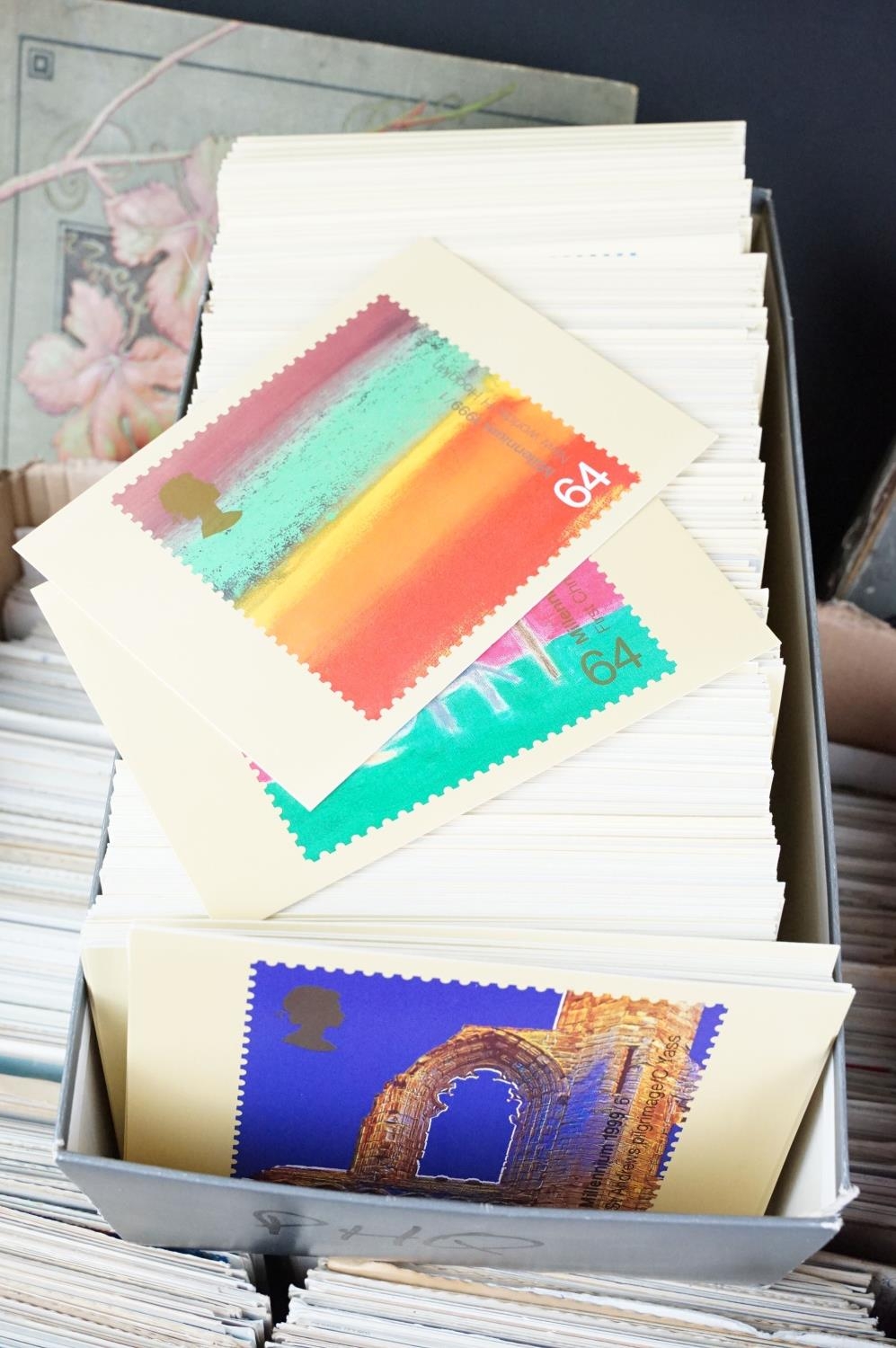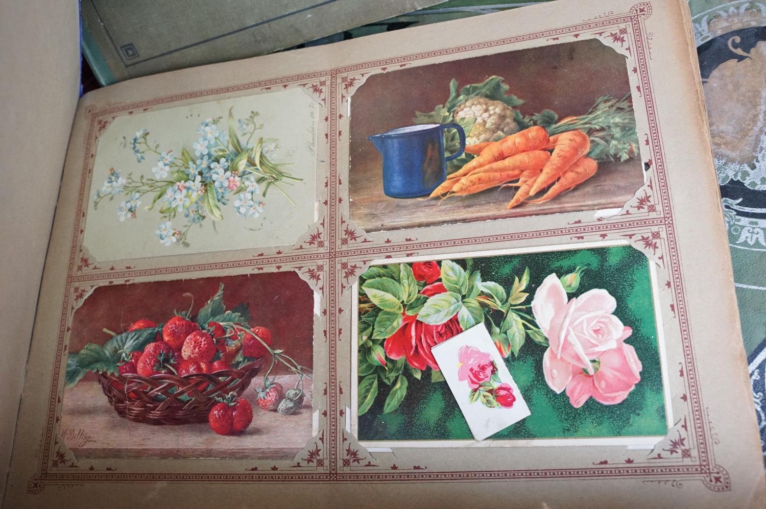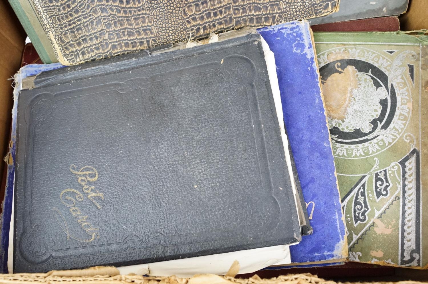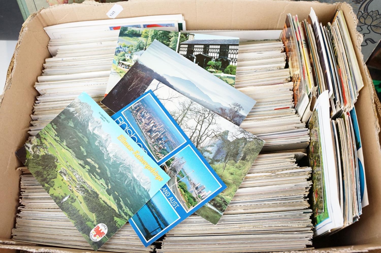 Collection of early 20th Century postcards across multiple albums to include World War One interest cards, greetings cards and topographical examples. Together with a collection of later 20th Century topographical cards and a collection of post office stamp postcards. 2 boxes.