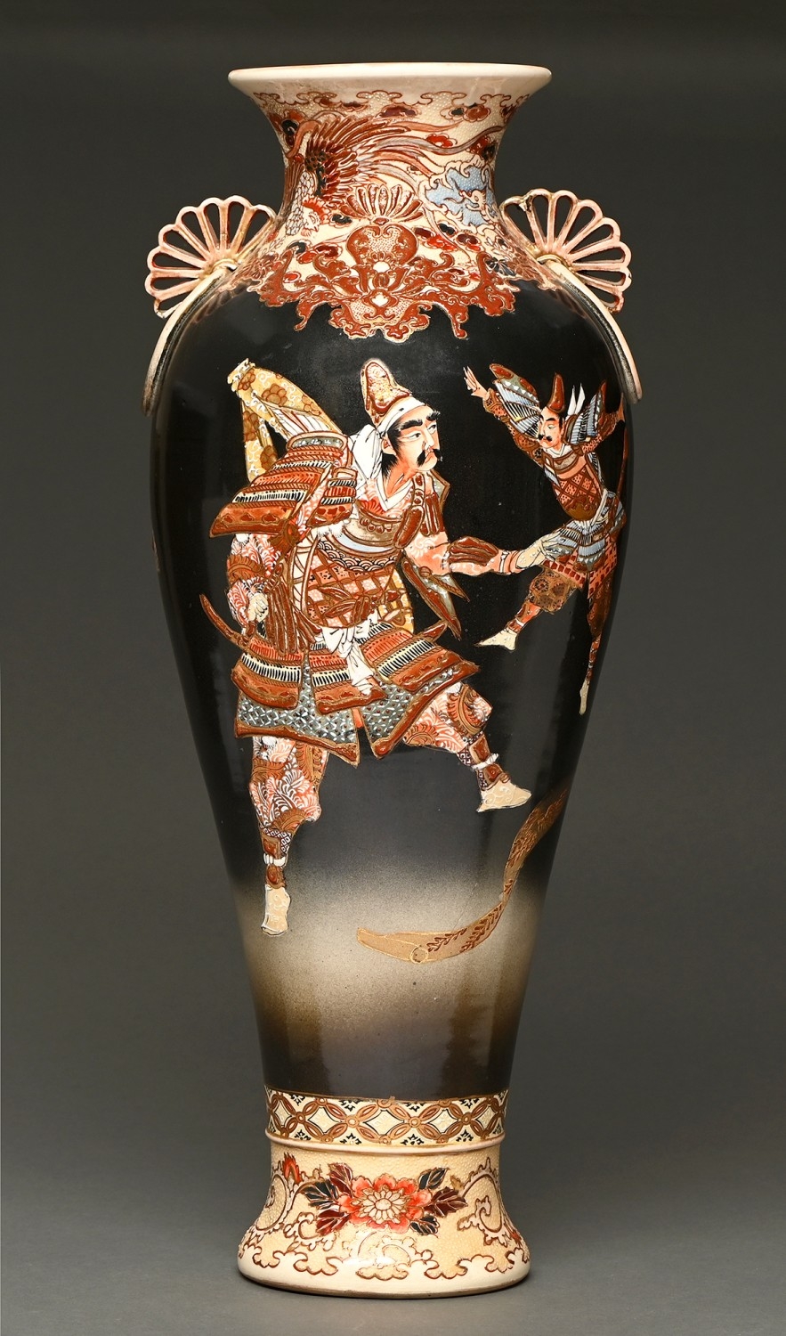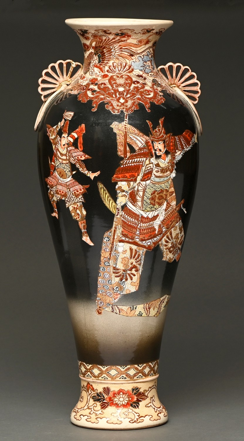 A Japanese Satsuma baluster vase, first half 20th c, painted with samurai, with reticulated fan handles, 57cm h, painted mark