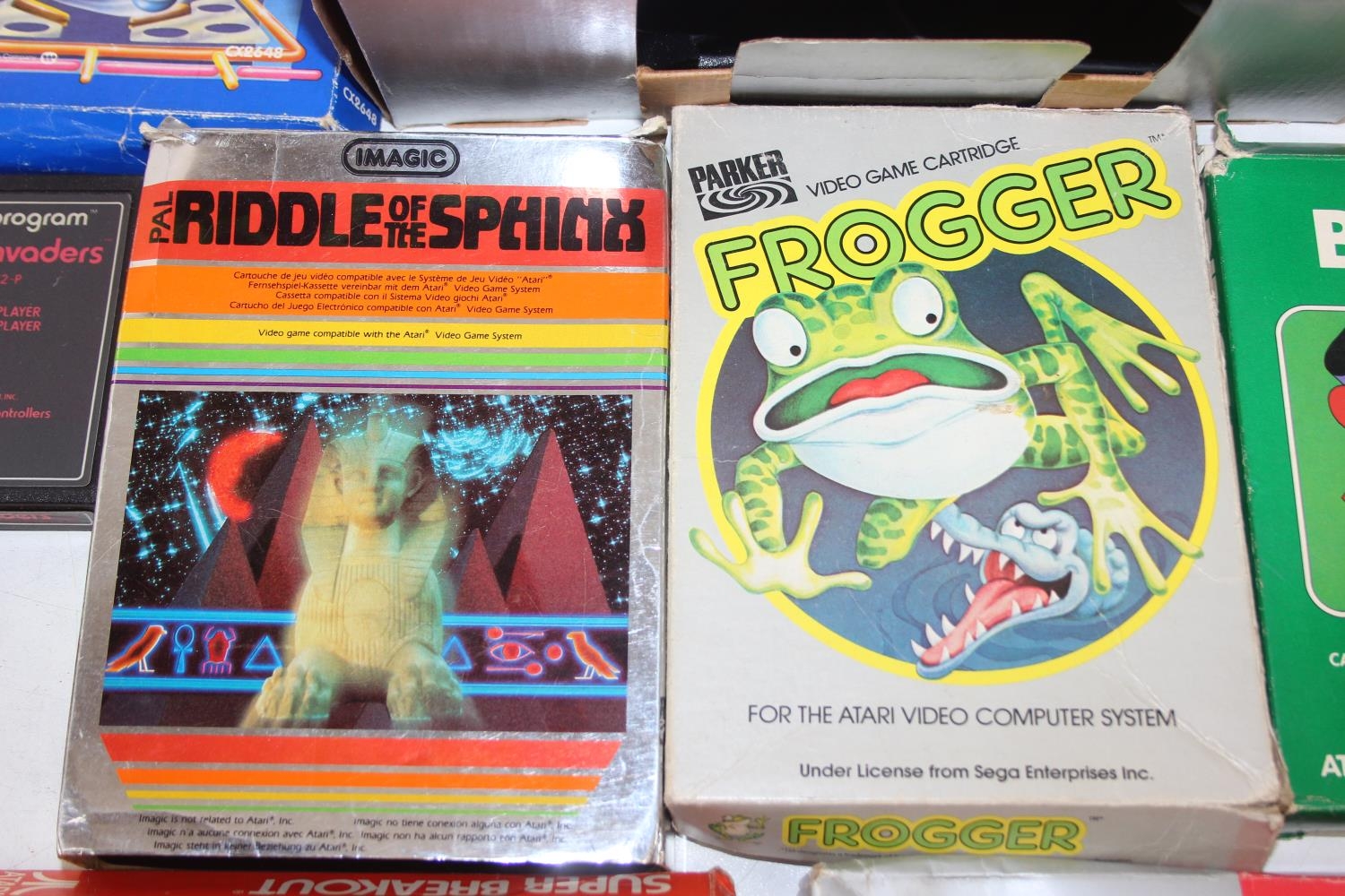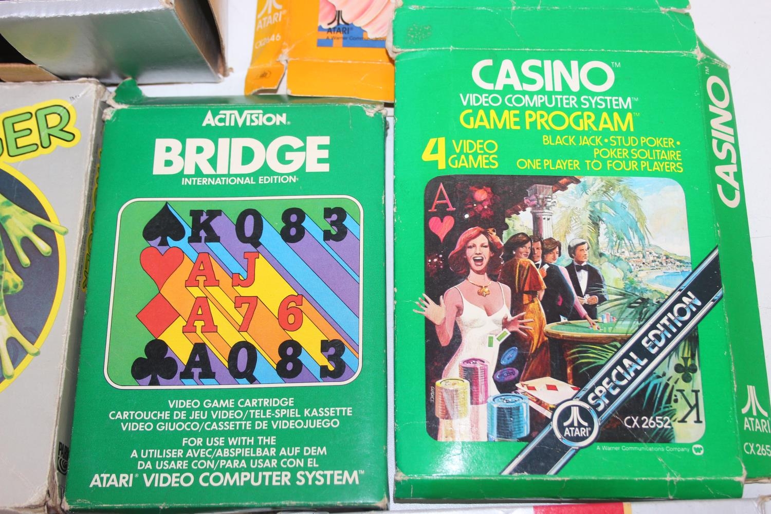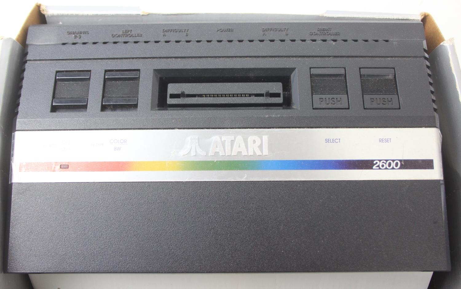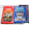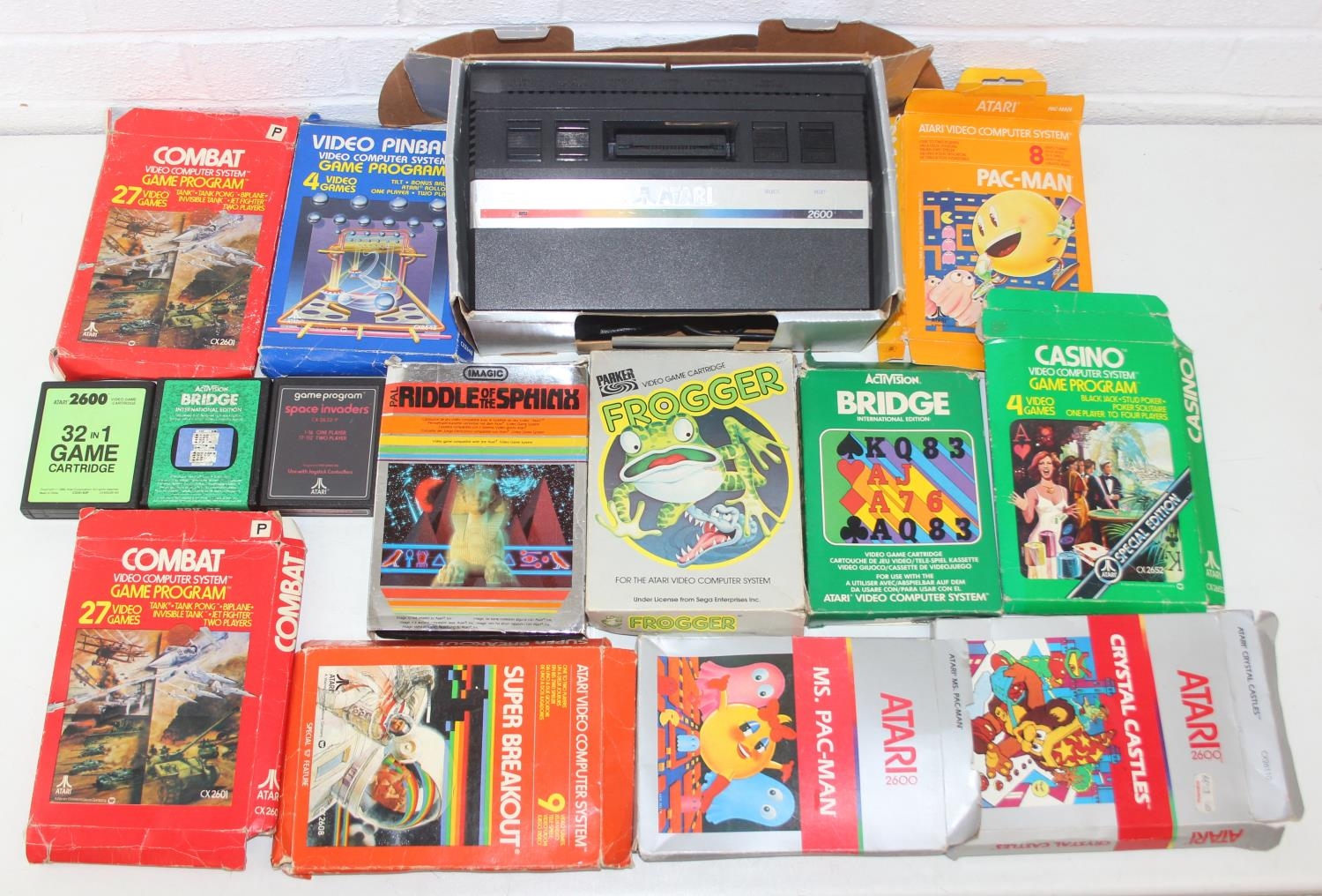 Atari 2600 video game console, boxed with original accessories with 11 boxed games to include Pac Man, Ms Pac Man, Casino 4 in 1, Frogger, Bridge, two copies of Combat 27 in 1, Riddle of the Sphinx, Crystal Castles, Video Pinball and super breakout and three unboxed to include bridge, Space Invaders and 32 in 1 games compendium