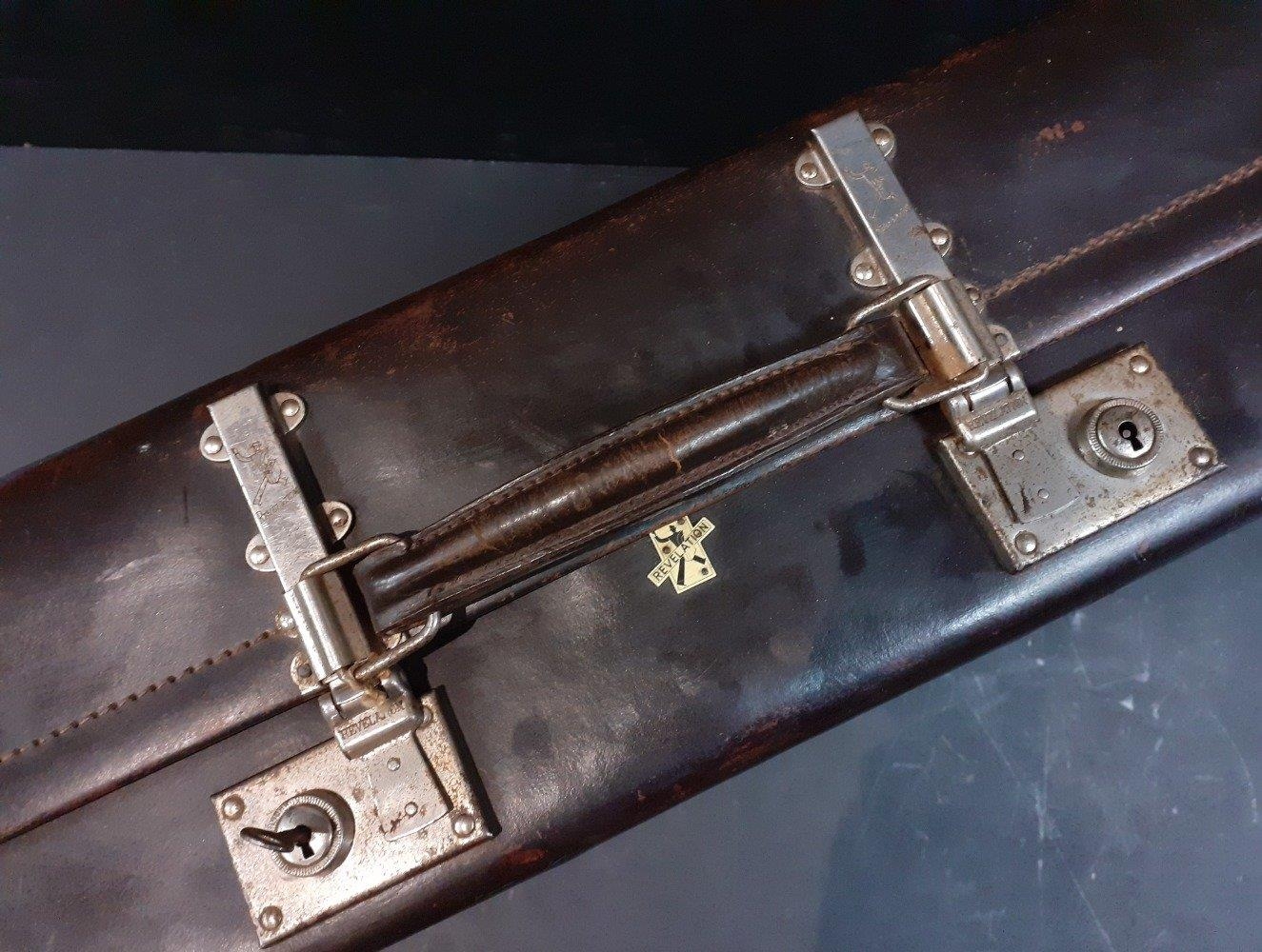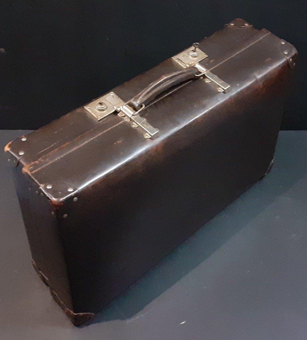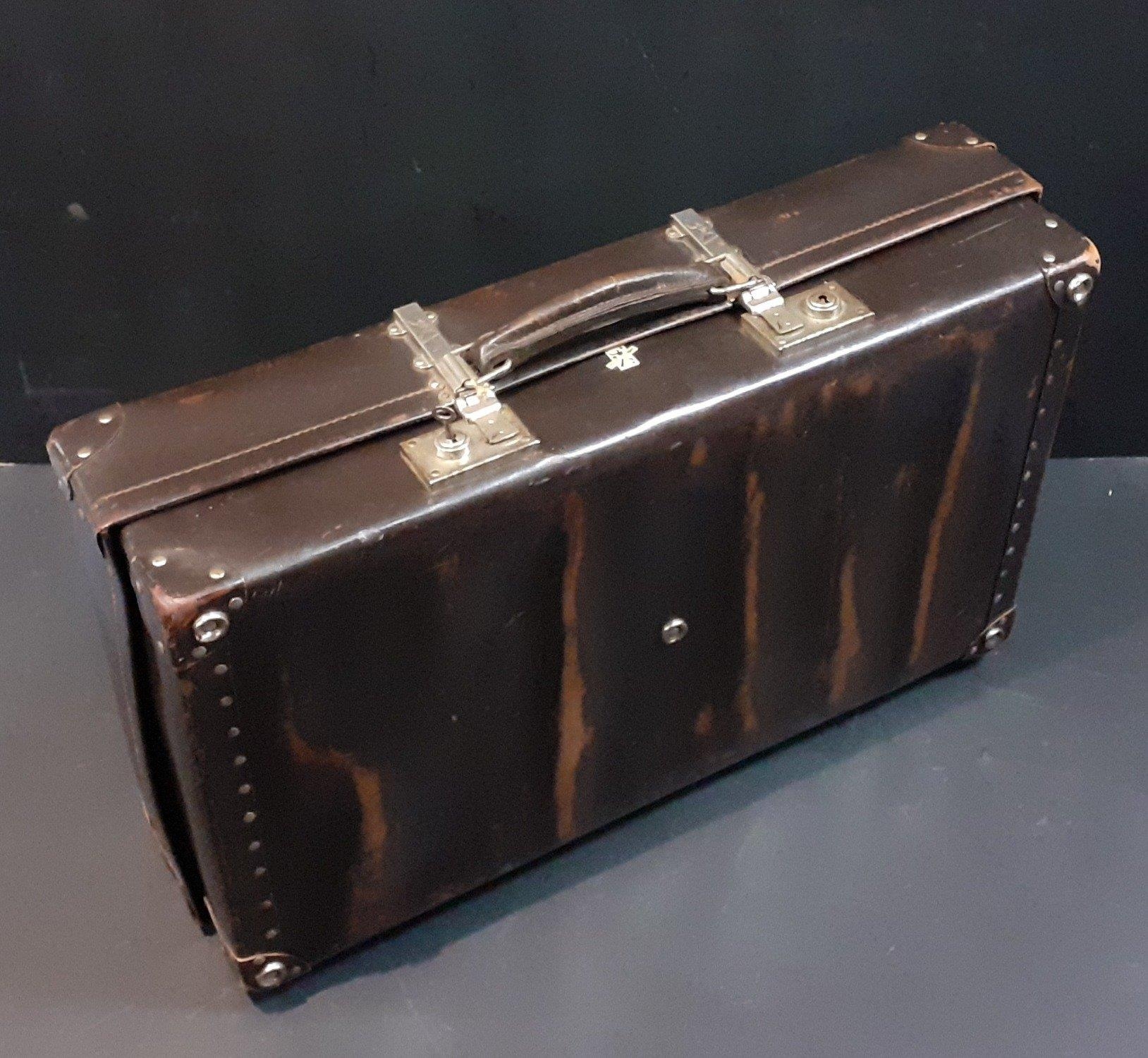 An antique suitcase. Large and decorative and in good condition, displays well. Measures 66cm x 40cm x 18cm.