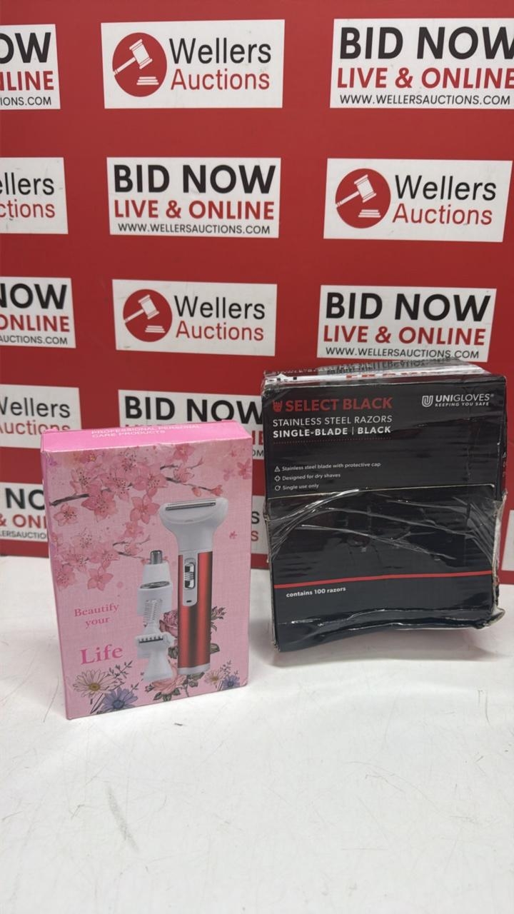 NEW BOX OF 100 RAZORS AND A PORTABLE MINI SHAVER