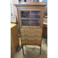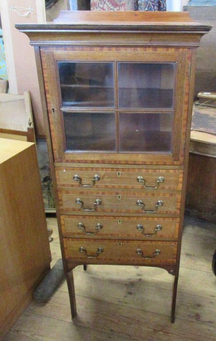 An Edwardian mahogany and satinwood cabinet, fitted with a glazed door over four long drawers, 20.5ins x 14.25ins, height 46.5ins
