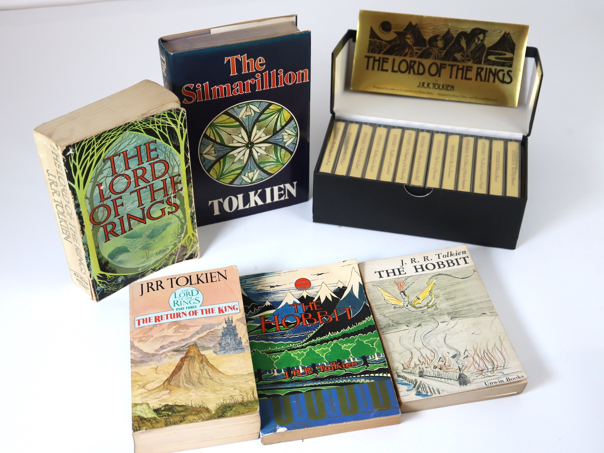 Lord of The Rings Cassette Box Set Tapes in 13 episodes by Brian Sibley 1987, plus paperback sof The Lord of The Rings, The Hobbit ( two editions), The Return of The King + Hardback of The Silmarillion