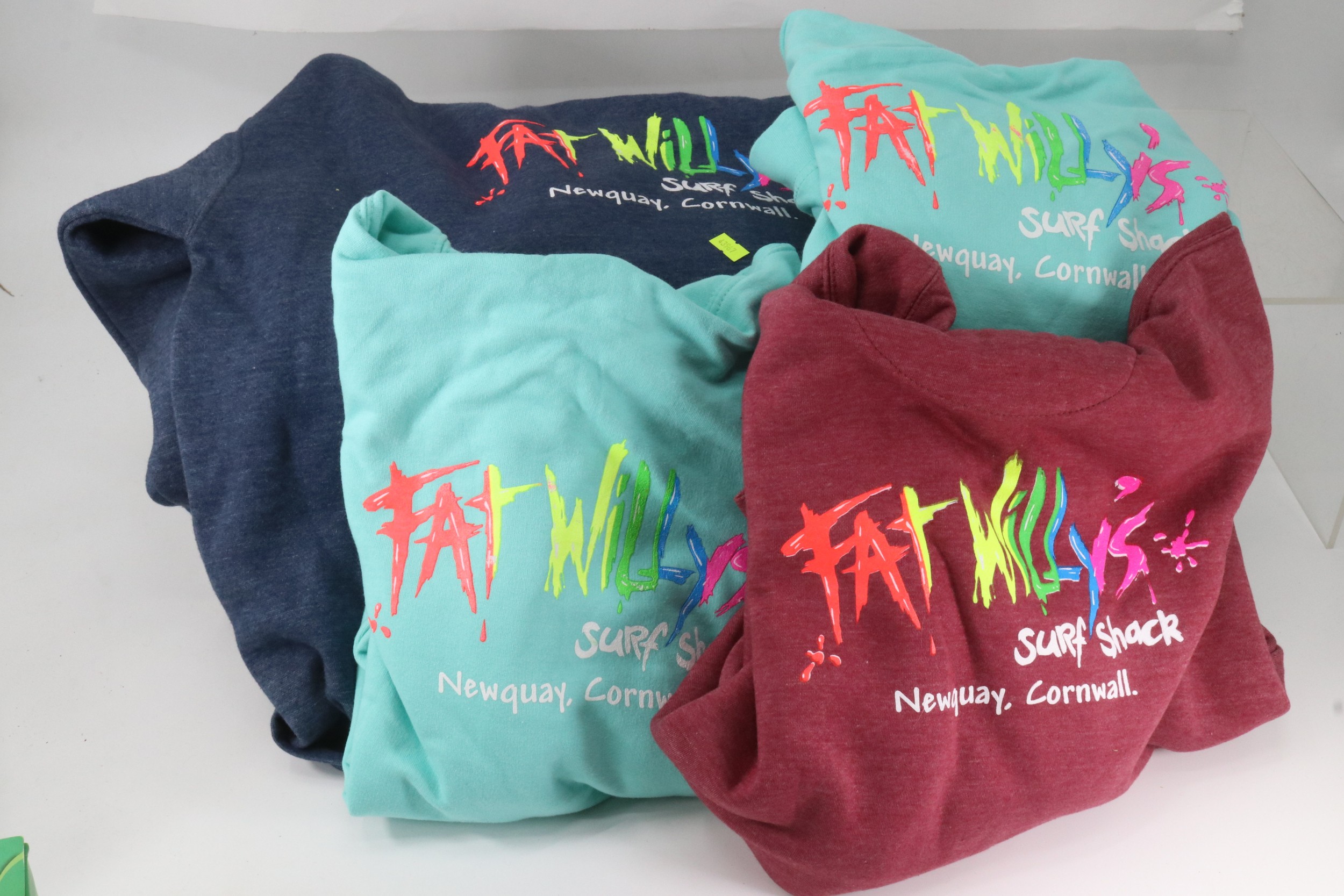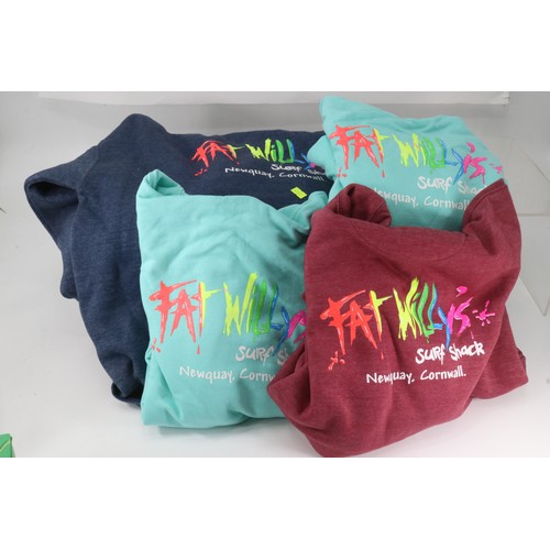 Four Fat Willy's surf shack hoodies, two size 12/13, one medium and one XL