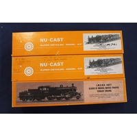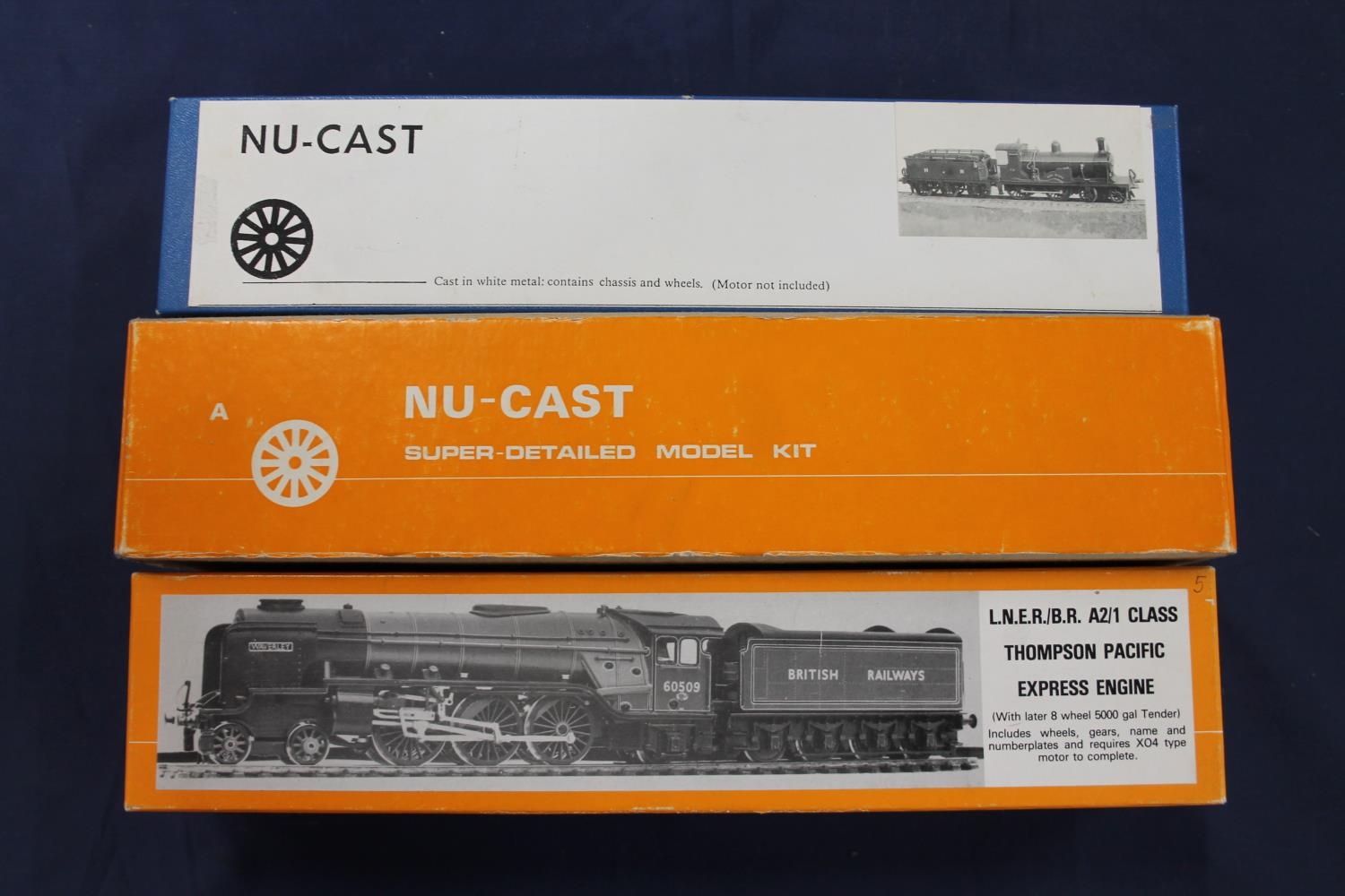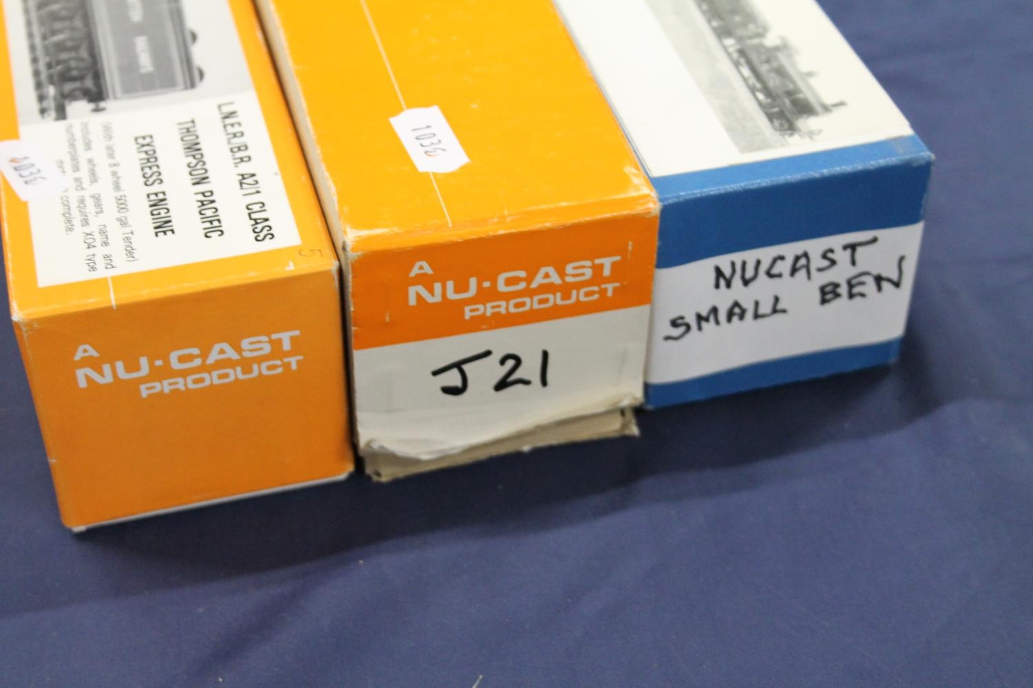 Three Nu-Cast (Nucast) OO gauge super detailed model kit locomotives including 4-6-2 Robert The Bruce tender locomotive BR 60510 green (built), 0-6-0 tender locomotive 65033 BR black (built) and NC217 4-4-0 Small Ben tender locomotive, each boxed but not checked for completeness. (3)