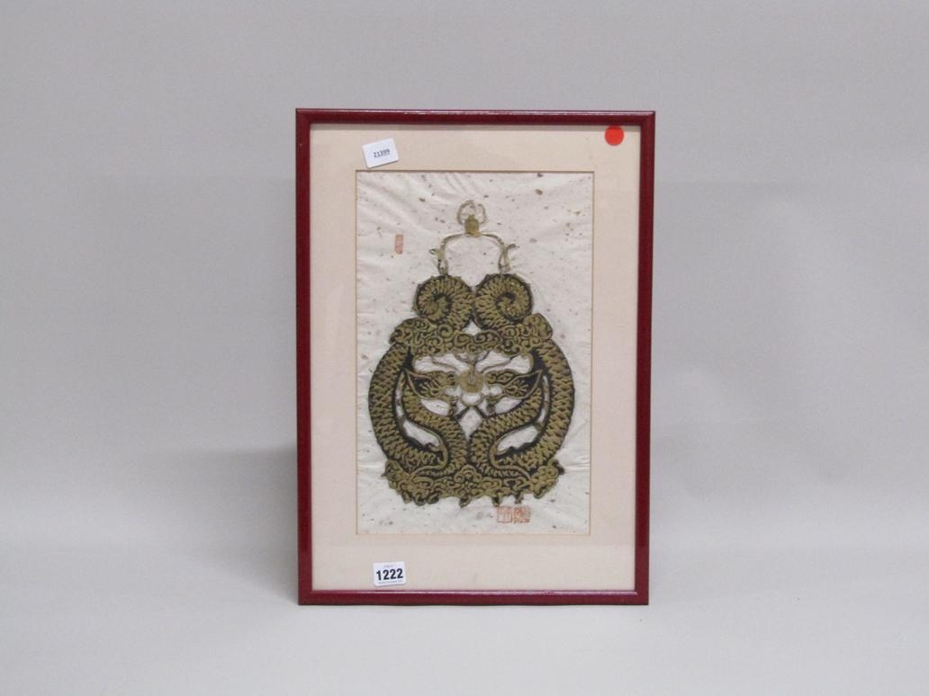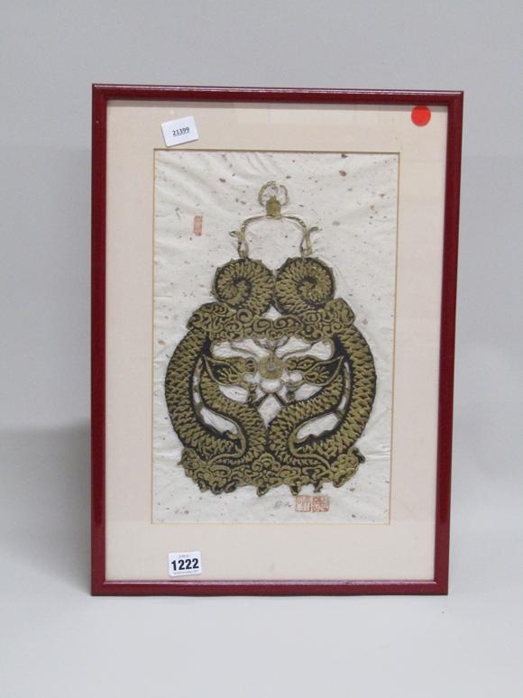 ORIENTAL F/G COLLAGE WITH GILT THREAD HIGHLIGHTS - TWO OPPOSING DRAGONS WITH SEAL STAMP