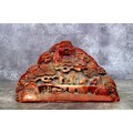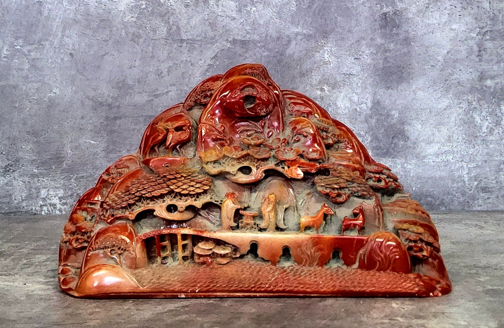 A Chinese carved soapstone scholars calligraphy weight decorated in relief with cranes in flight amongst the boulder out crops and flowering prunus with immortals drinking tea