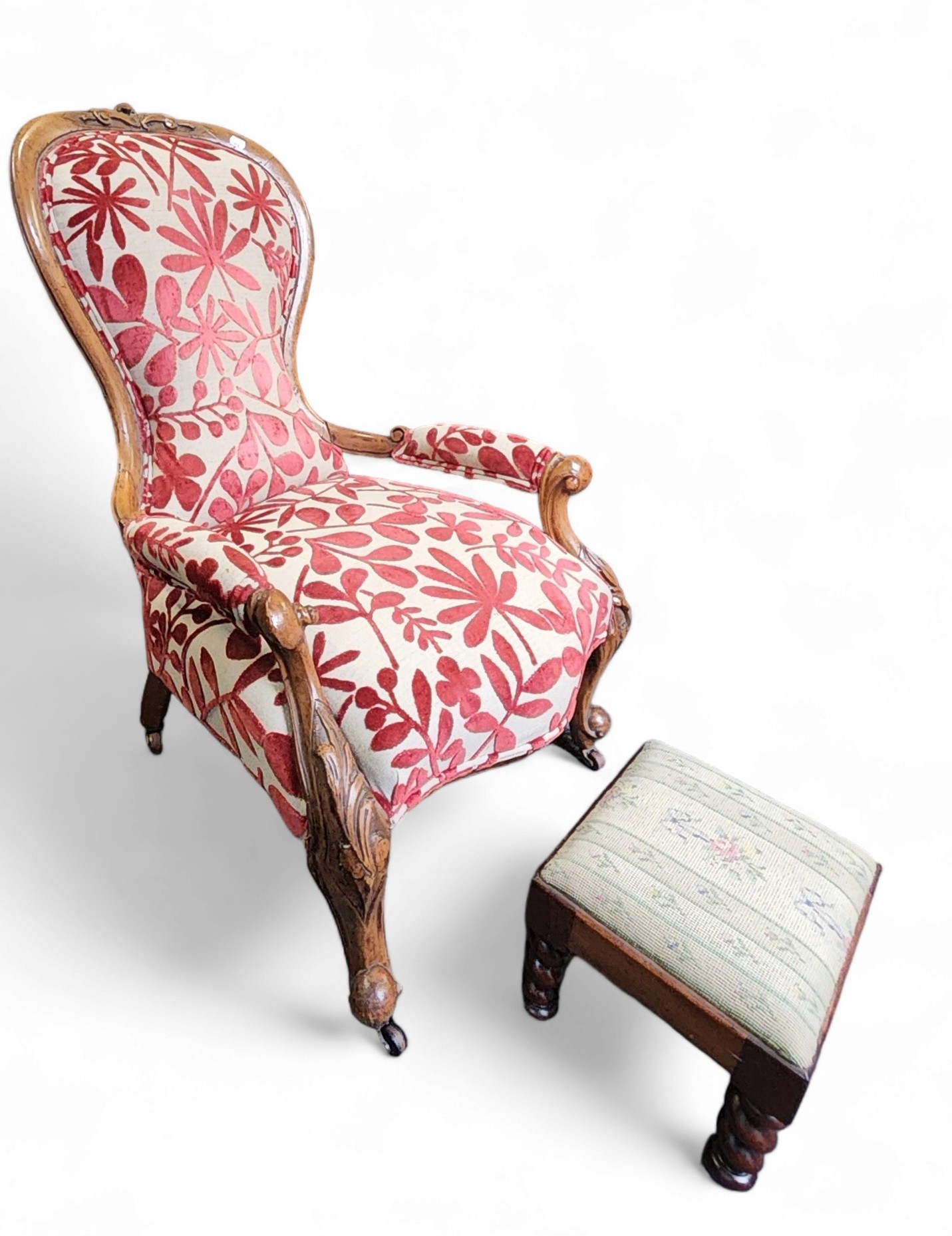 A Victorian walnut spoon back nursing chair, foliate carved scroll, c.1870; a Victorian square footstool, spirally turned legs, c.1860