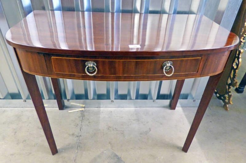 19TH CENTURY MAHOGANY SIDE TABLE WITH SHAPED FRONT & SINGLE DRAWER ON SQUARE SUPPORTS, LENGTH 94CM