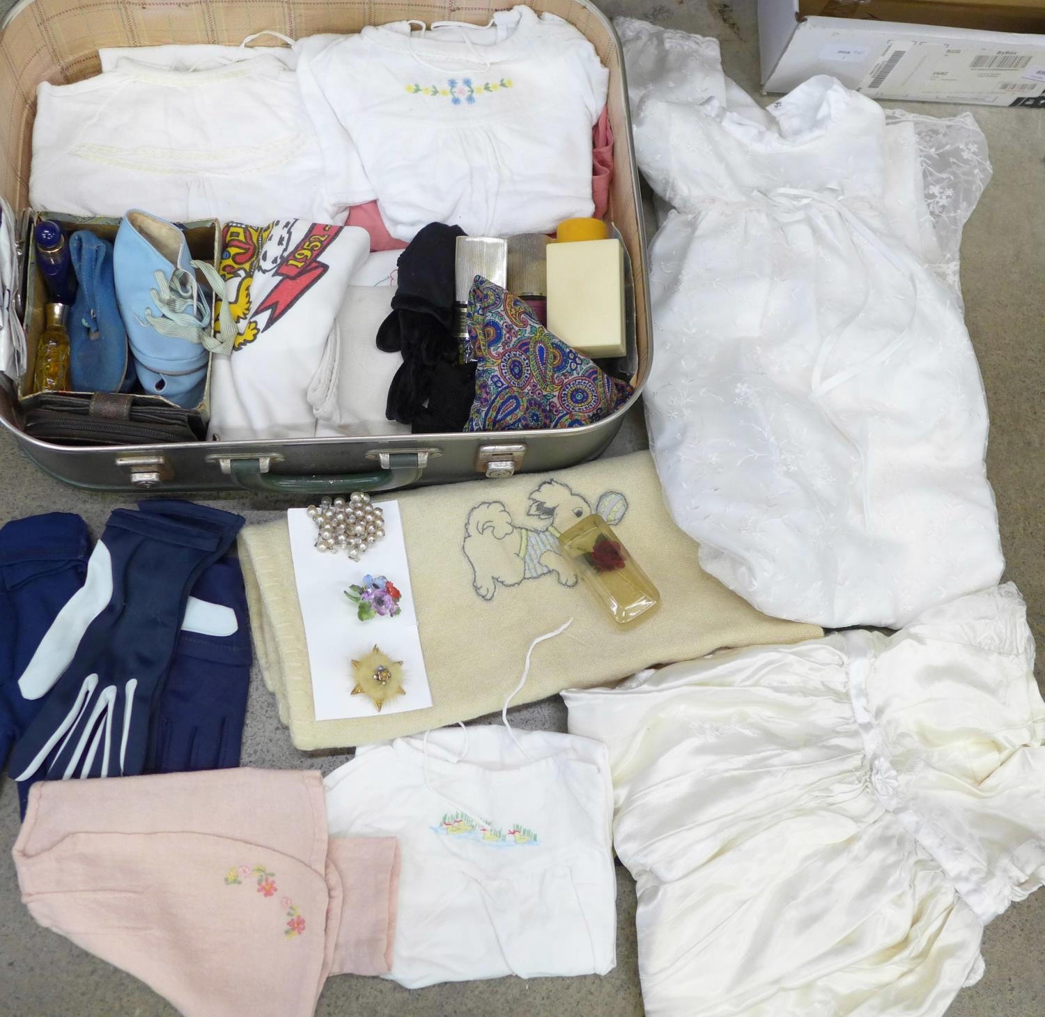 A suitcase containing clothing, babywear, gloves, Christening gowns, etc.