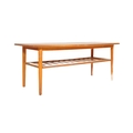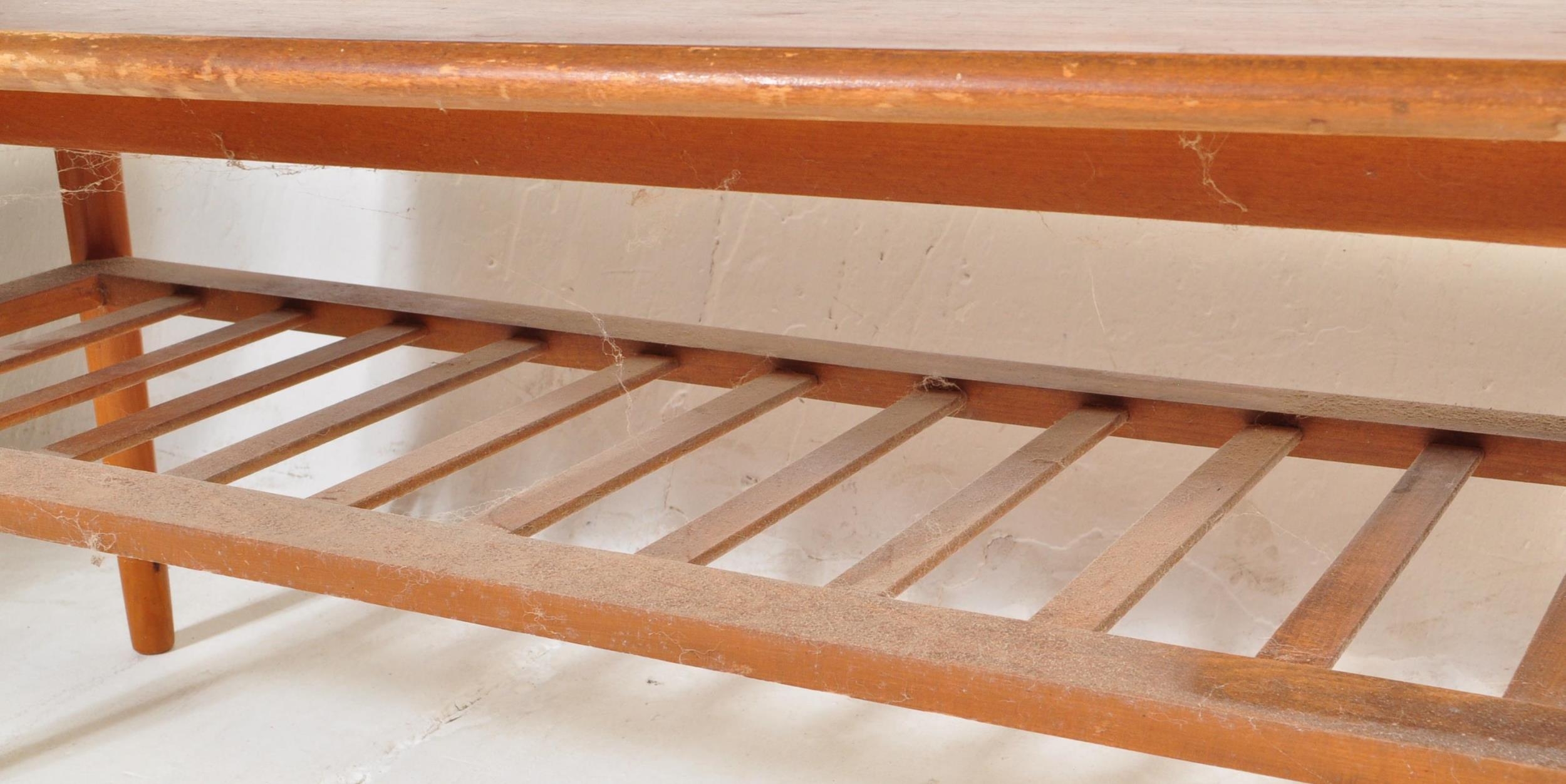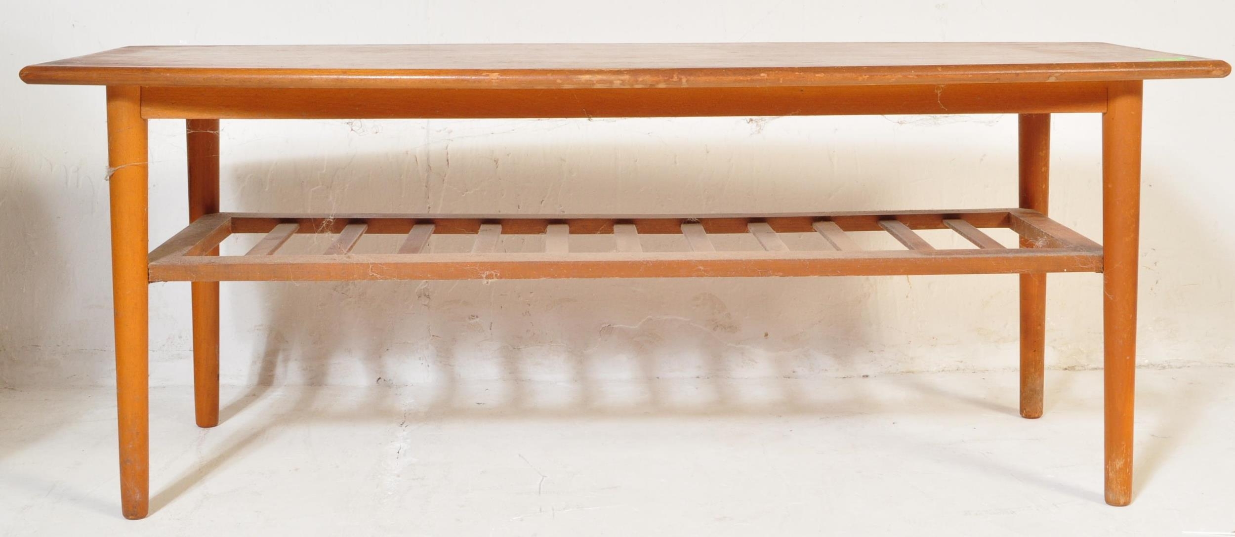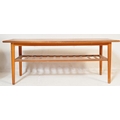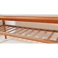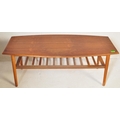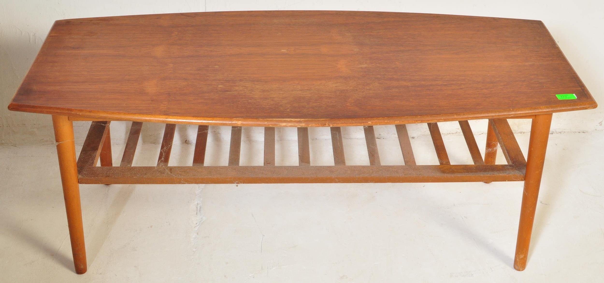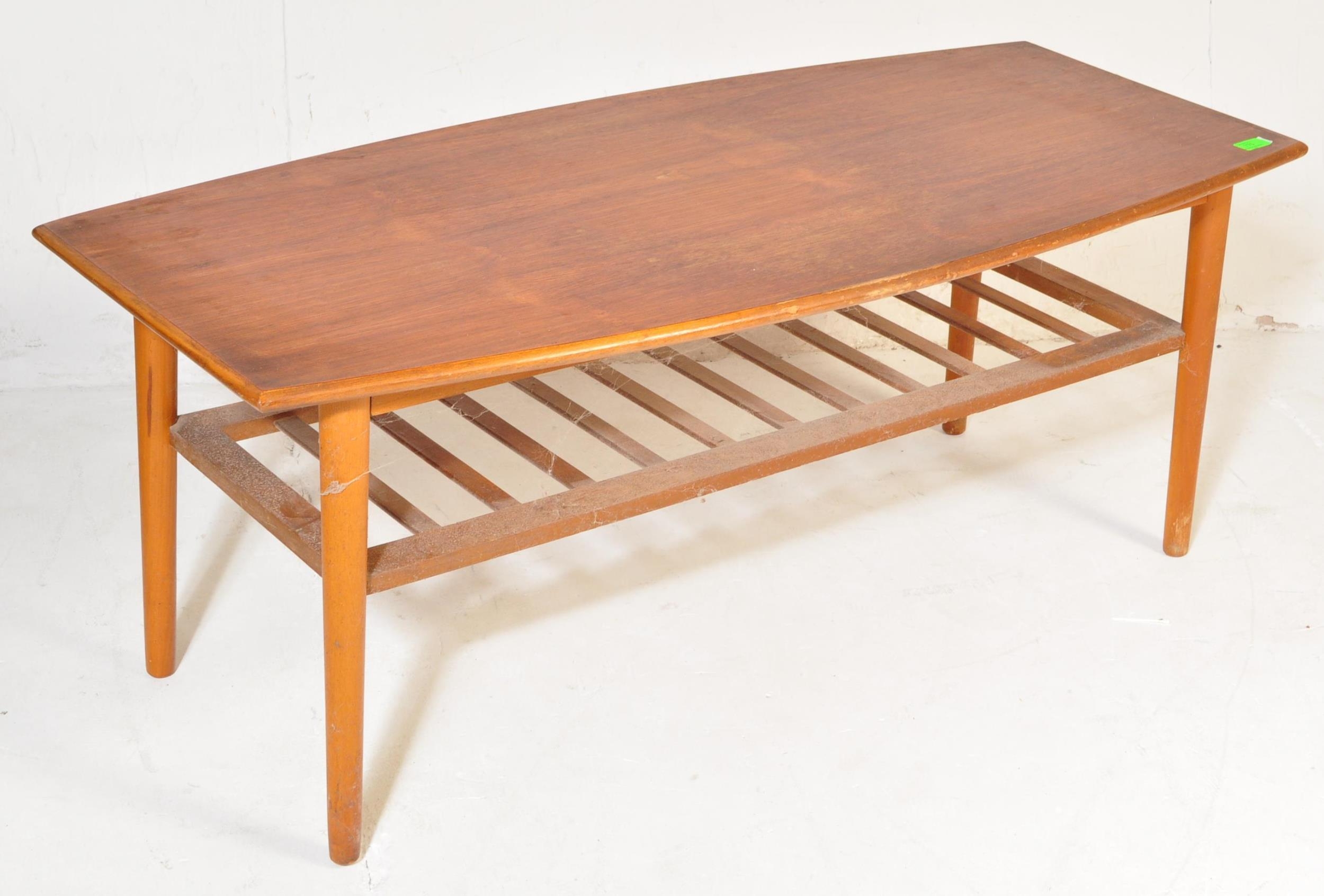 A vintage retro mid 20th century teak surfboard coffee table having a shaped top with rail under tier over tapering splayed supports. Measures approx; 47cm x 120cm x 56cm.