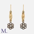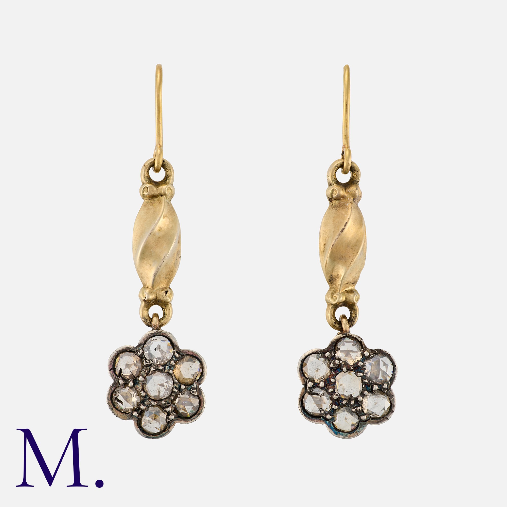 A Pair of Antique Rose Diamond Earrings in yellow gold and silver. Each set with seven rose cut diamonds, with twist drop above. Shepherd's crook fitting.
