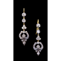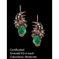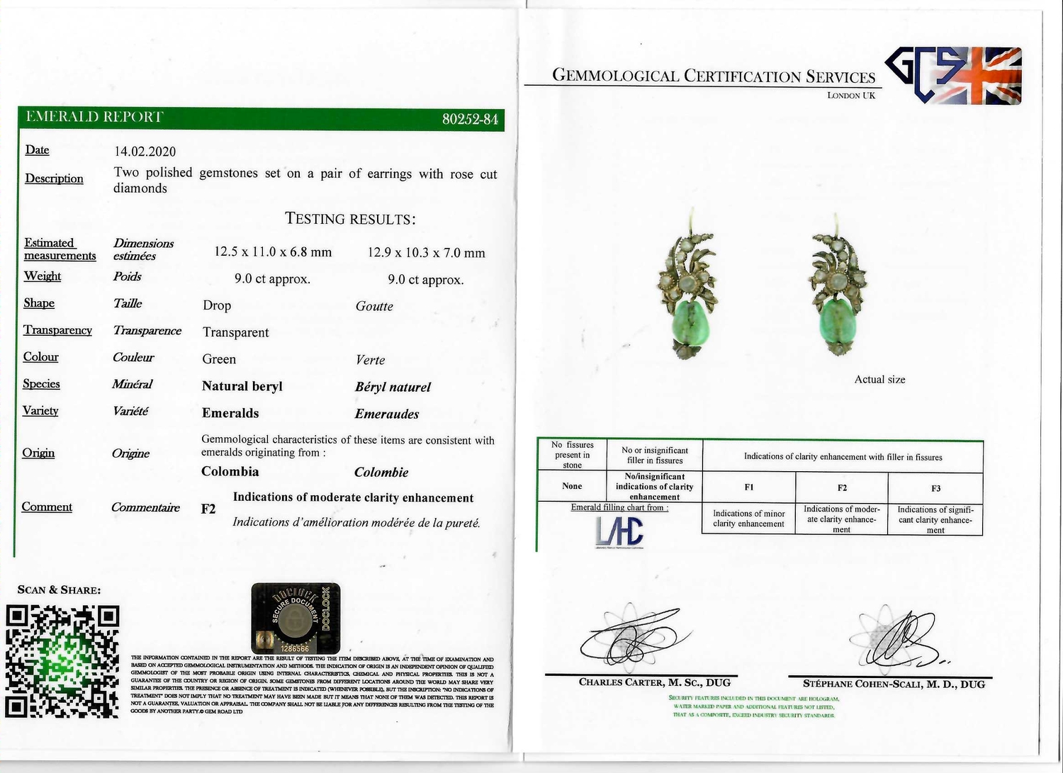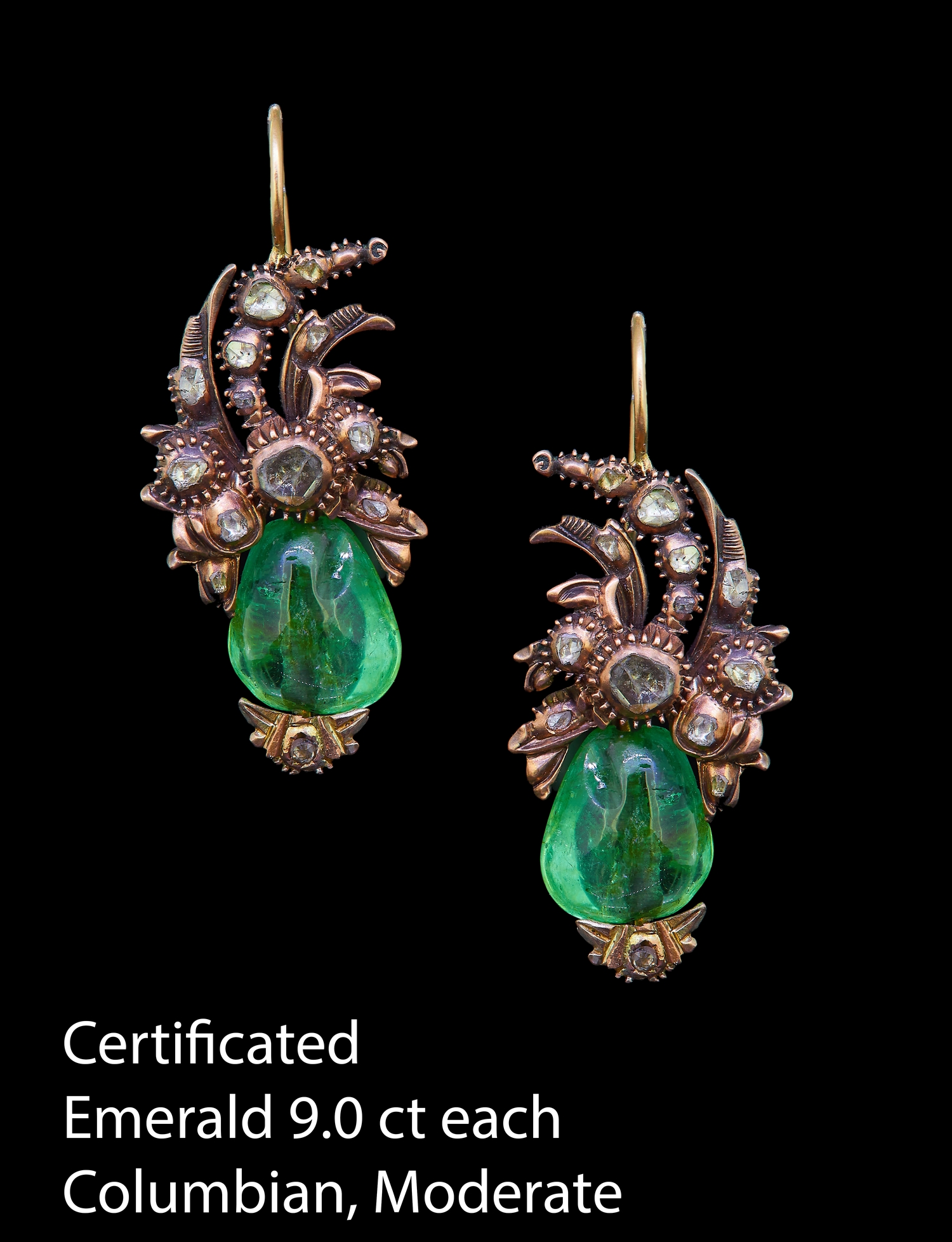 ANTIQUE PAIR OF DIAMOND AND EMERALD DROP EARRINGS, of floral design. The tops set with diamonds totalling approx. 1 ct. The middle set with an emerald each totalling approx. 11.61 ct. L. 4.1 cm. 11.2 grams. With a fitted box. Accompanied by GCS London report No. 80252-84 stating that the emeralds are natural, colombia origin.
