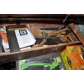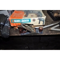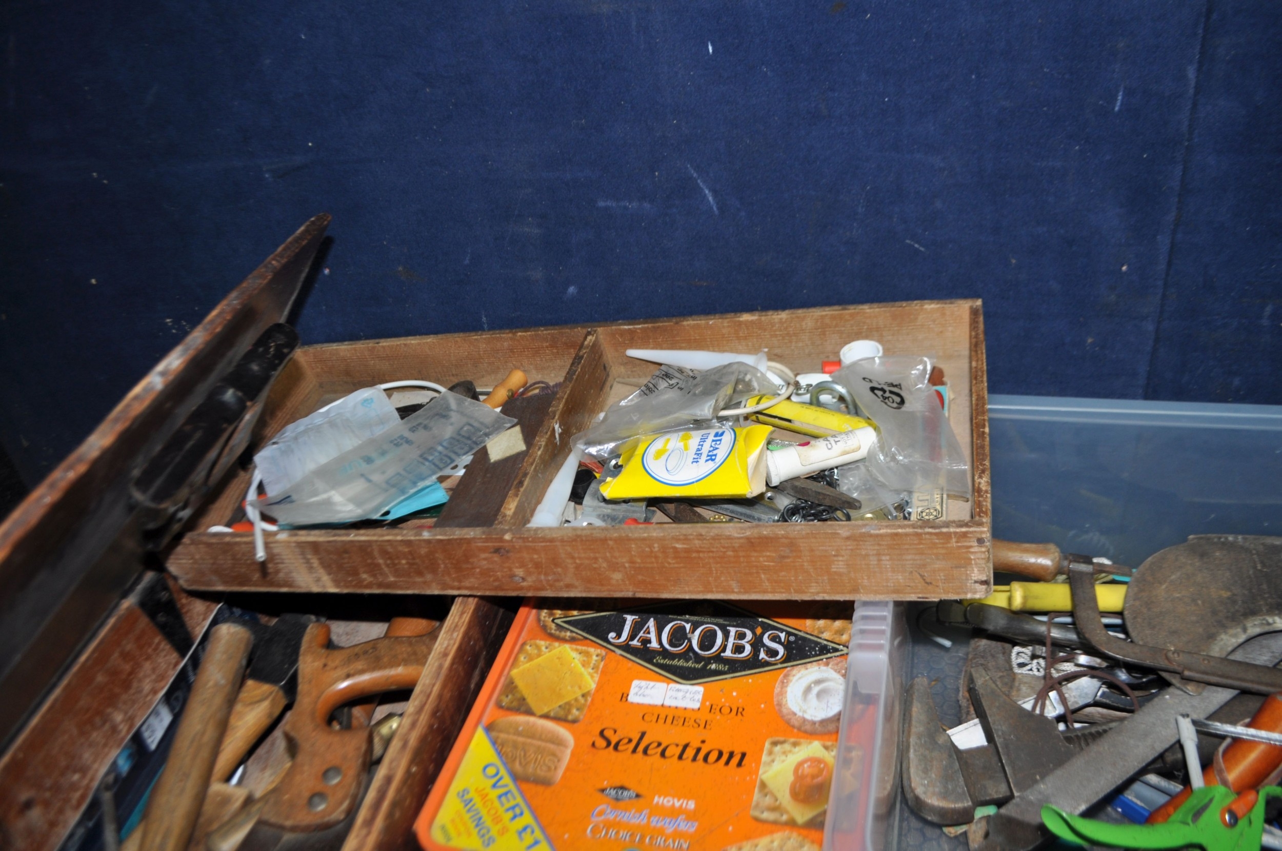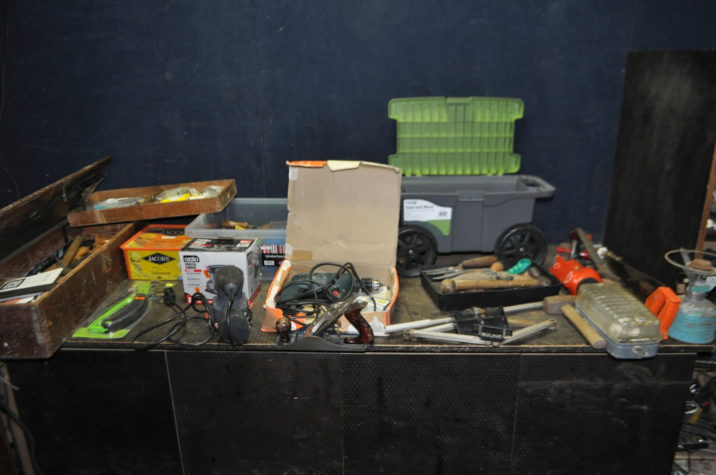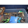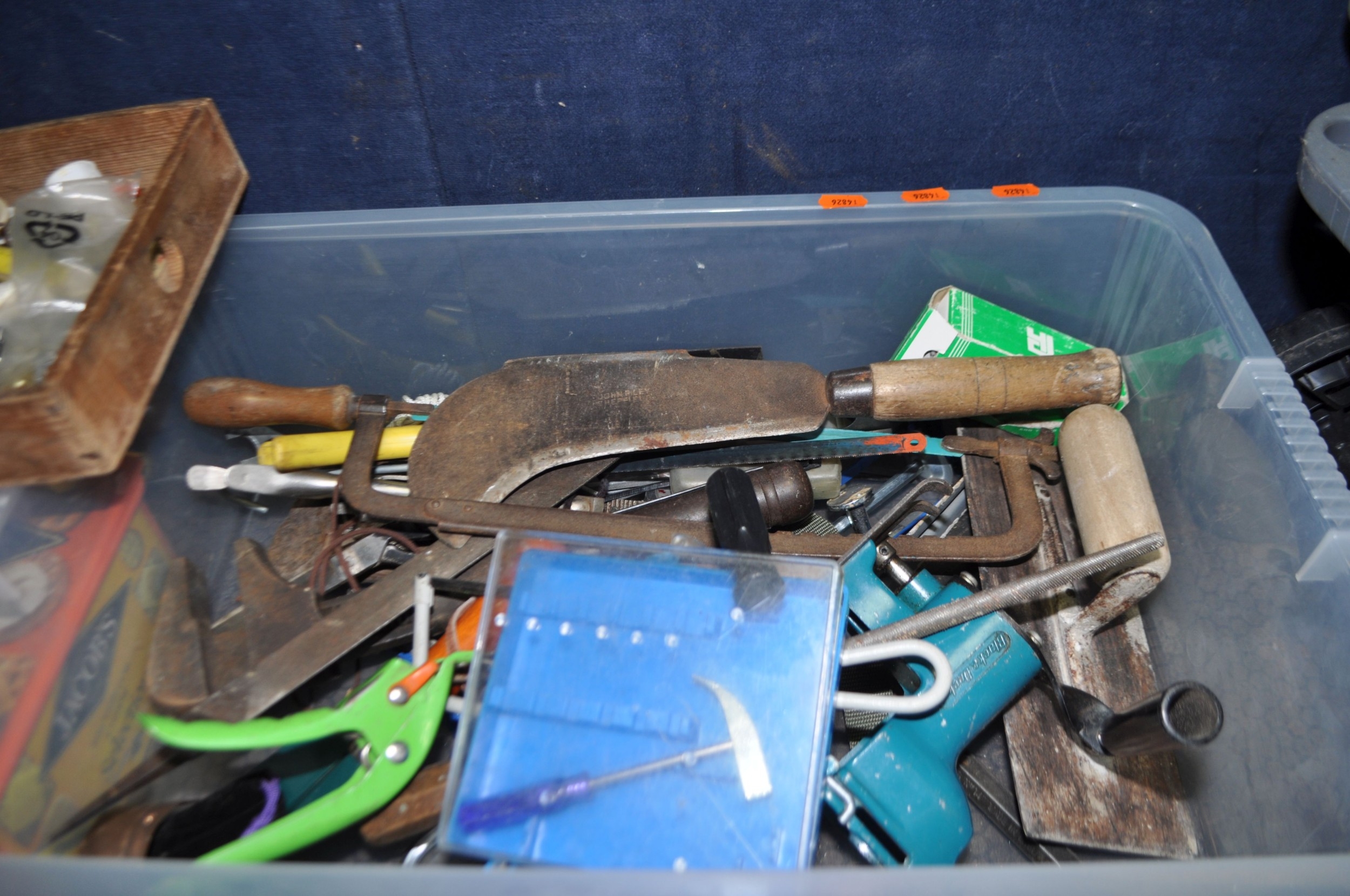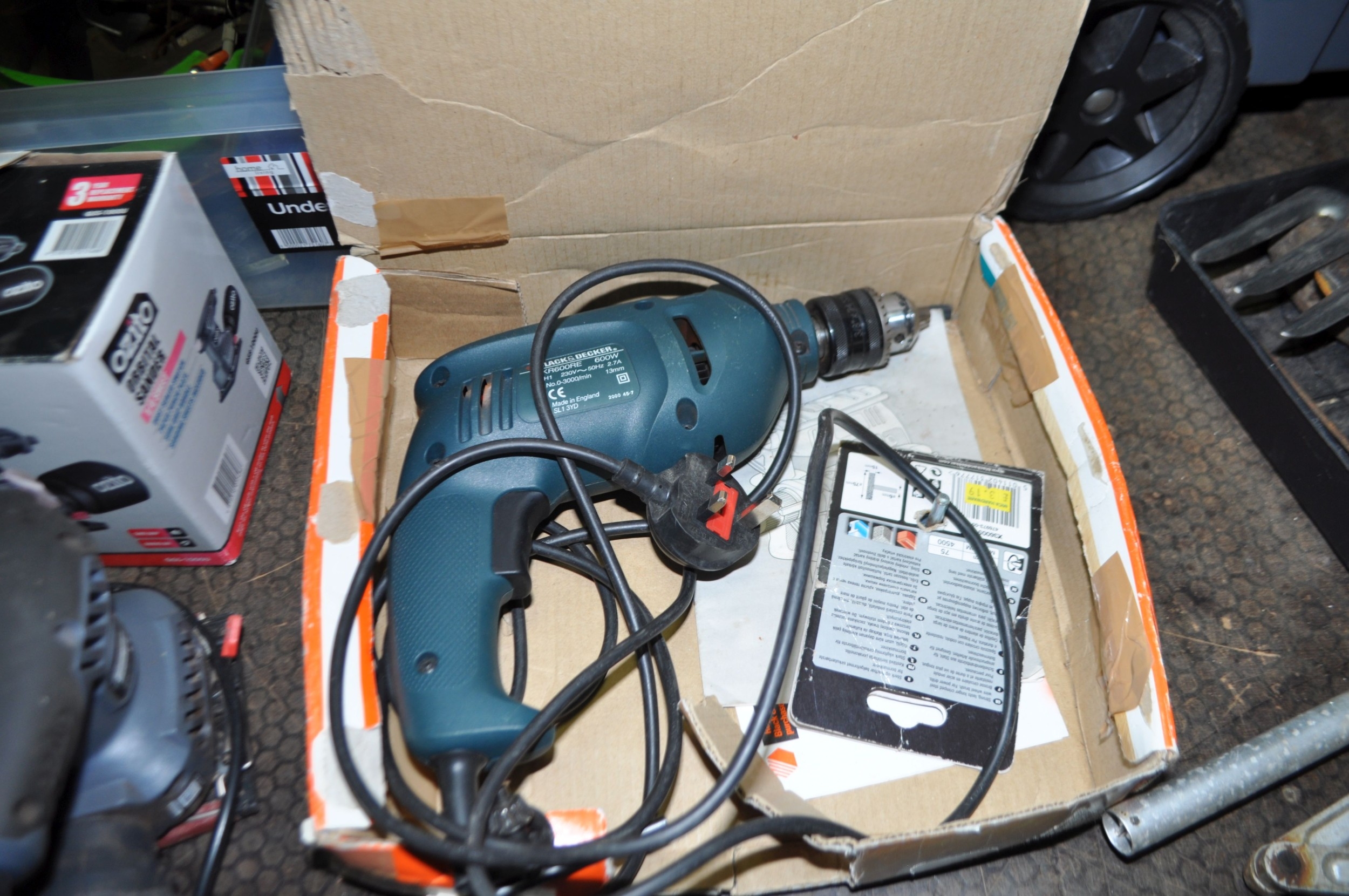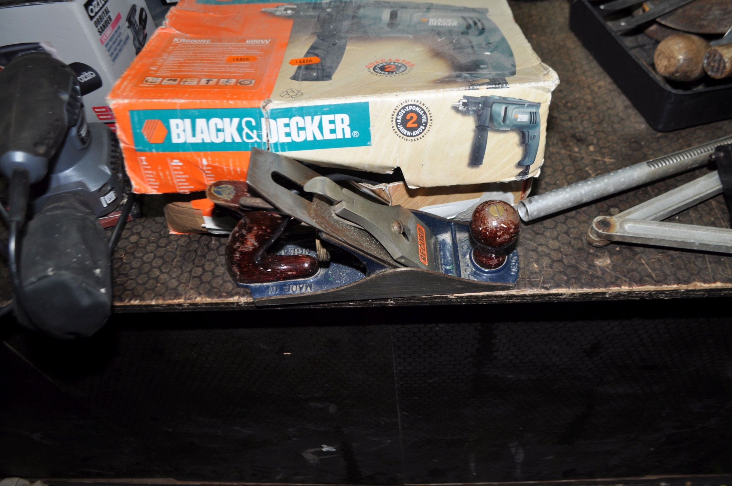 FOUR BOXES CONTAINING TOOLS including a Black and Decker drill, an Ozito sander (both PAT pass and working), a Record No.4 plane, saws, hatchets, hammers, marking gauges, gardening hand tools and a Qualcast garden vac (PAT pass and working) etc