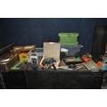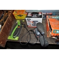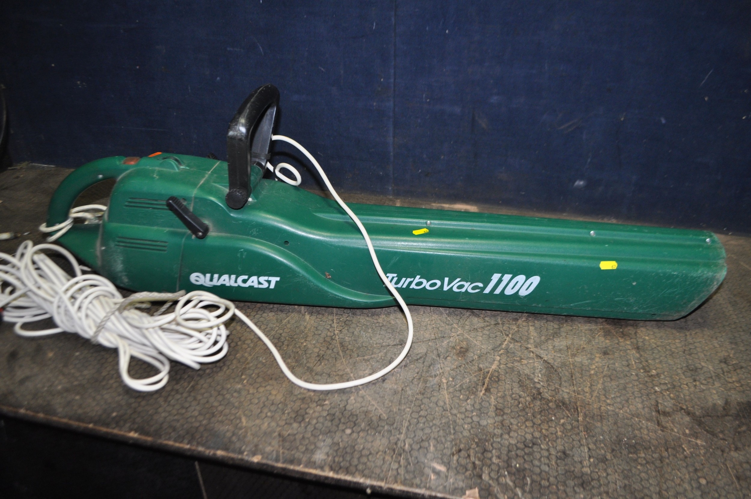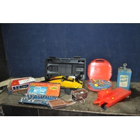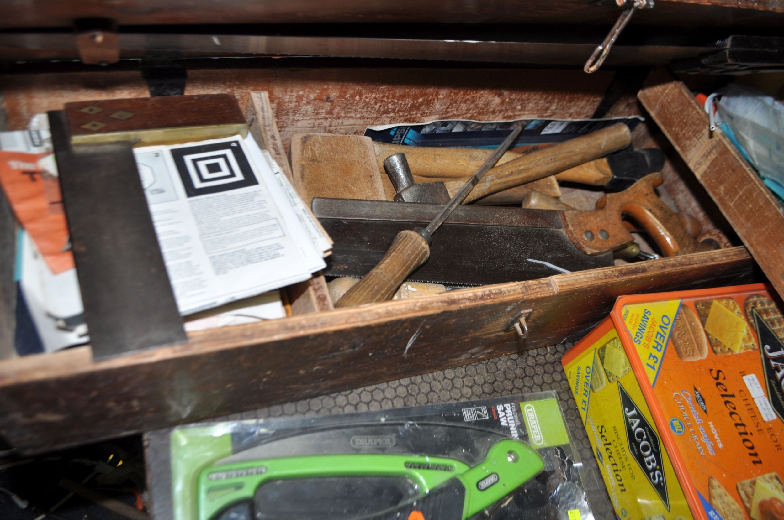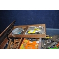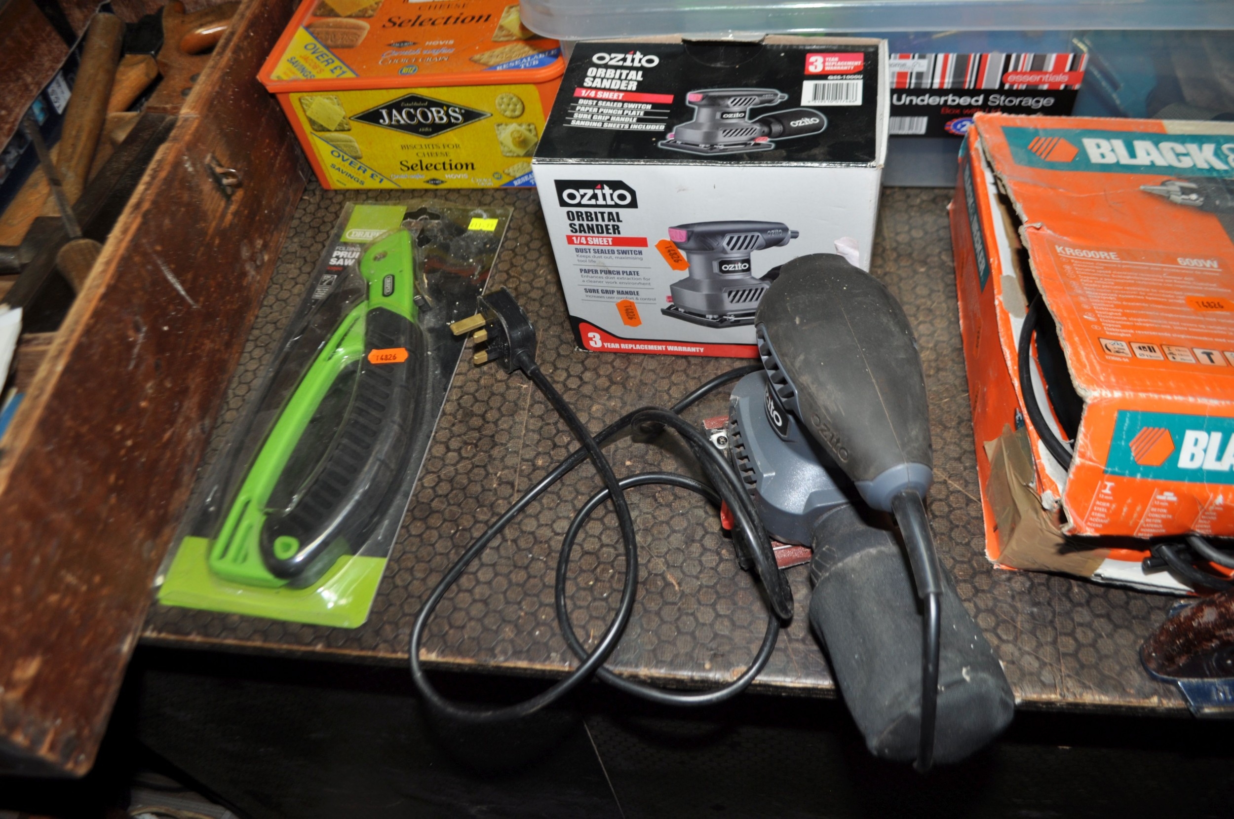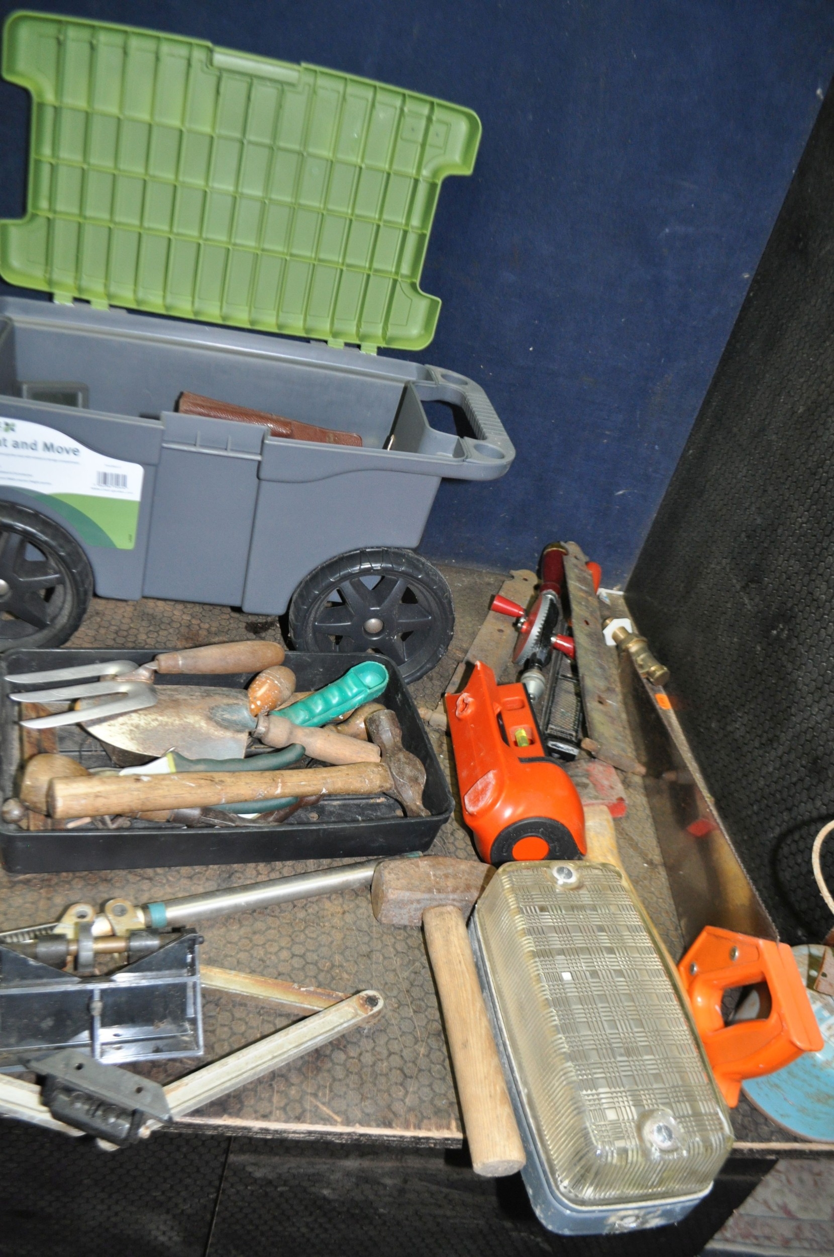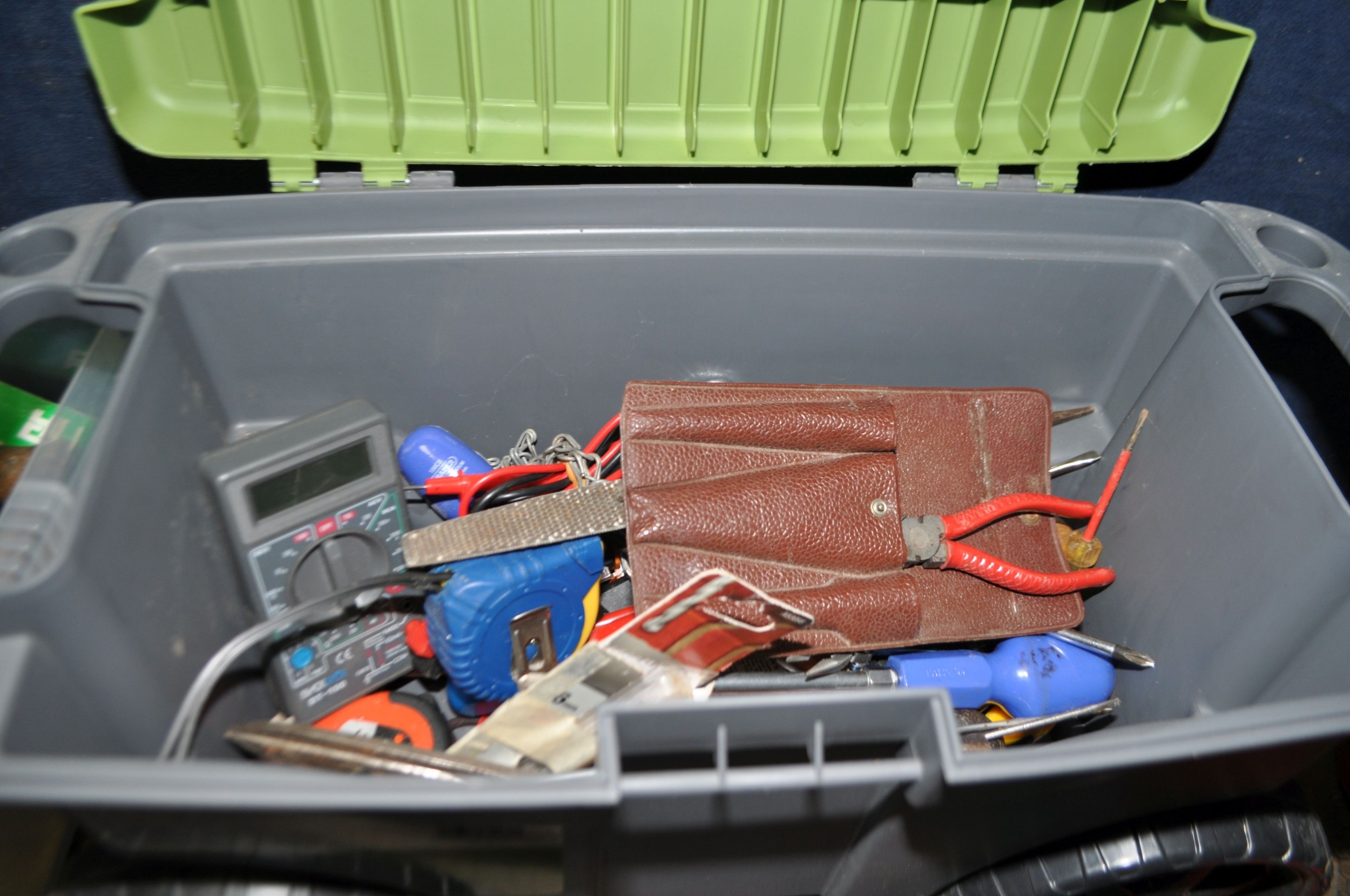 FOUR BOXES CONTAINING TOOLS including a Black and Decker drill, an Ozito sander (both PAT pass and working), a Record No.4 plane, saws, hatchets, hammers, marking gauges, gardening hand tools and a Qualcast garden vac (PAT pass and working) etc